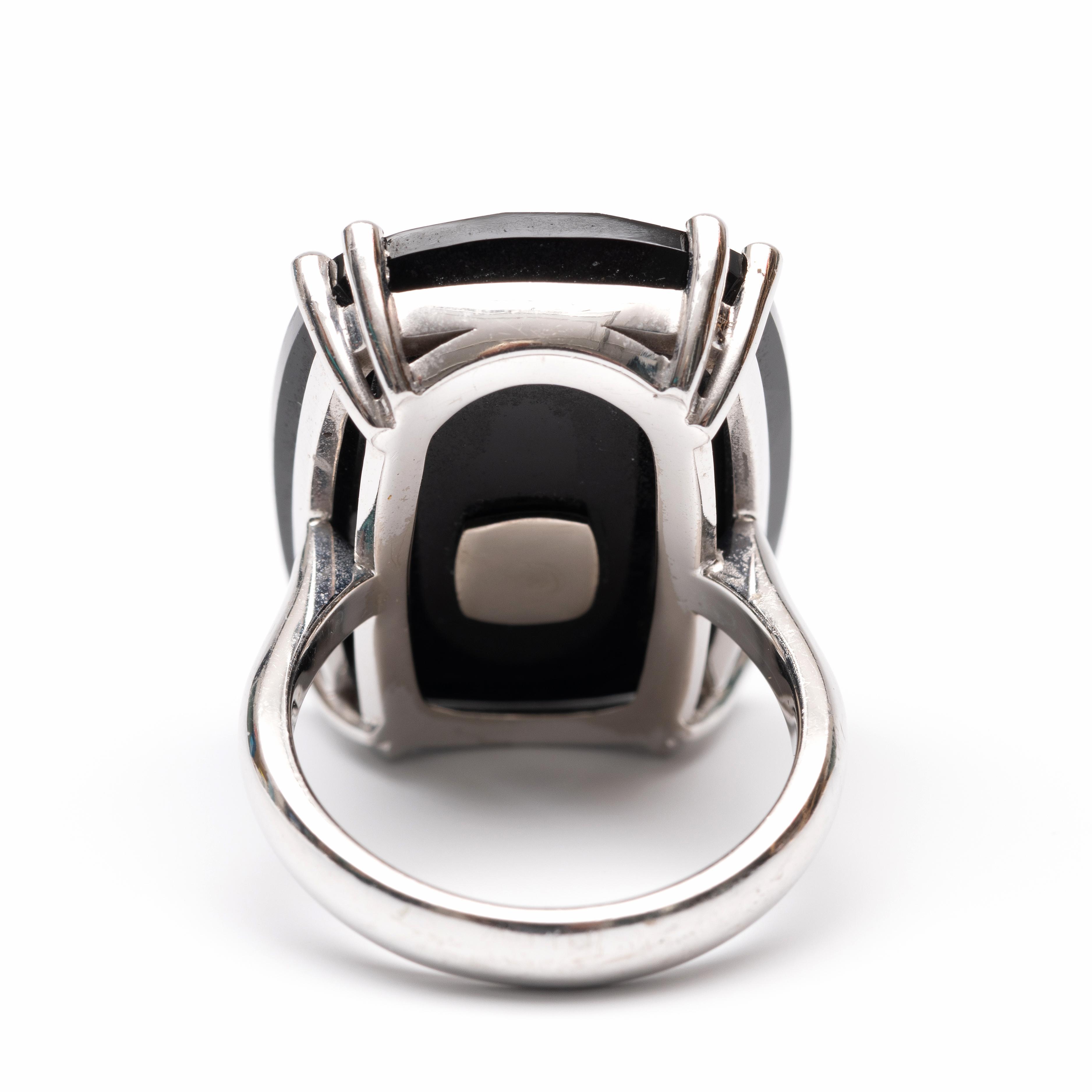 Charles Greig, 18 k. white gold ring. Set with a checkerboard cut onyx on which a white gold applique in the shape of a bee, set with brilliant cut diamonds with a total weight of approx. 0.65 ct.