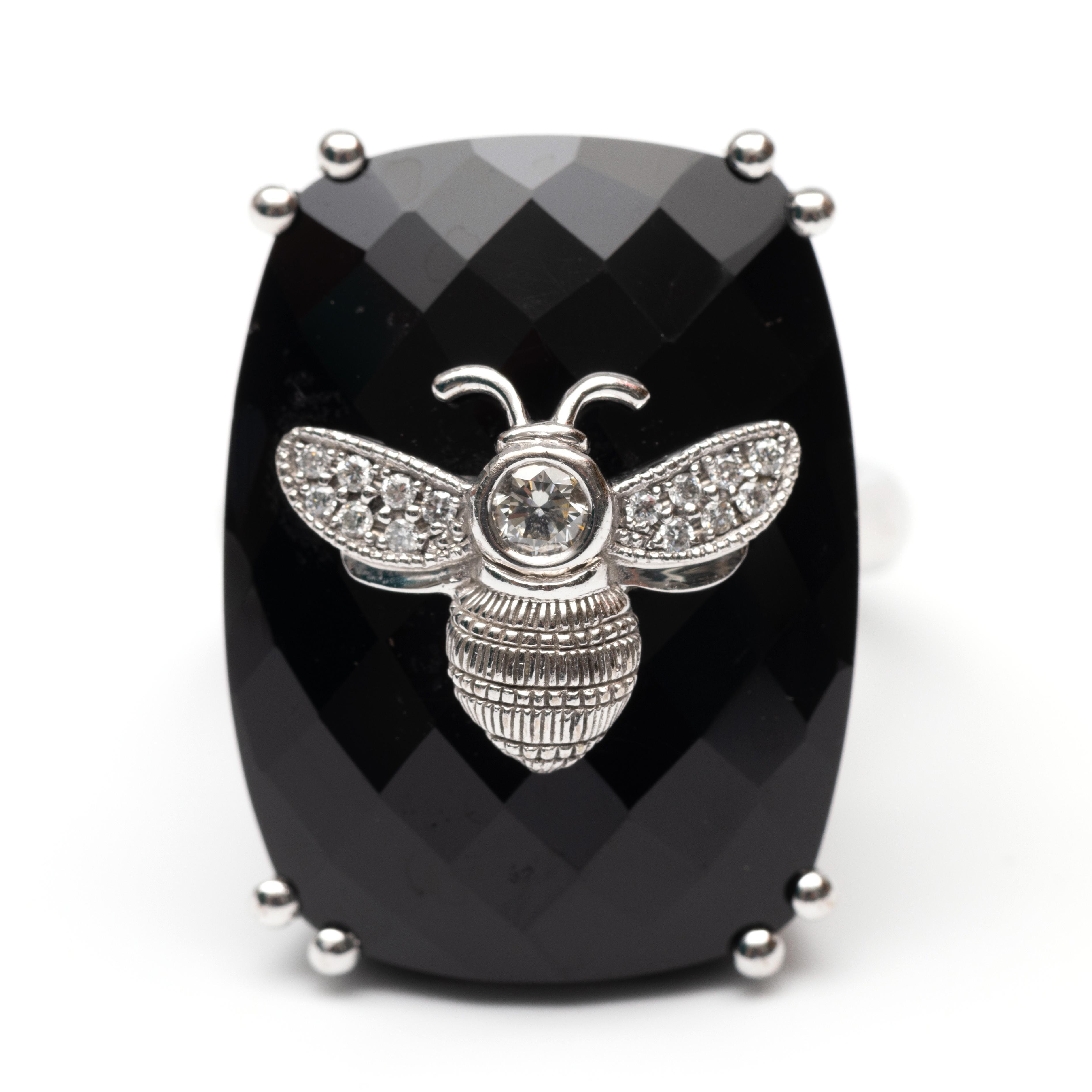 Bezet met een checkerboard geslepen onix waarop een witgouden applique in de vorm van een bij, bezet met briljant geslepen diamant met een totaalgewicht van ca. 0.65 ct.