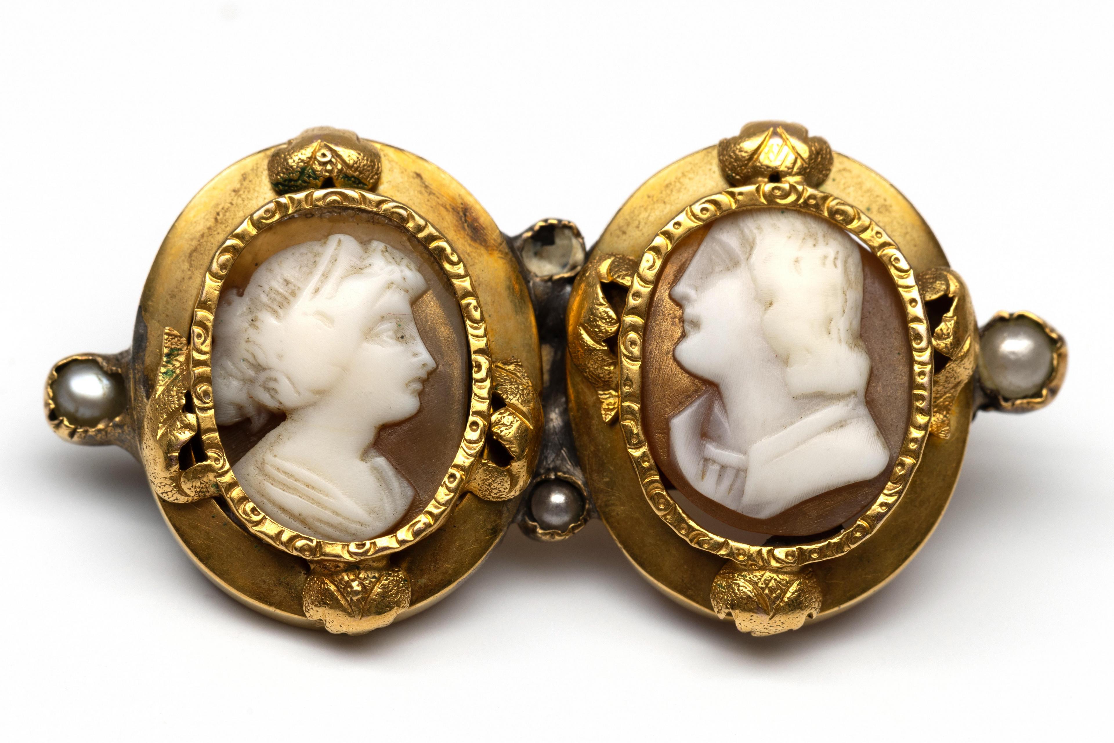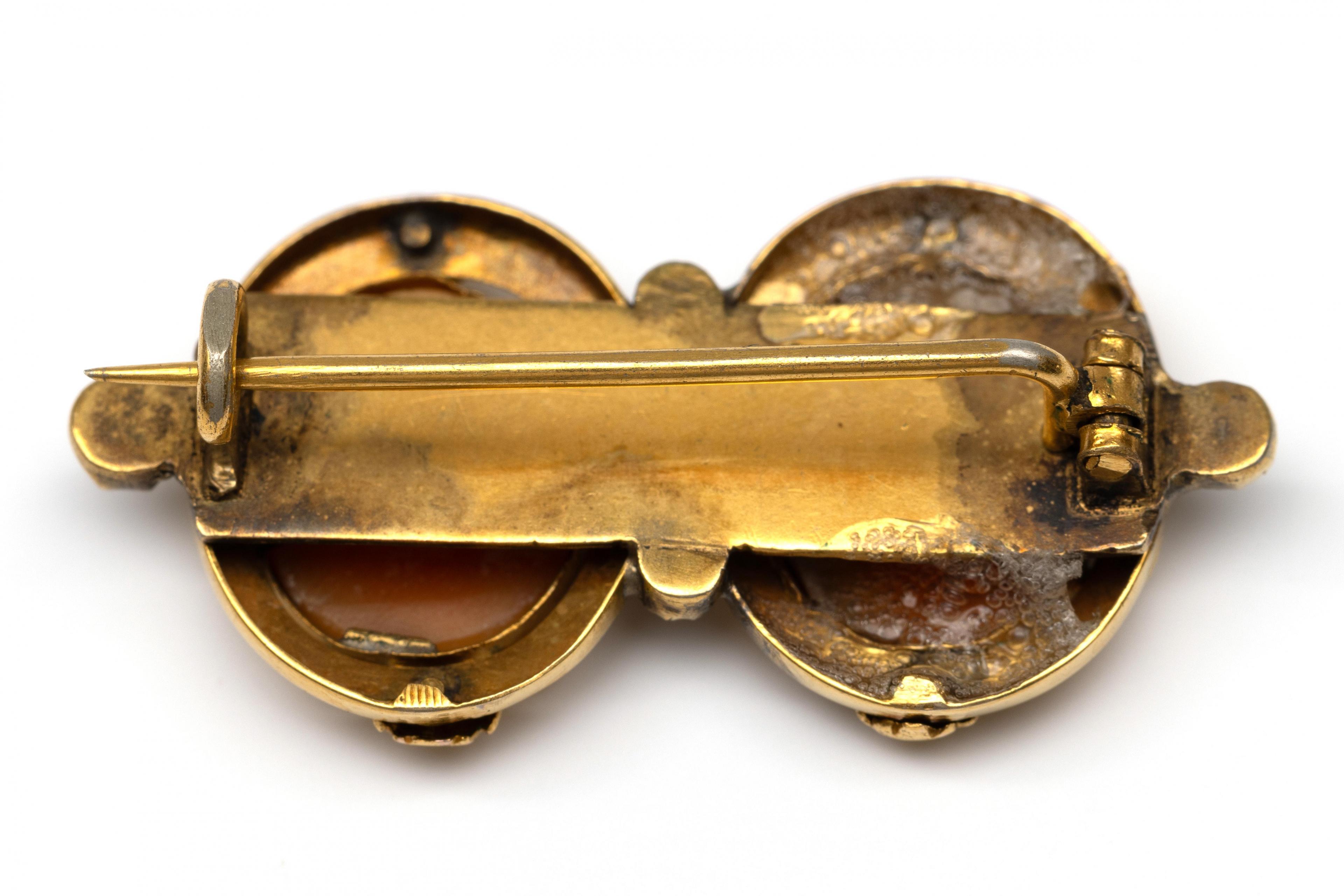 Gold brooch, 19th century. Consisting of two oval cartouches, containing a shell cameo of a lady and gentleman looking at each other. The bezel decorated with leaf motifs and set with split-pearls.