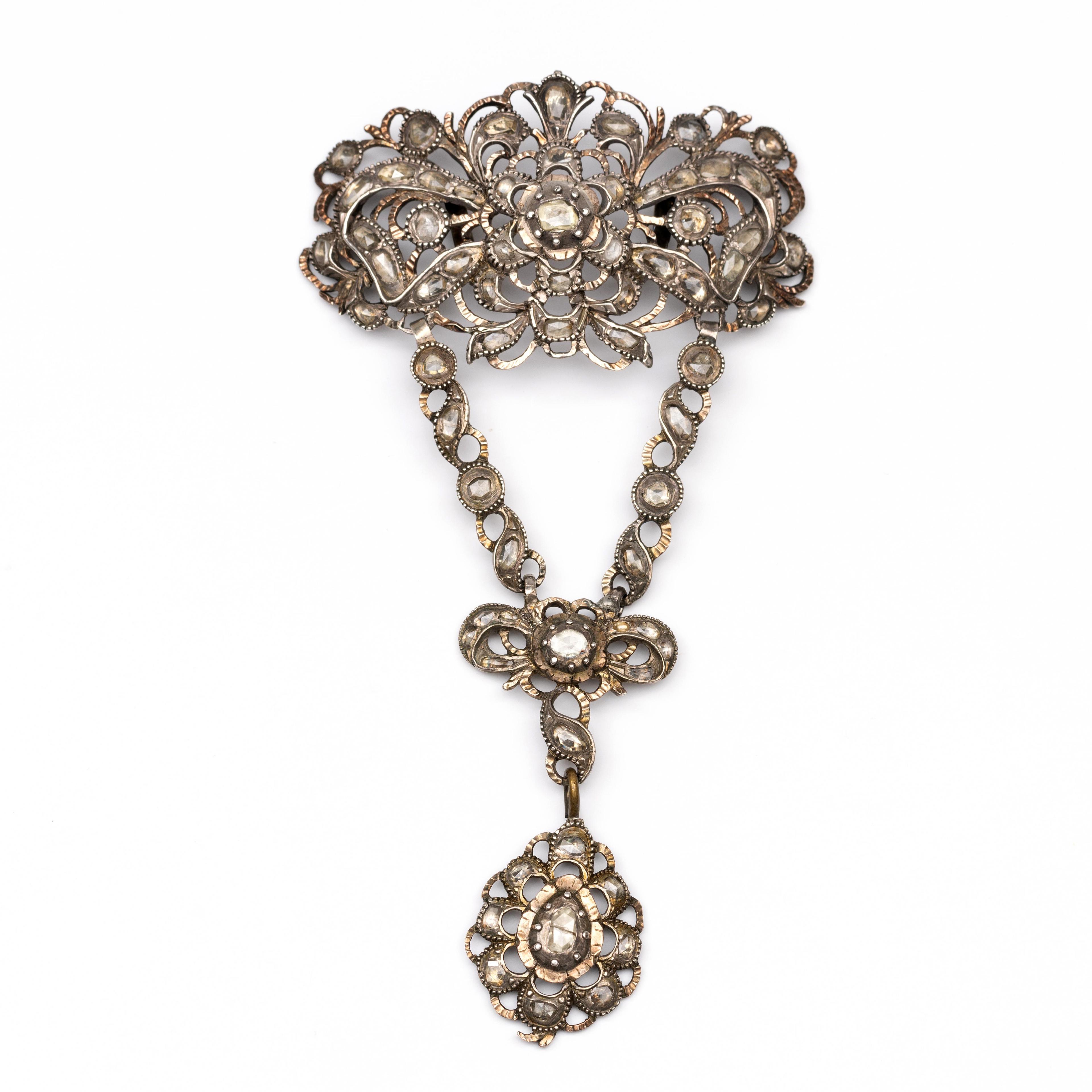 Bestaande uit een ovaal ajour gezaagd ornament waarop een strik en rozet, waaronder twee 'linten' samenkomend in een kleiner strikvormig ornament met druppelvormige hanger. Het geheel bezet met roosgeslepen diamant