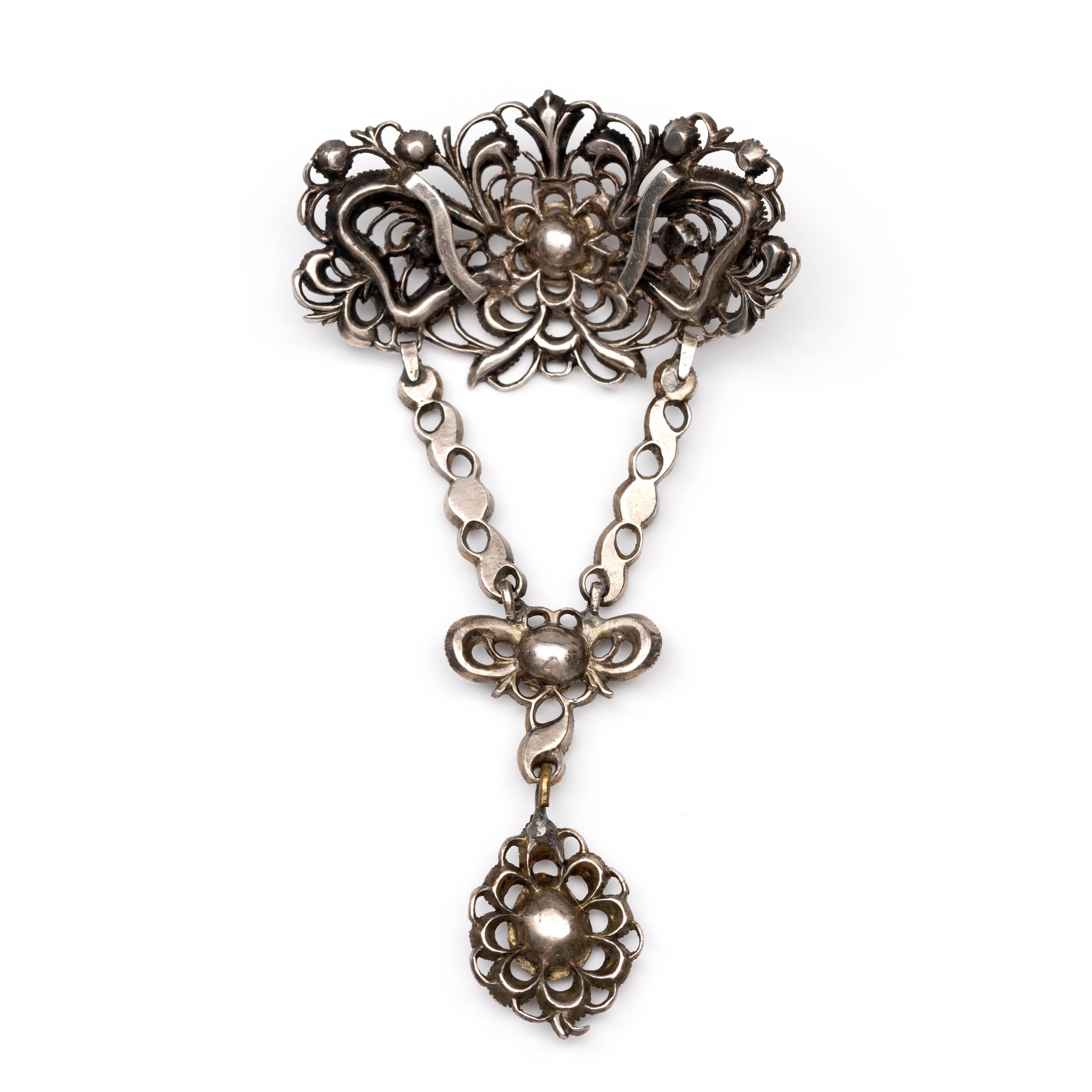 Silver corsage pendant. Consisting of an oval-shaped lace cut ornament on which a bow-tie and rosette, below two 'ribbons' meeting in a small bow shaped ornament with a drop shaped pendant. Set with rose cut diamonds