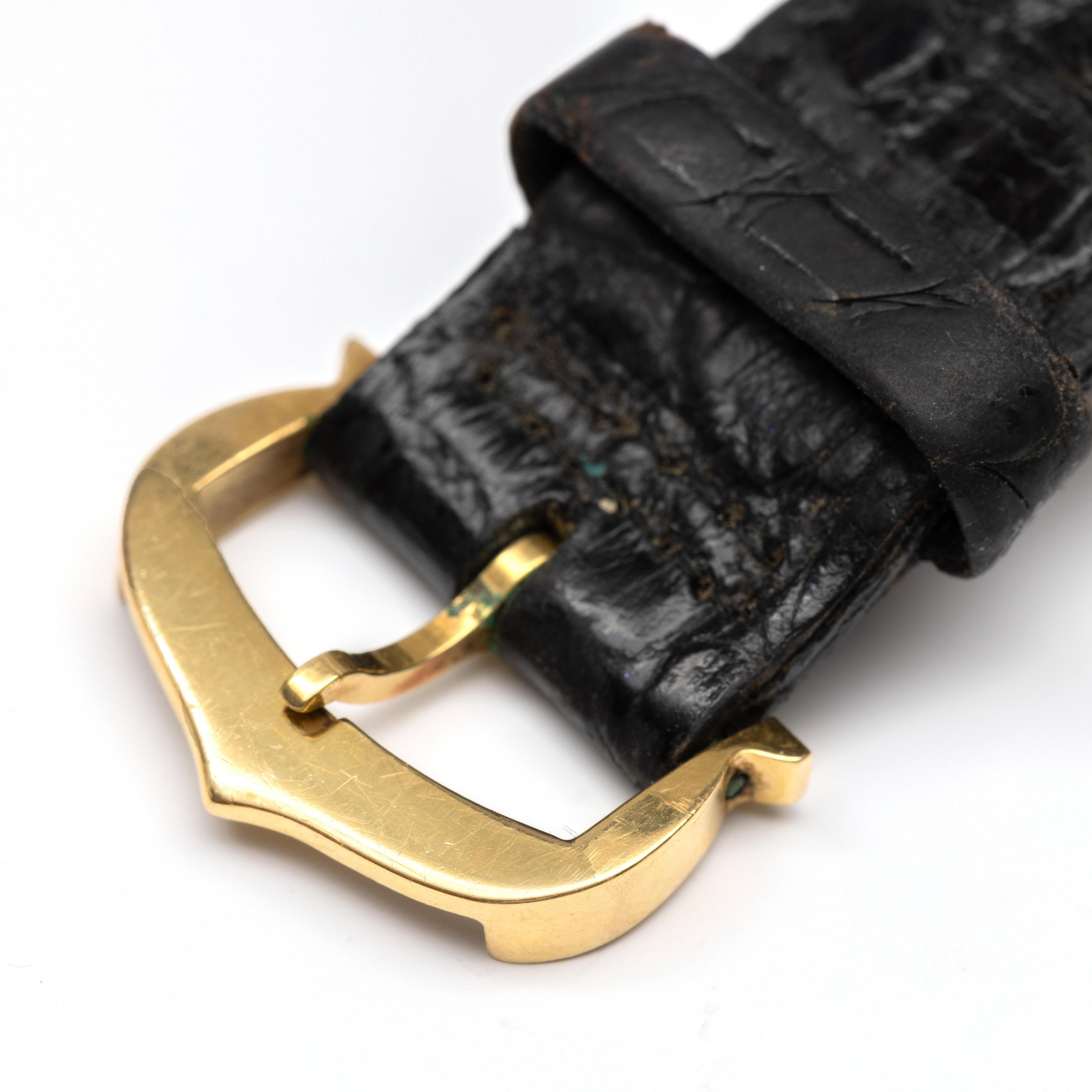 Cartier, 18 k. gold wristwatch, 1970s. Model Cristallor Fabergé Jumbo Ref. 78096, Manual wind. With ivory dial with Roman numerals, signed Cartier and Paris. On a black leather strap with an 18 k. gold buckle.