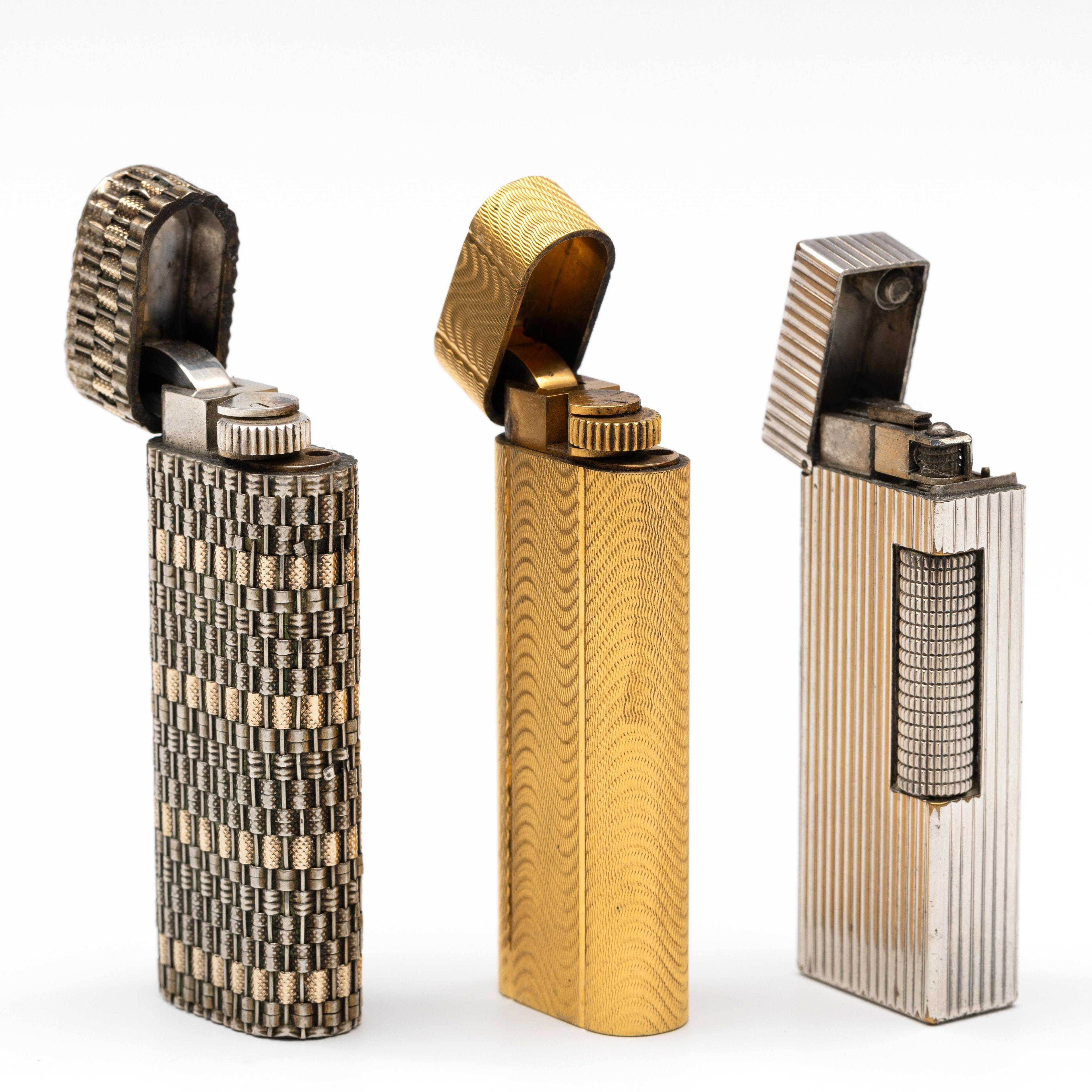 Cartier and Dunhill, three lighters. Cartier, a gold-plated lighter with a guilloche surface with a pattern of waves, the top engraved, Cartier, a silver-plated lighter with a braided pattern with various finishes, and Dunhill, a steel lighter with a vertically ribbed surface.