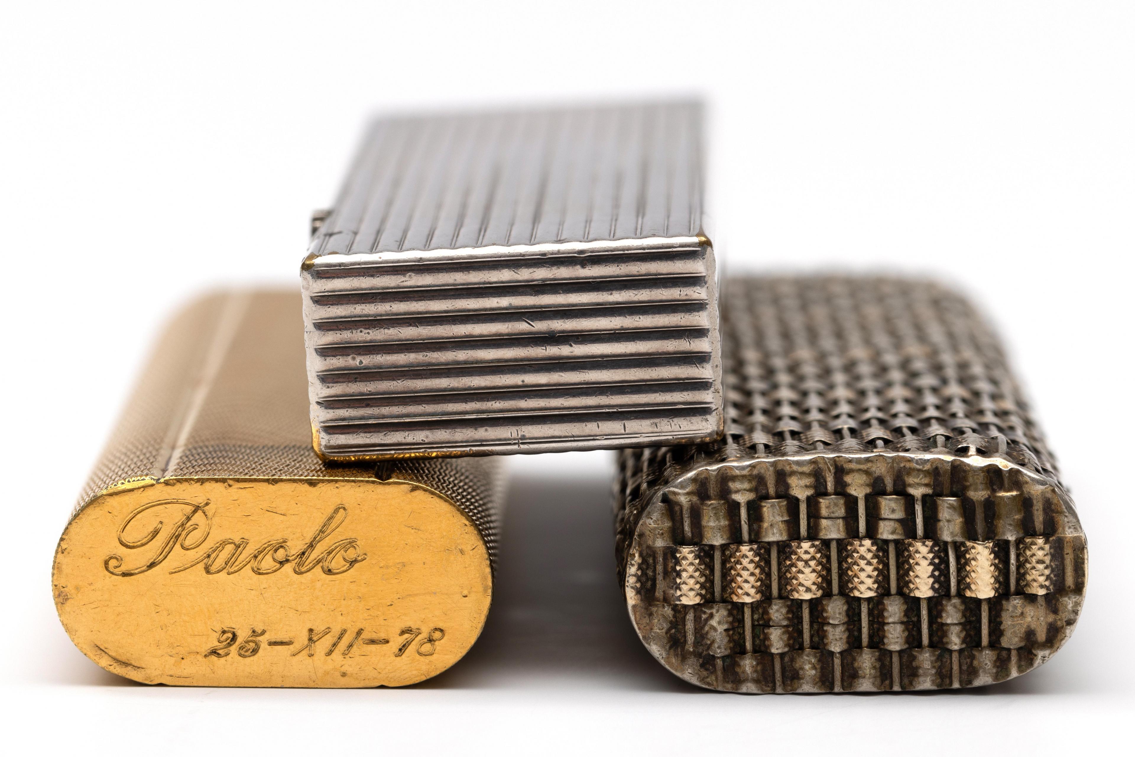 Cartier, vergulde aansteker met geguillocheerd oppervlak met golfpatroon, de bovenzijde gegraveerd, Cartier, verzilverde aansteker met patroon van vlechtwerk met diverse afwerkingen en Dunhill, stalen aansteker met verticaal geribbeld oppervlak