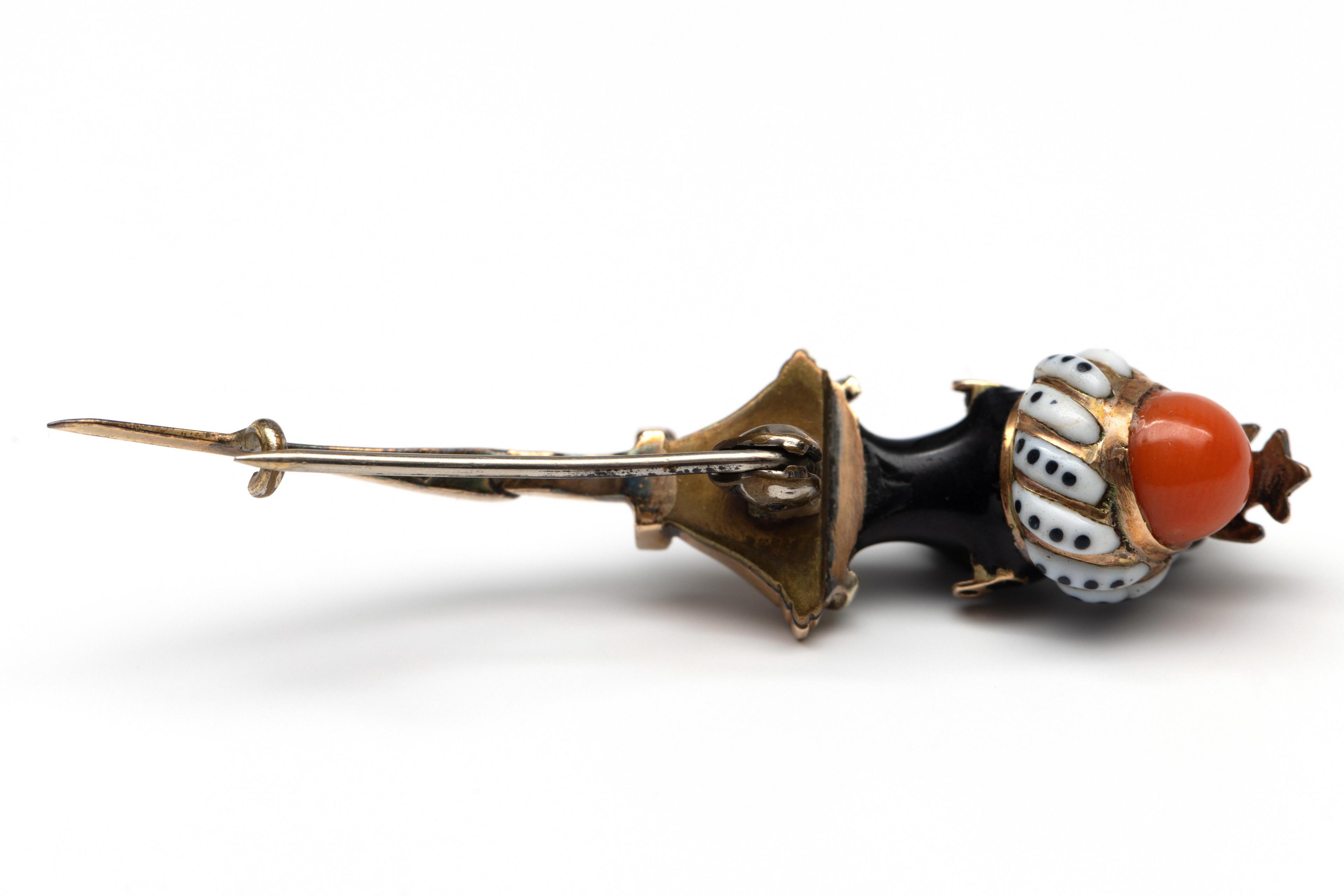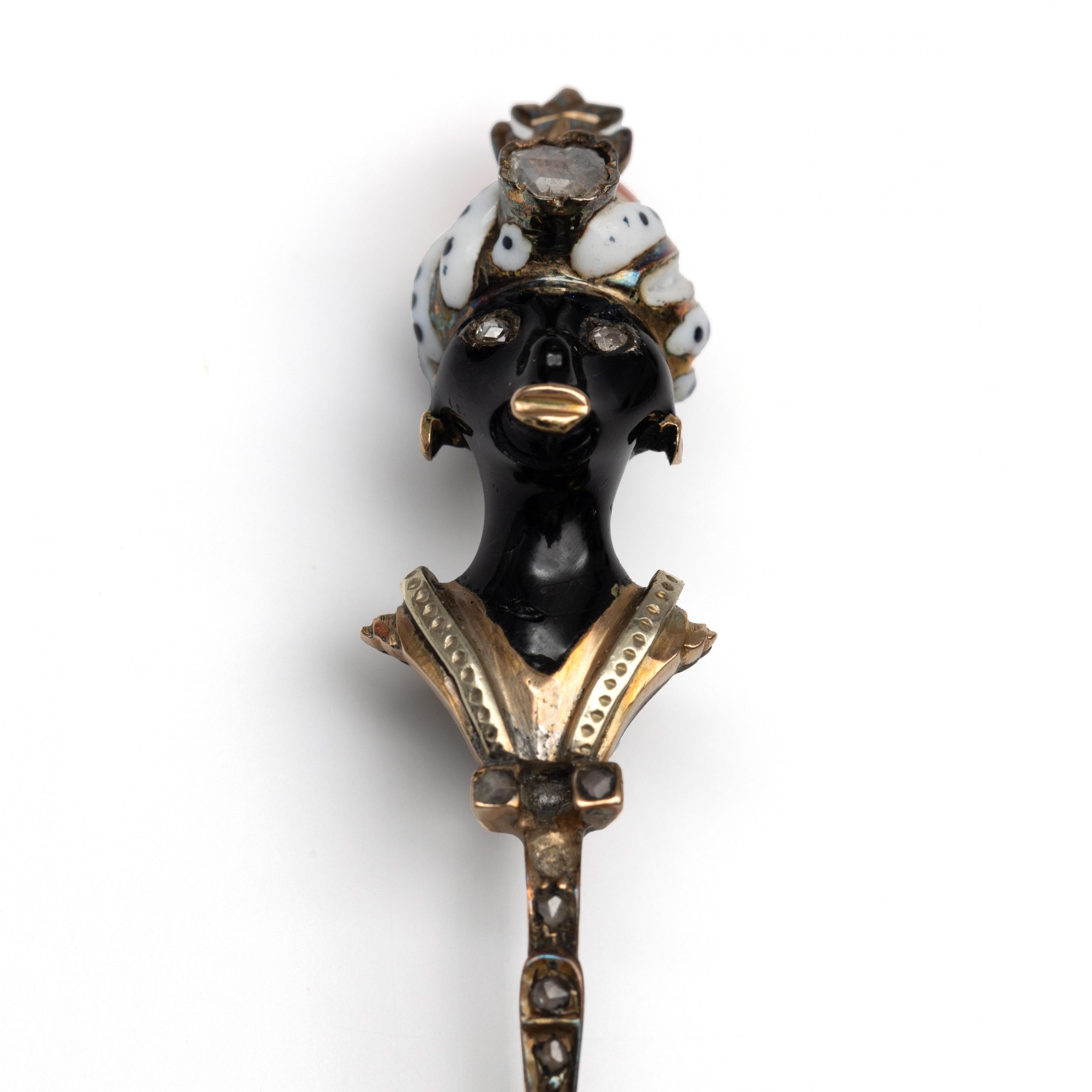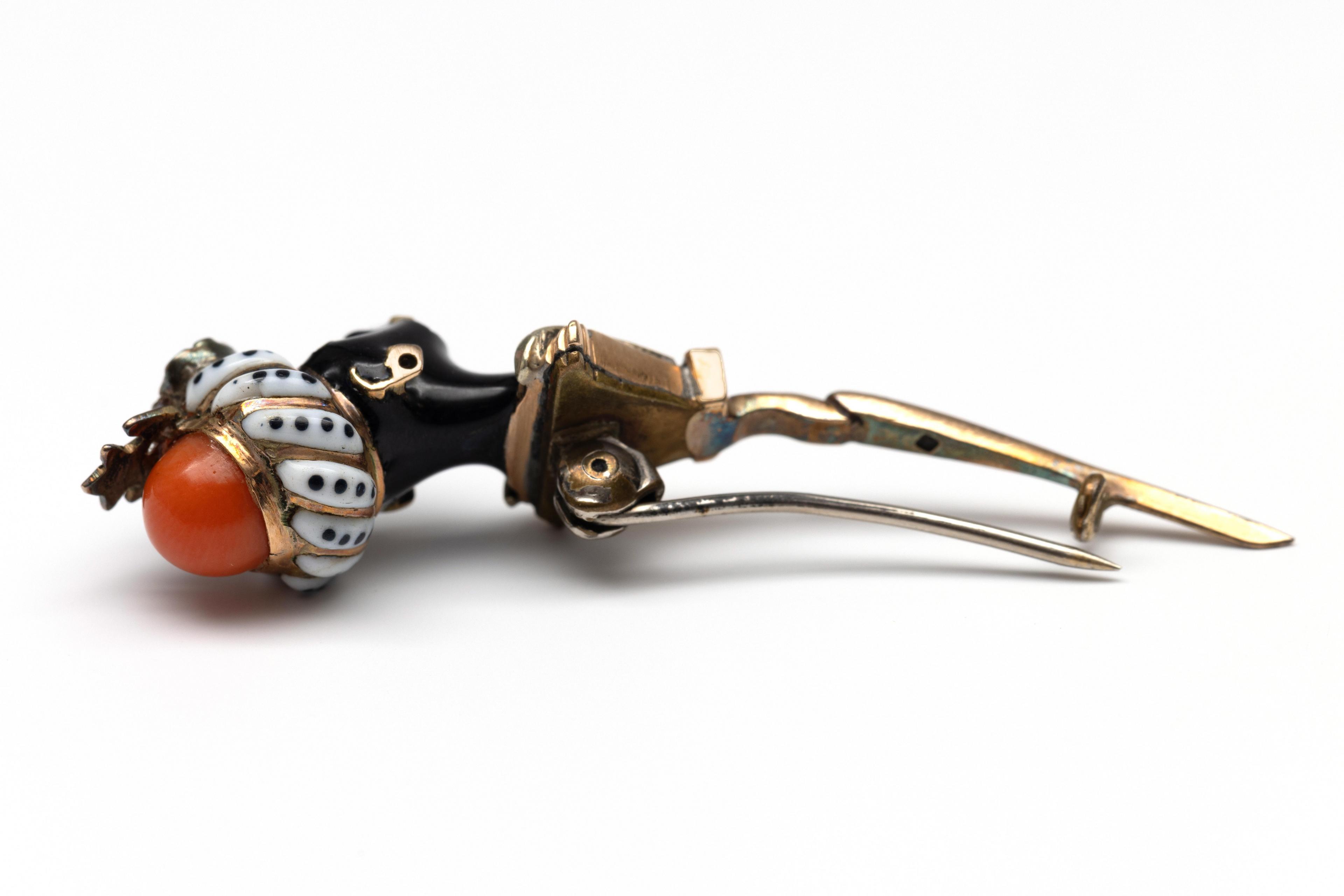 Met zwart geëmailleerd morenkopje met gouden jas en oorbellen en wit geëmailleerde tulband met zwarte stippen en bezet met een cabochon geslepen koraal. De ogen, tulband en jas bezet met roosgeslepen diamant. De brochering onedel. Hierbij een vergulde 19e -eeuwse broche in de vorm van een komeet, bezet met paars paste