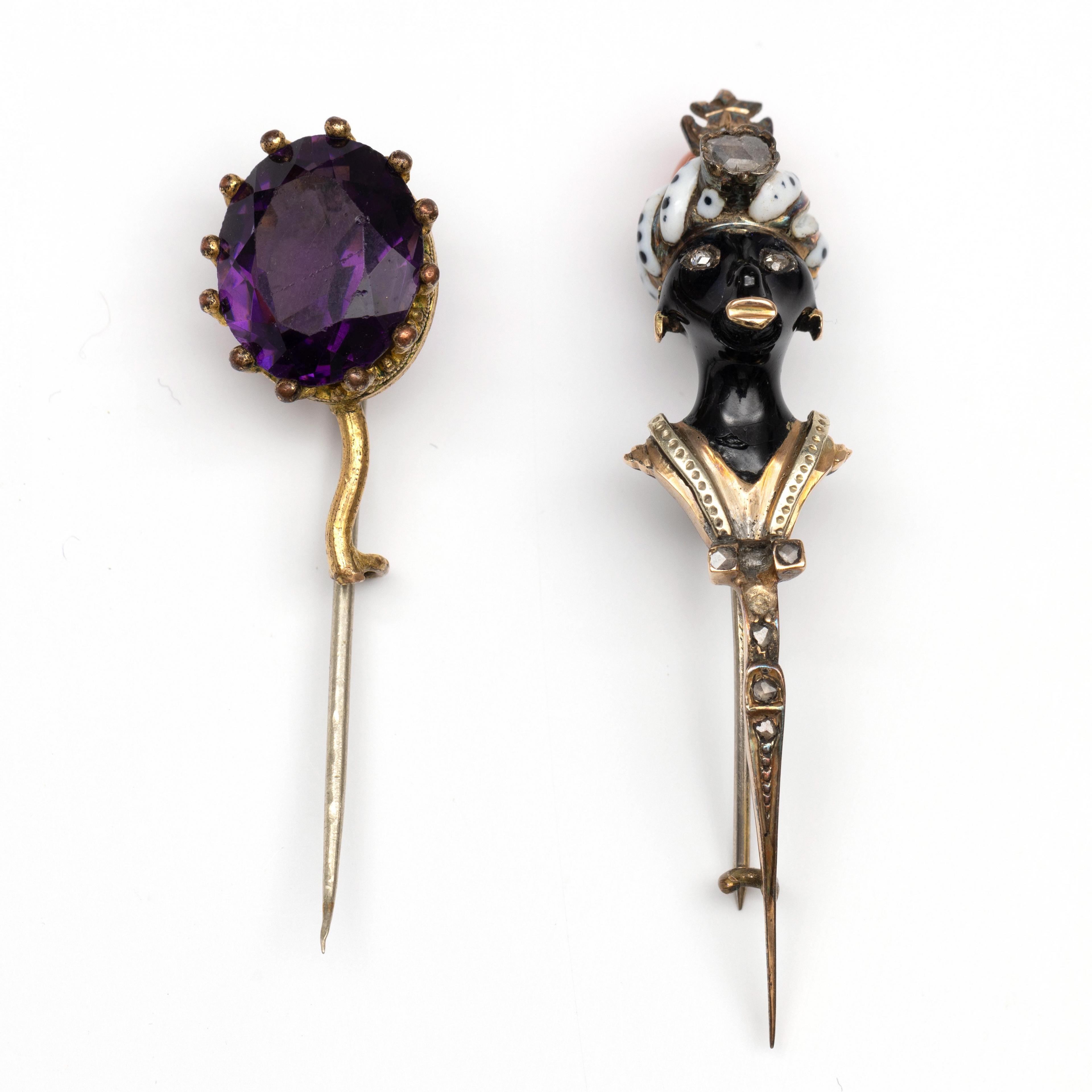 Gold Moretti brooch, 19th century. Featuring a black-enameled Moor's head with a gold coat and earrings, and a white-enameled turban with black dots set with a cabochon-cut coral. The eyes, turban, and coat are set with rose-cut diamonds. The brooching base. Herewith a gilded 19th-century brooch in the shape of a comet, set with purple paste.
