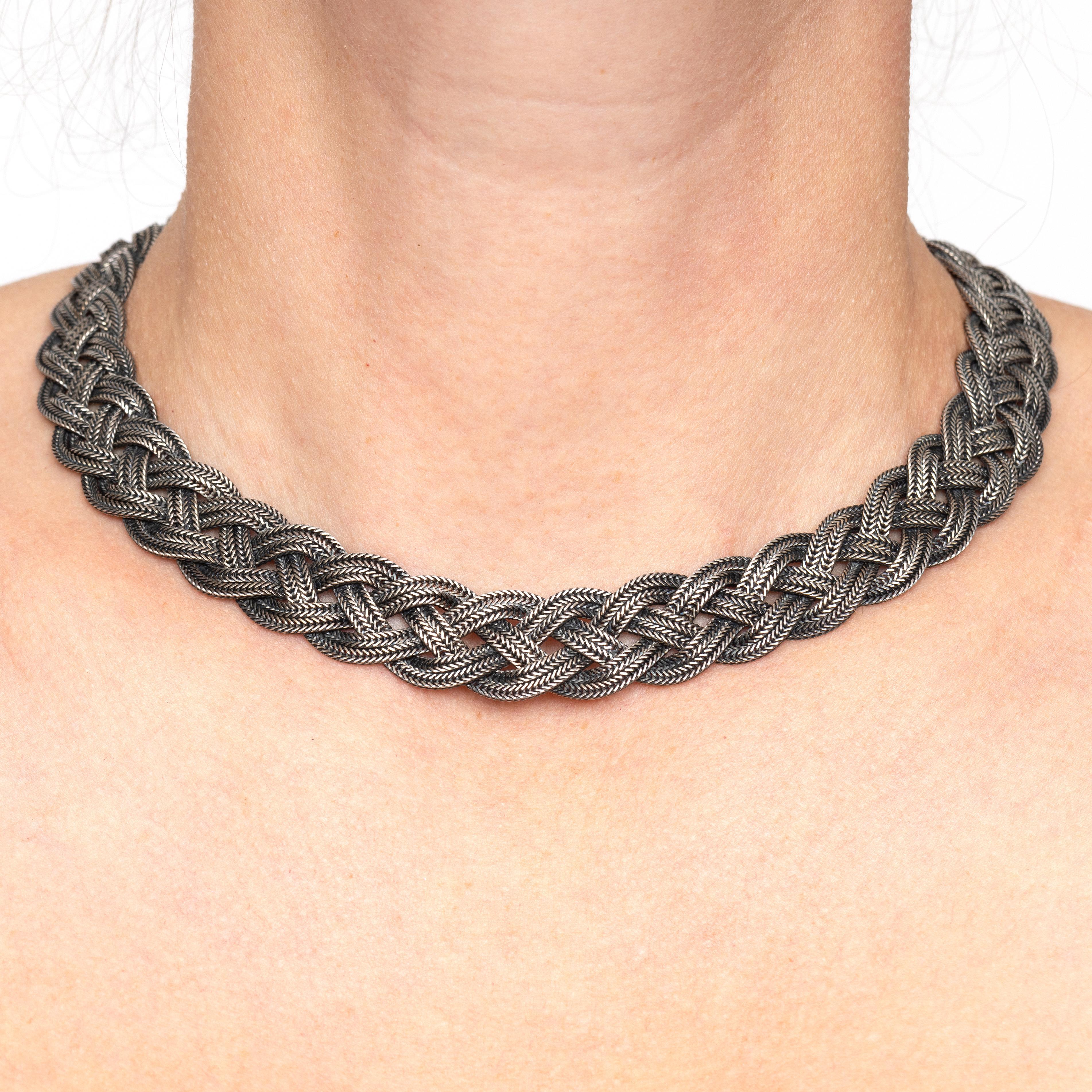 Silver necklace and bracelet. Made of double braided herringbone links with a blackened surface.