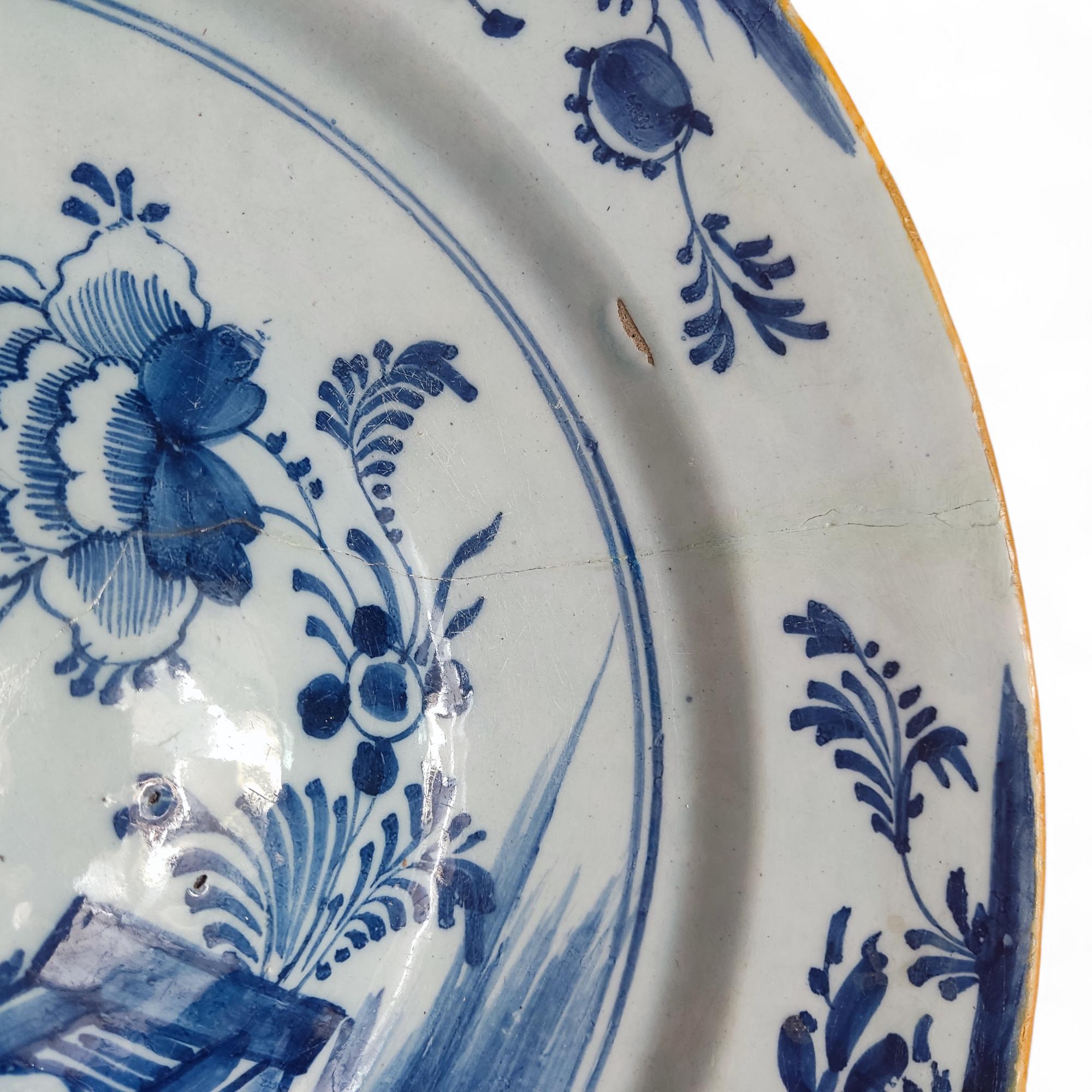 een pauwenbord, een met florale decoratie en een met bolle bodem en met Chinoiserie decoratie van een ommuurde tuin (de laatste gebroken en glijmd, het bloemenbord met lange haarlijn, alle met randbeschadigingen)