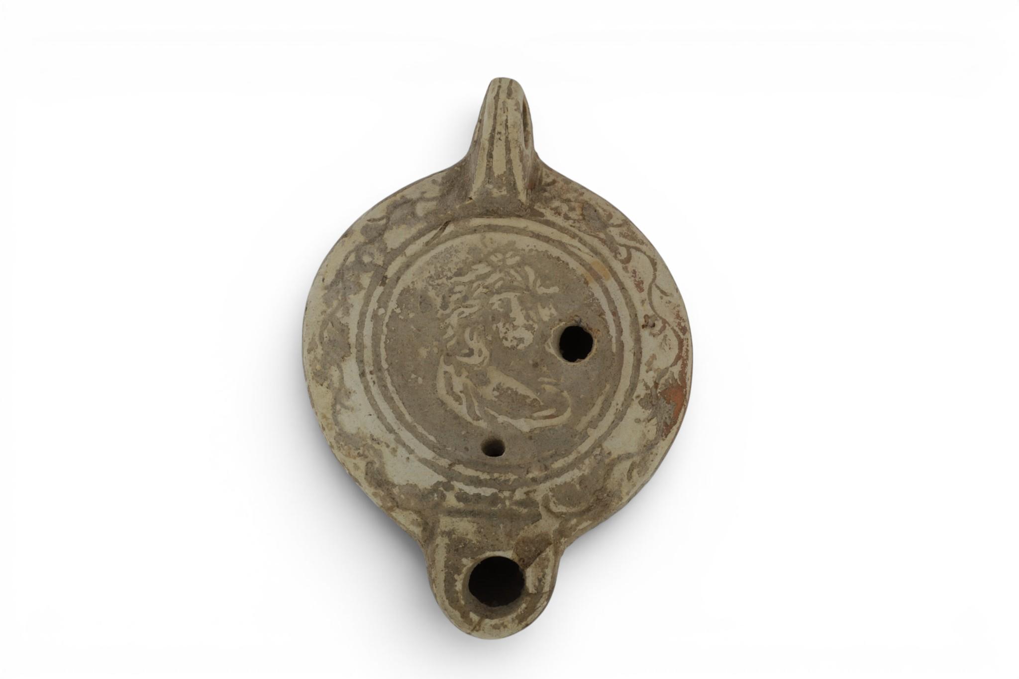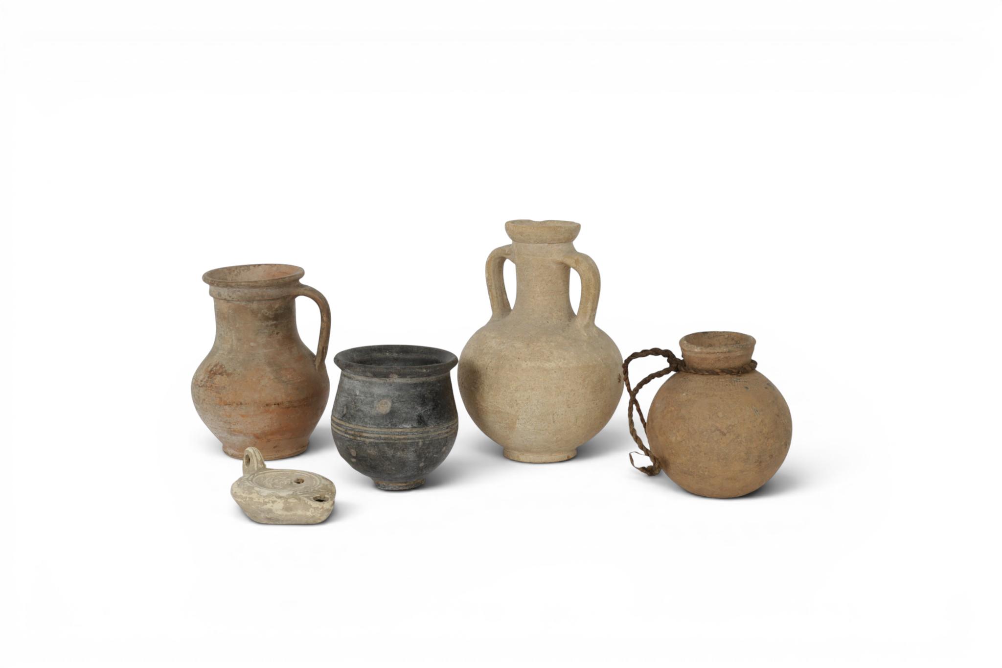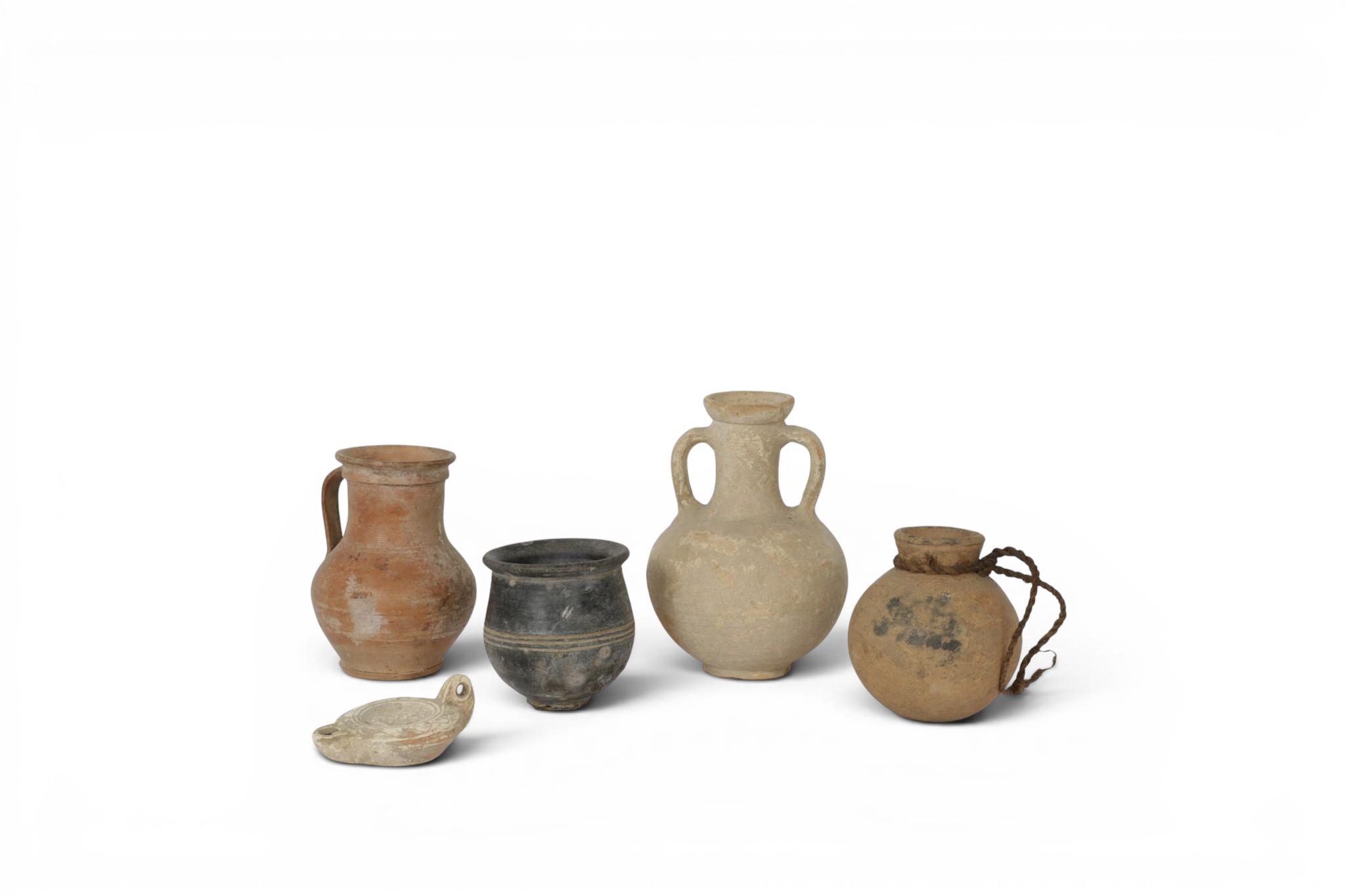 Four antique terracotta pots, Roman and later period and a Roman firmlamp, ca. 3rd century BCE