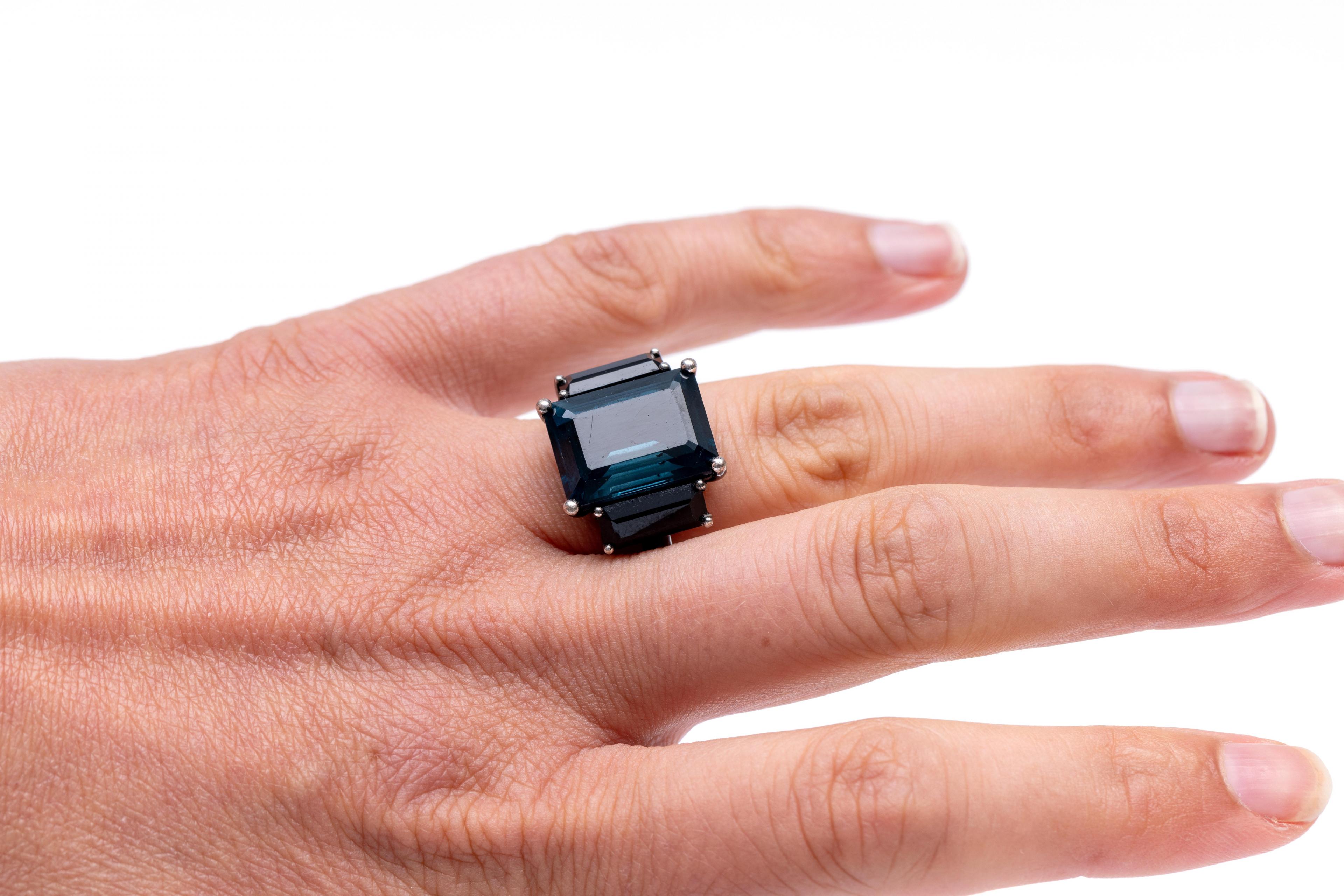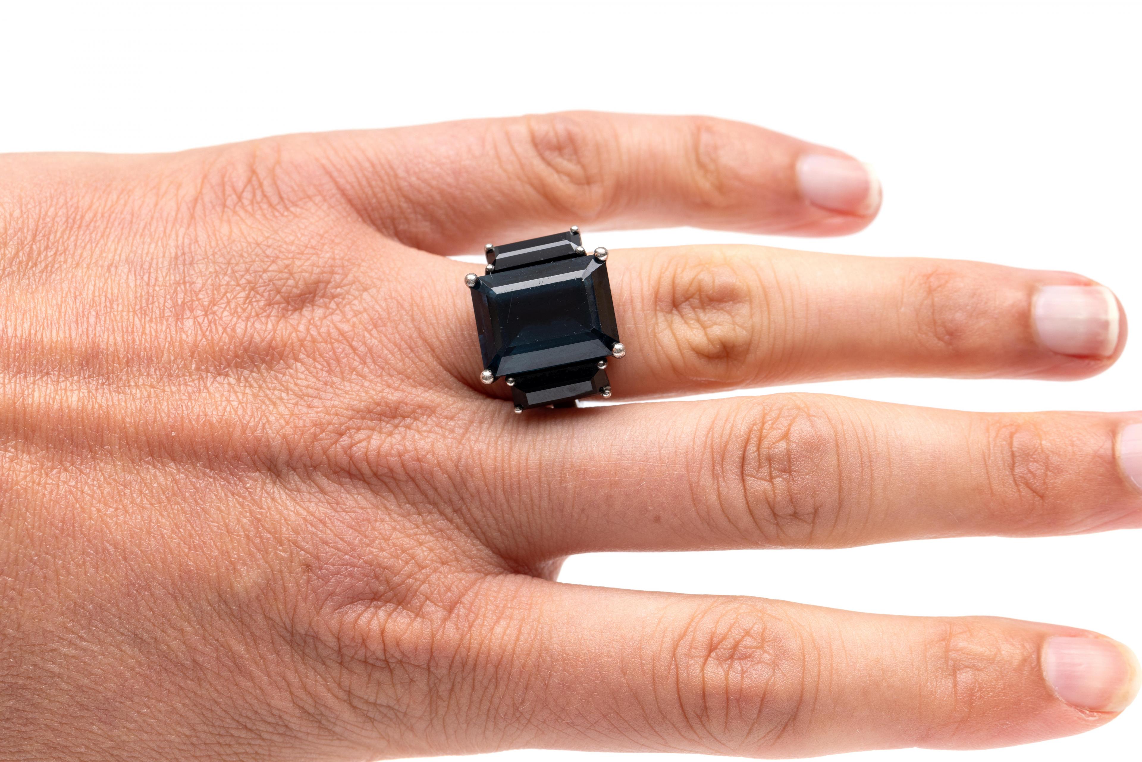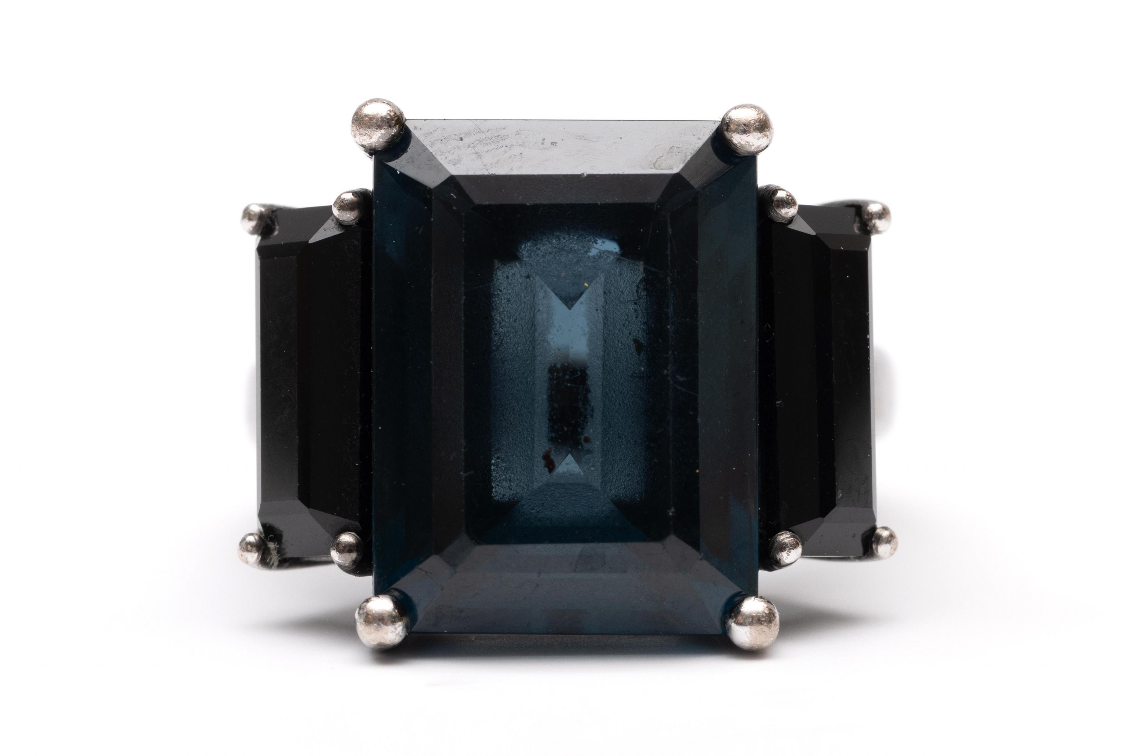 Charles Greig, black rhodium plated 18 k. white gold ring. Centrally set with a rectangular faceted dark blue to teal coloured topaz (approx. 16 x 12 mm, approx. 11.7 ct.) with on either side a rectangular faceted onyx (approx. 11 x 5 mm)