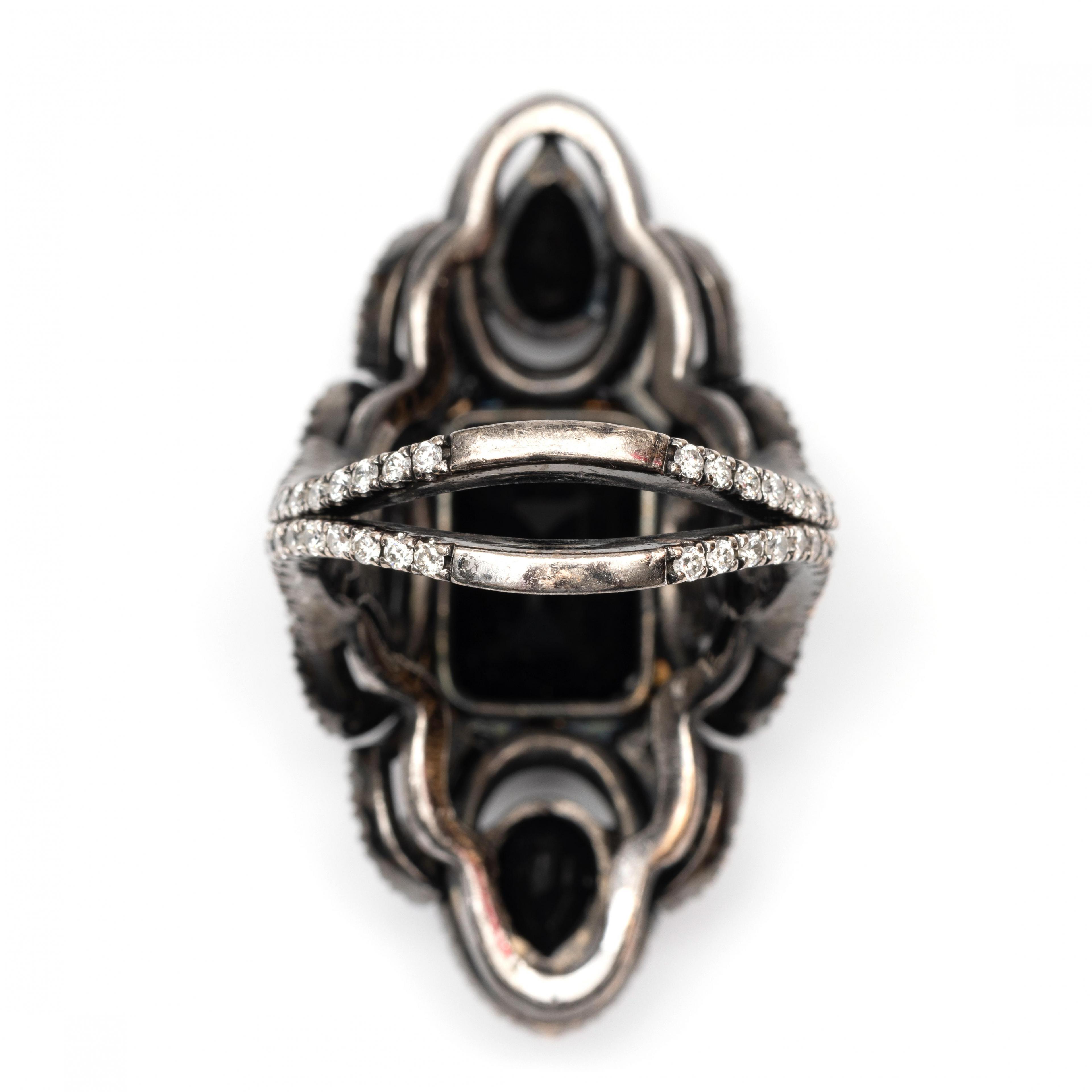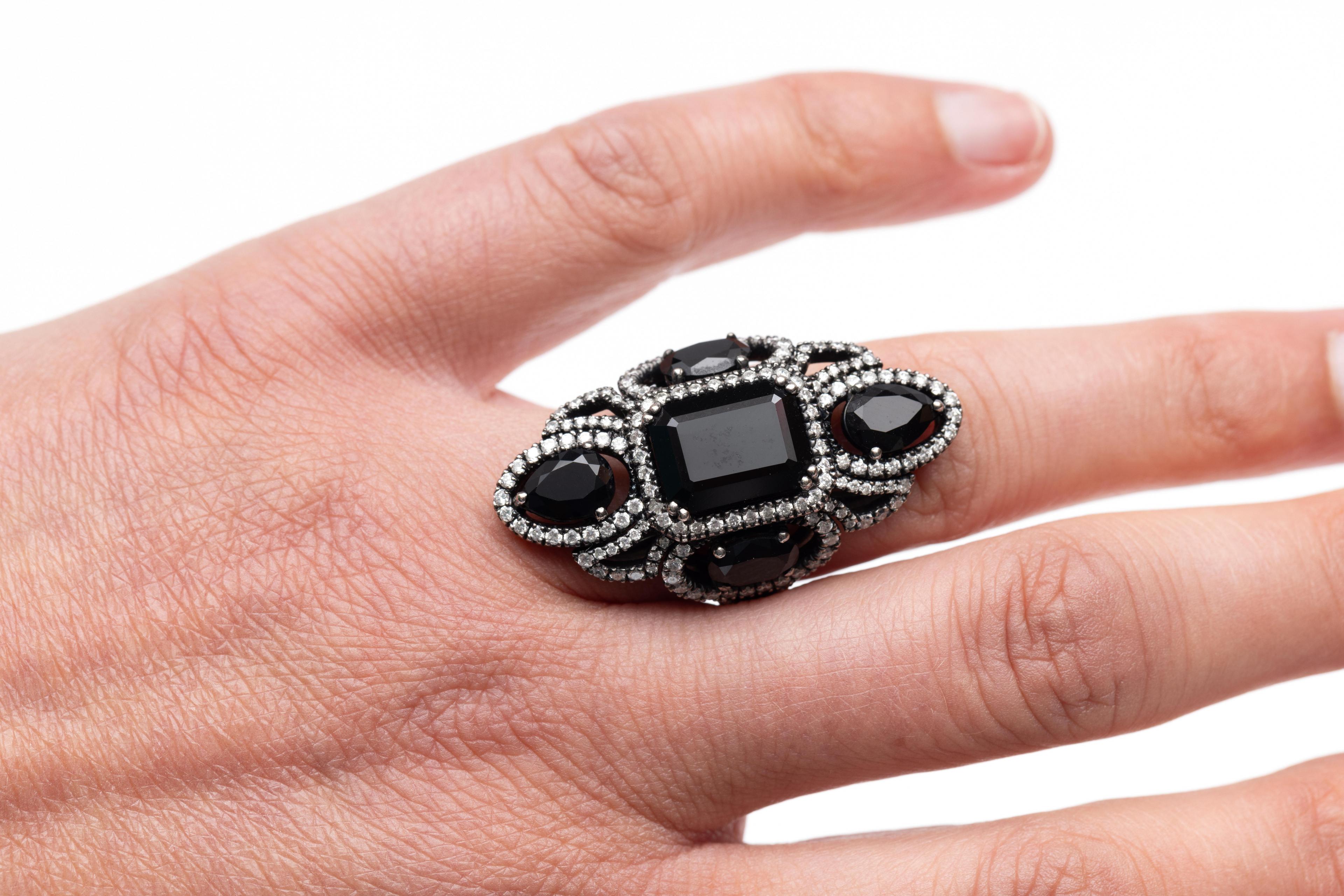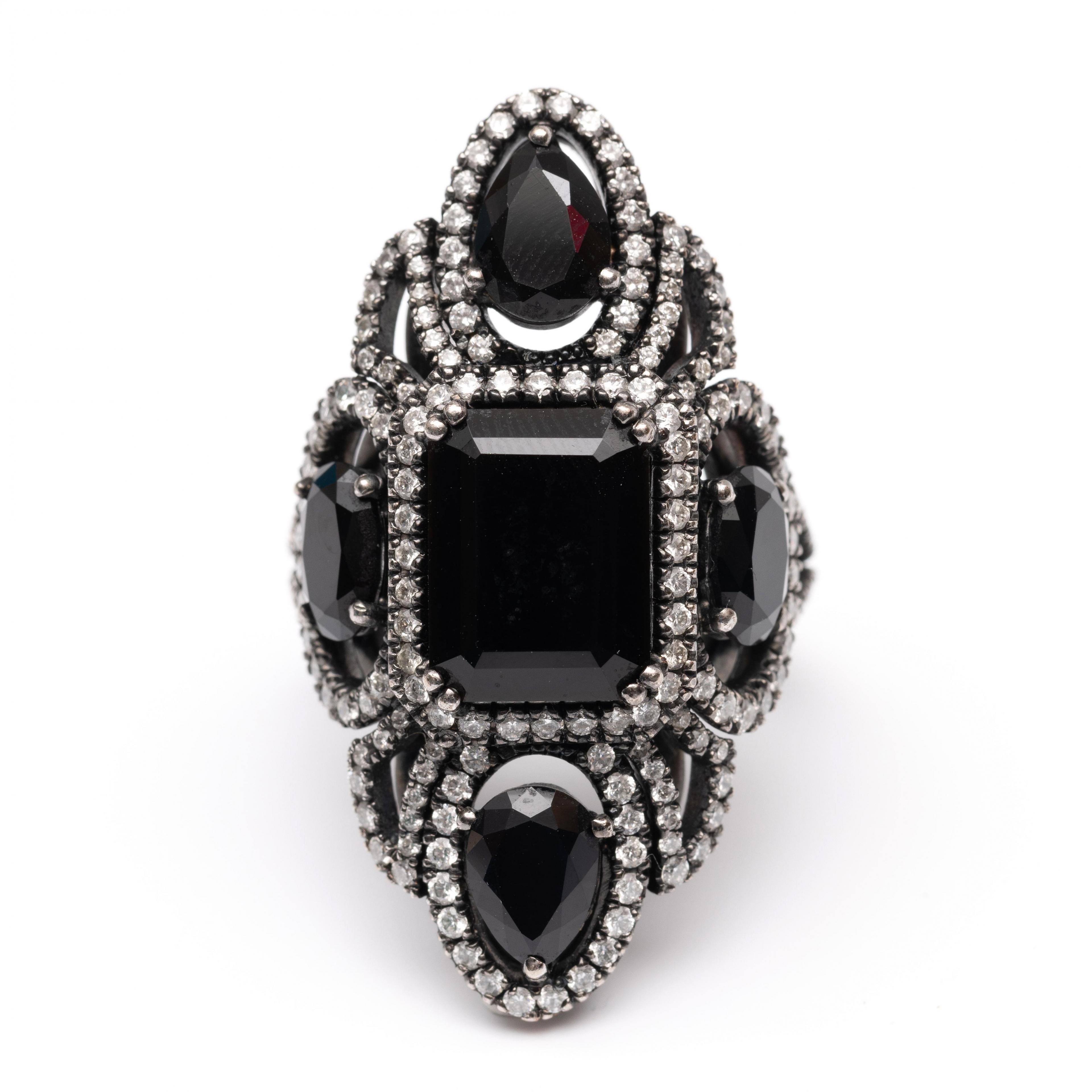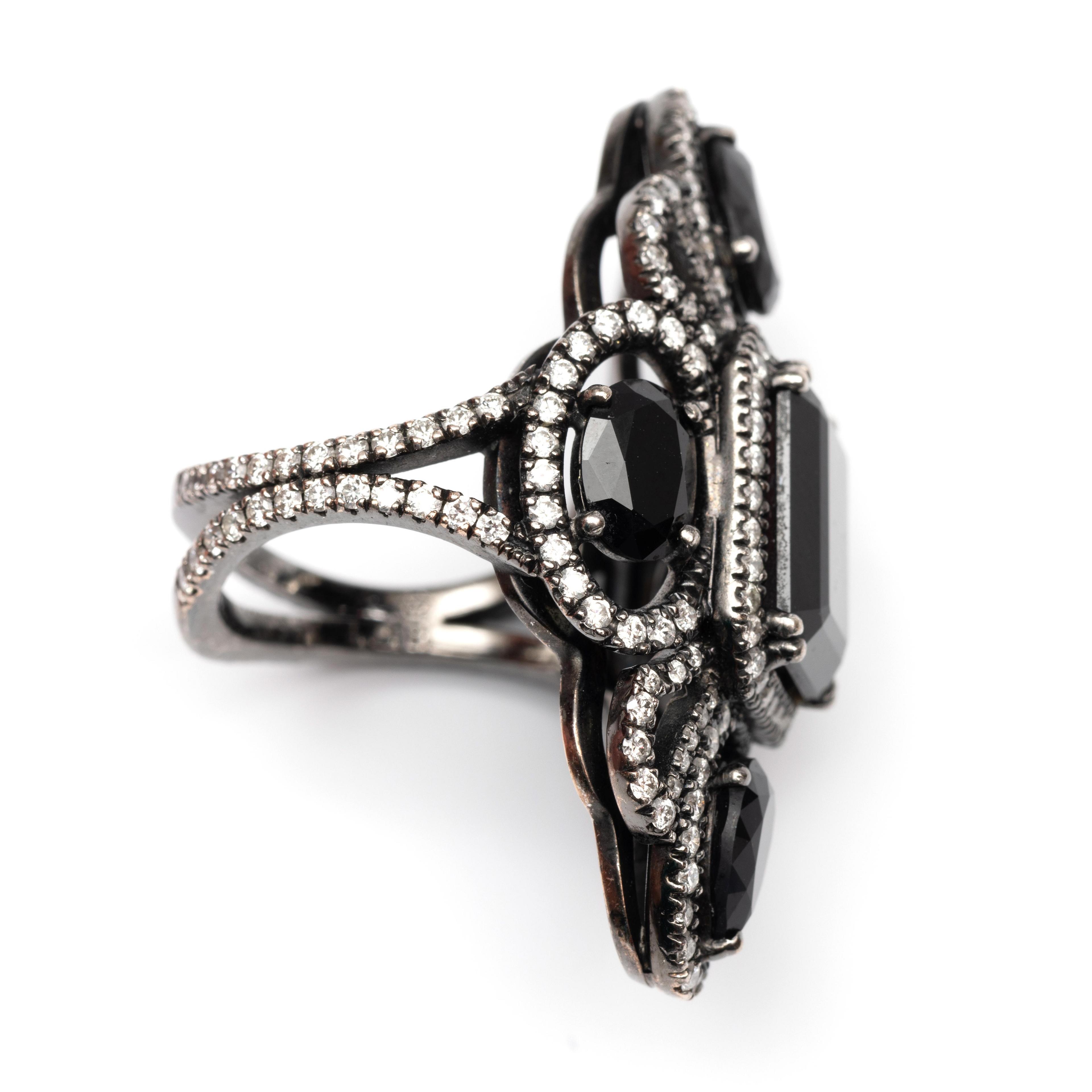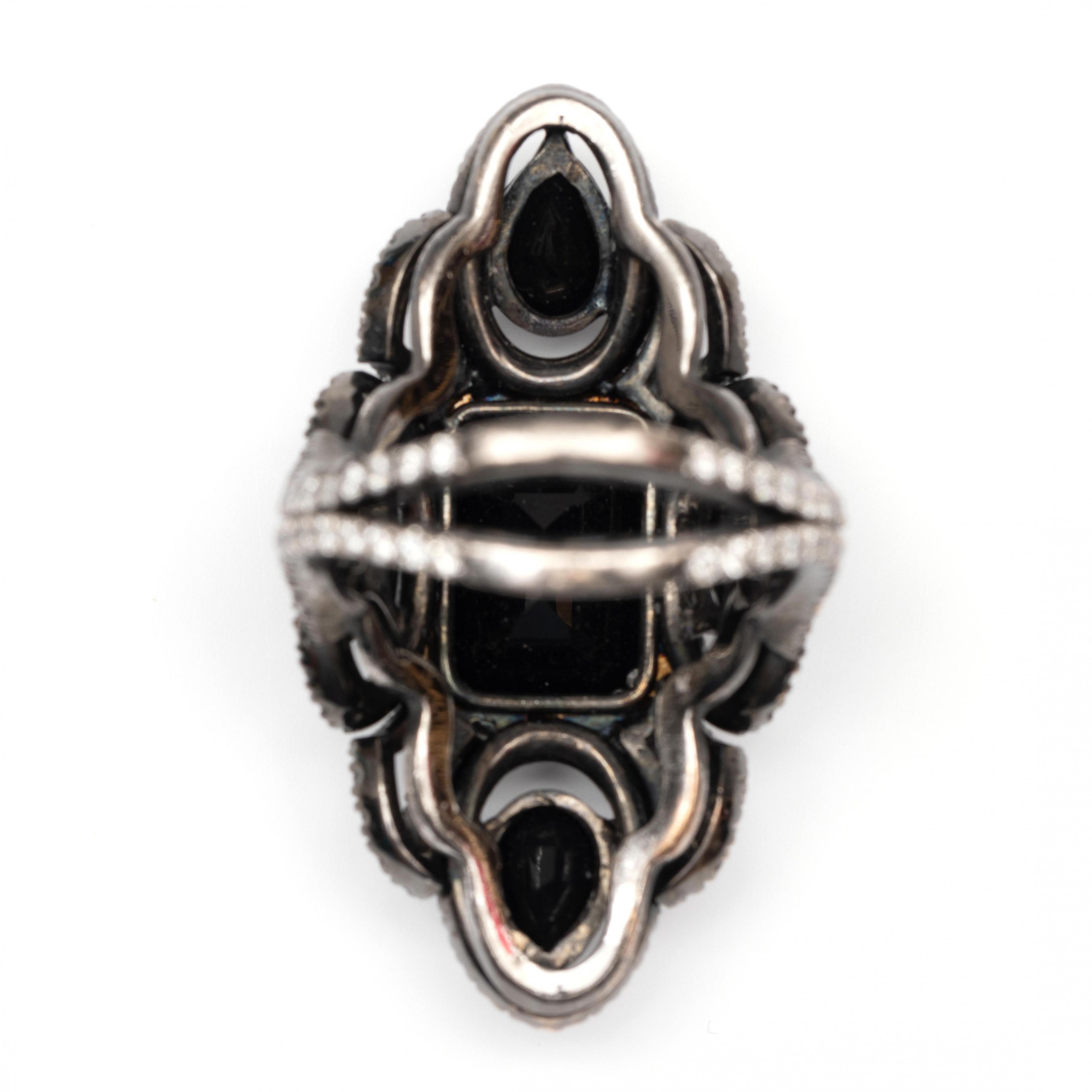 Charles Greig, black rhodium plated 18 k. white gold ring. The top marquise-shaped and set with emerald cut, pear cut and oval faceted onyx, each in an entourage of small white-grey brilliant cut diamonds, between which loops also set with brilliant cut diamonds, just like the double shank. Total diamond weight approx. 0.90 ct.