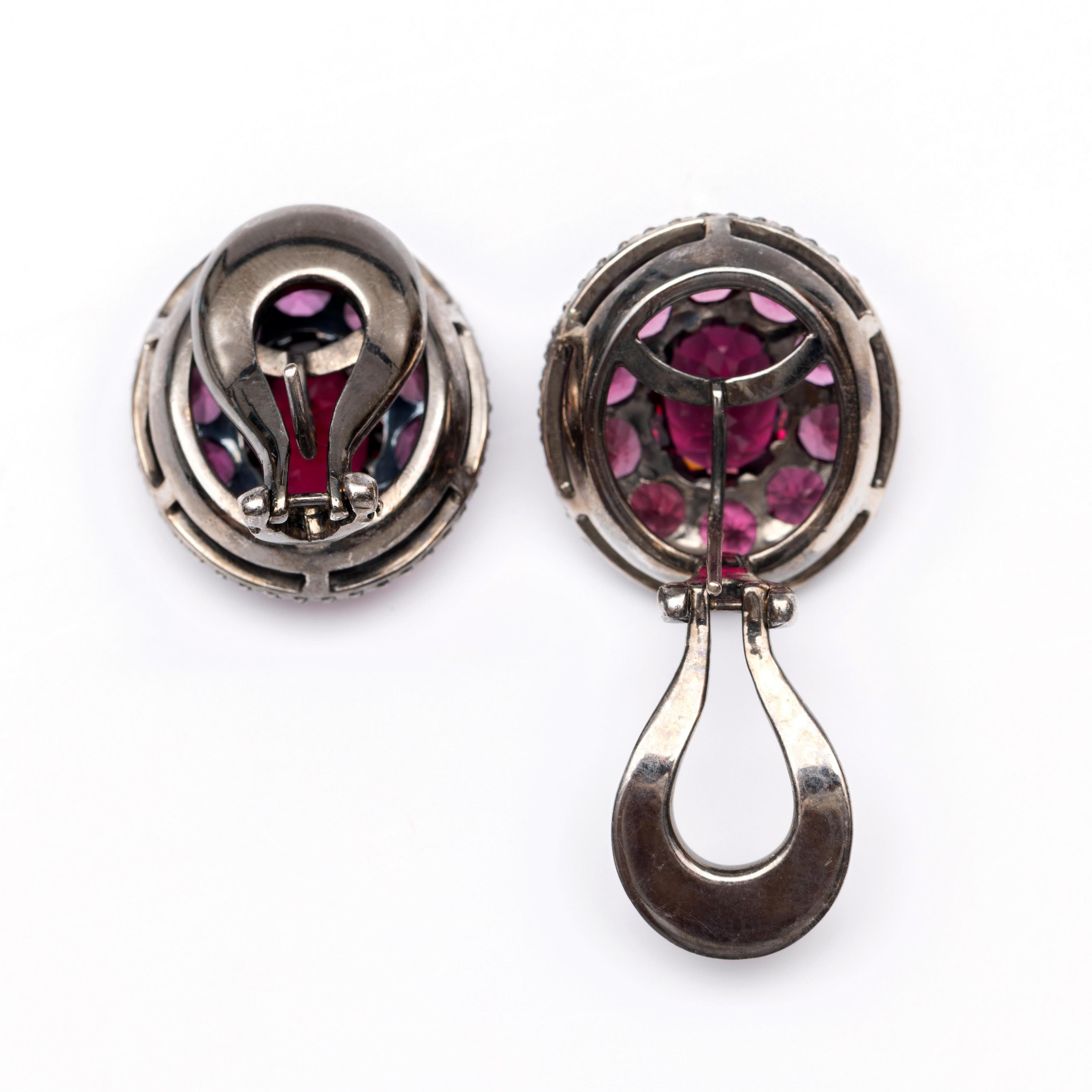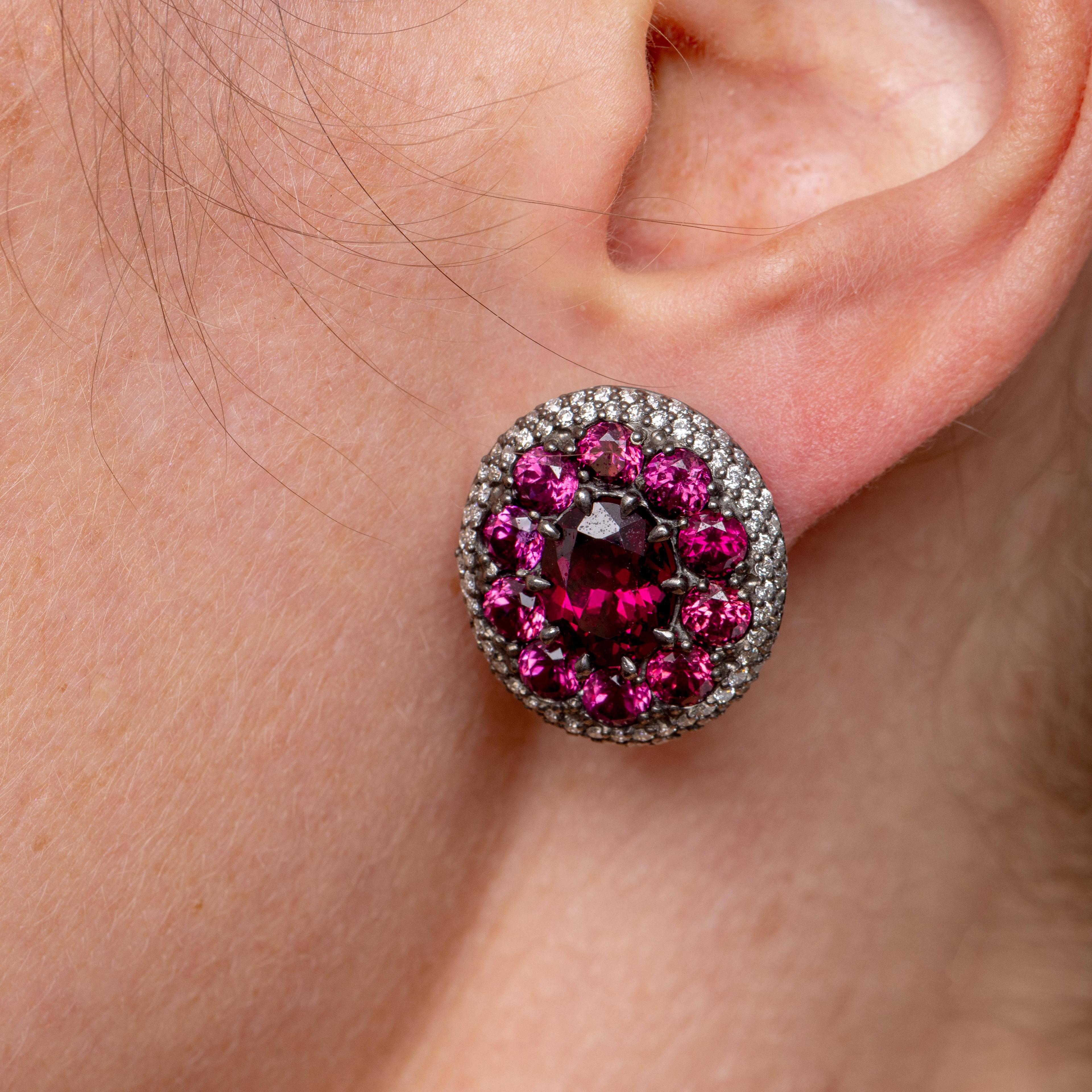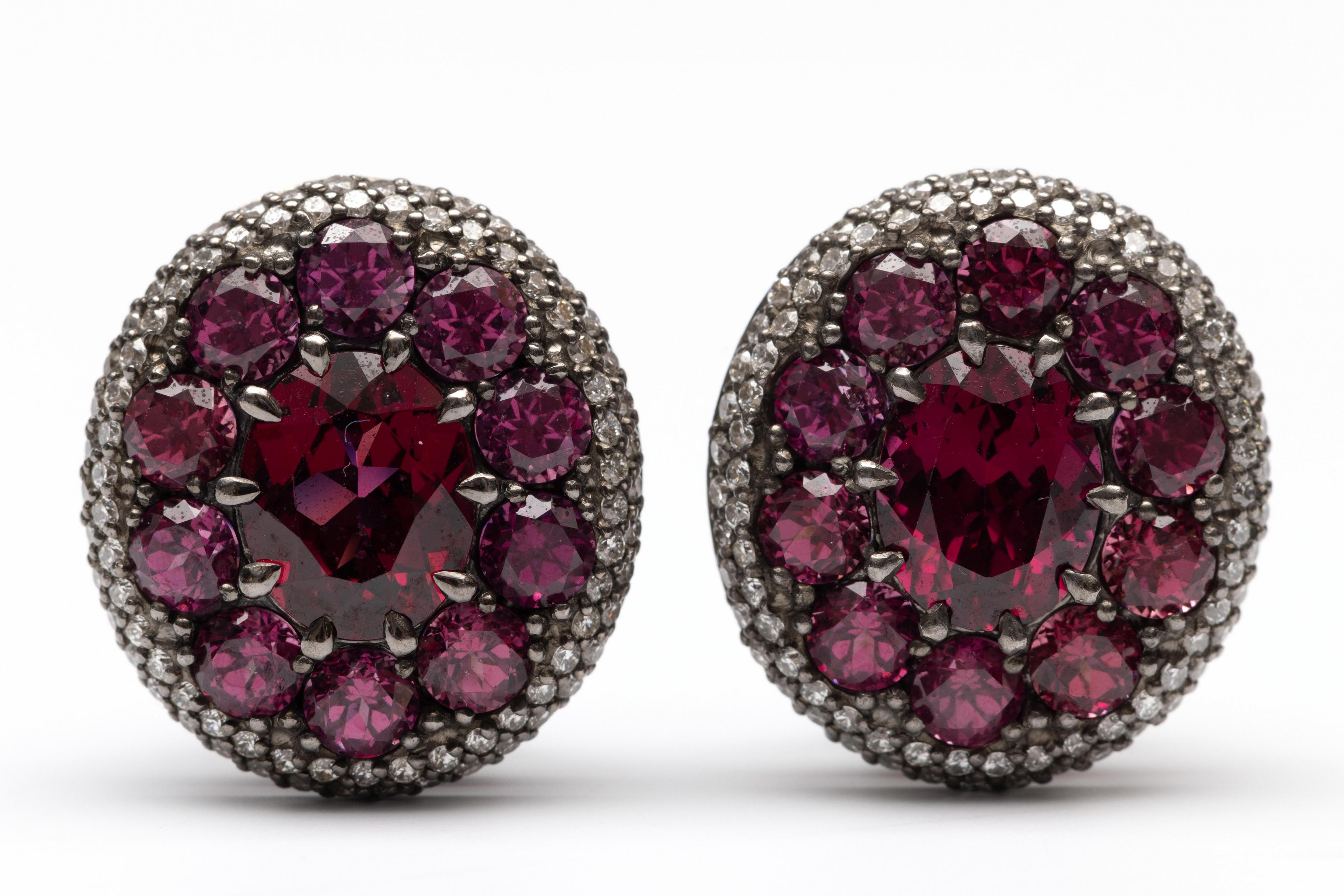 Black rhodium-plated 18 k. gold oval stud earrings. Centrally set with a deep purple-pink rhodolite garnet (approx. 9.8 x 8 mm), surrounded by a lighter-hued garnet (approx. 4 mm in diameter), surrounded by a pavé-set brilliant-cut diamond weighing approximately 0.90 ct.