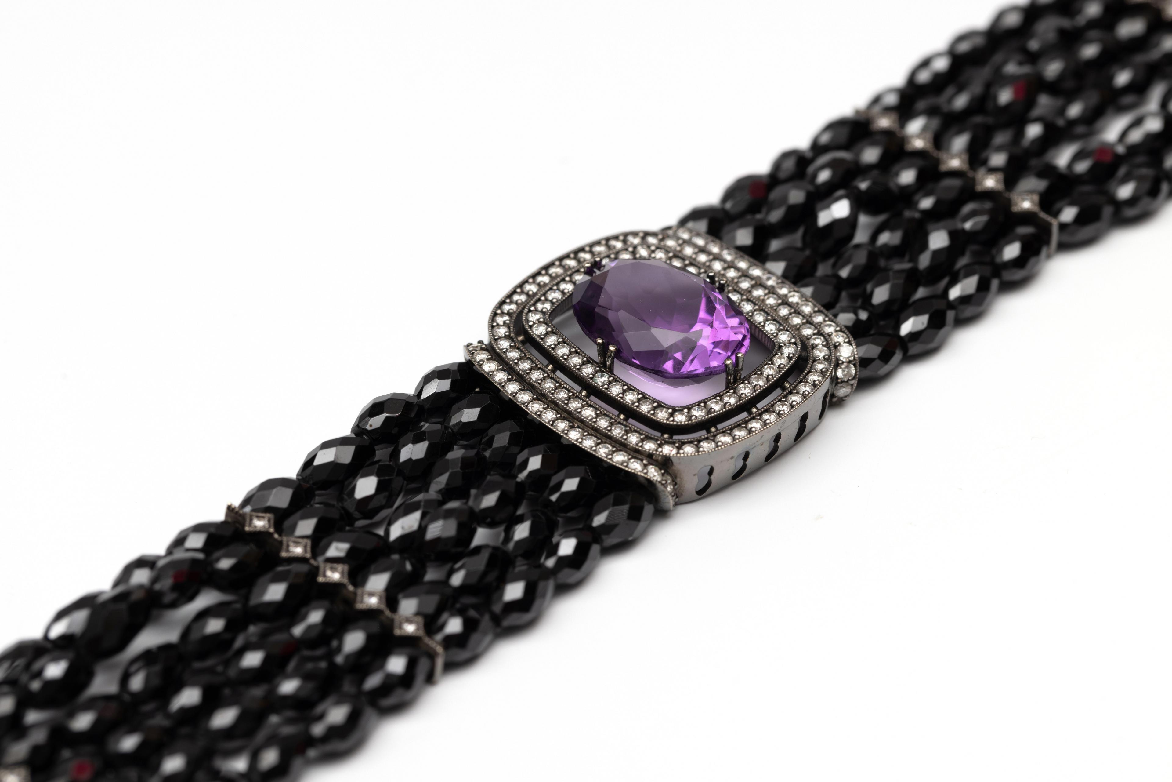 Black rhodium-plated 18 k. white gold collier du chien. With a central applique set with an oval faceted amethyst (approx. 16 x 12 mm) surrounded by brilliant-cut diamonds, set in separate bands. On five strings of barrel-shaped faceted black spinel, alternating with bars on which diamond-shaped appliques set with small brilliant-cut diamonds. Total weight of diamond approx. 0.75 ct.