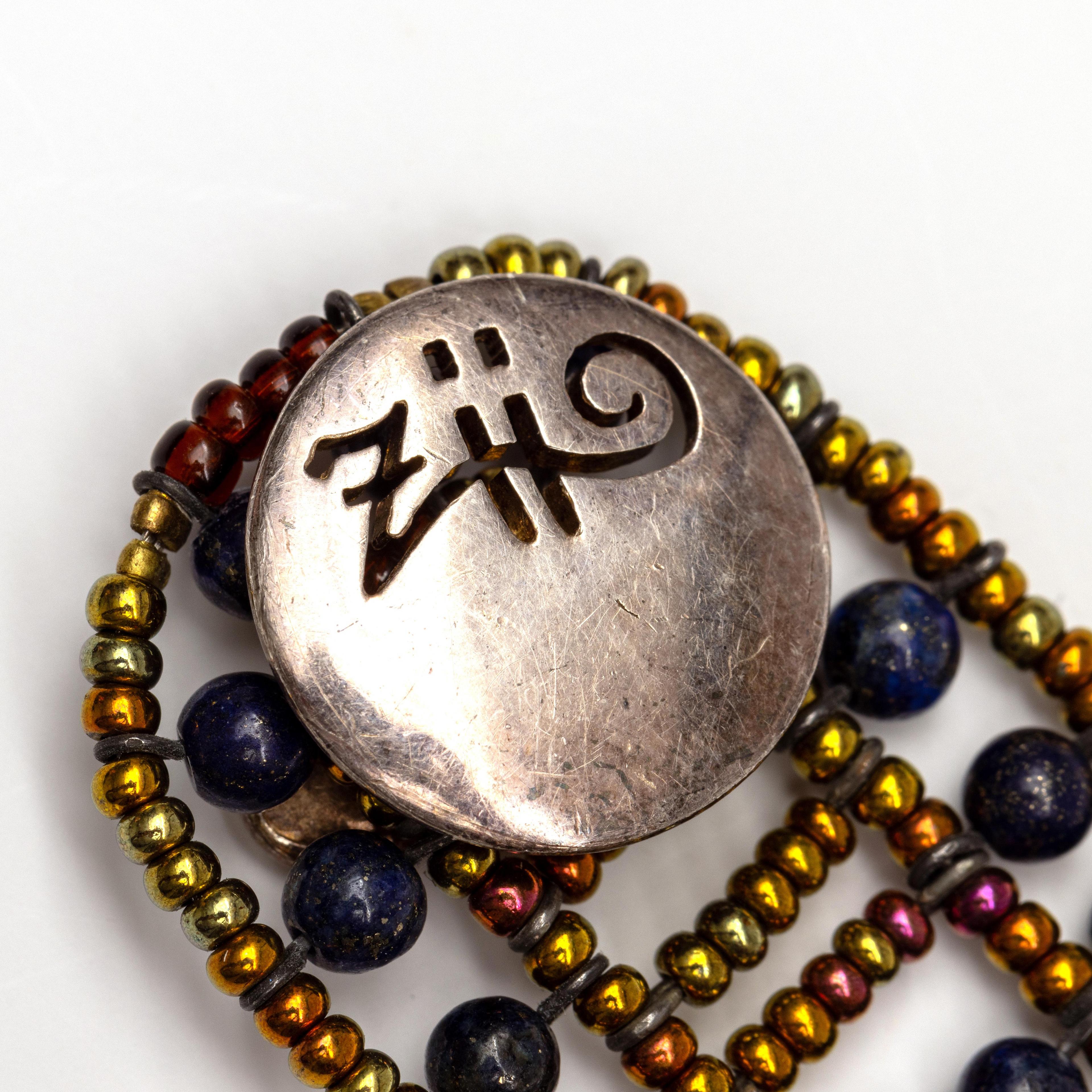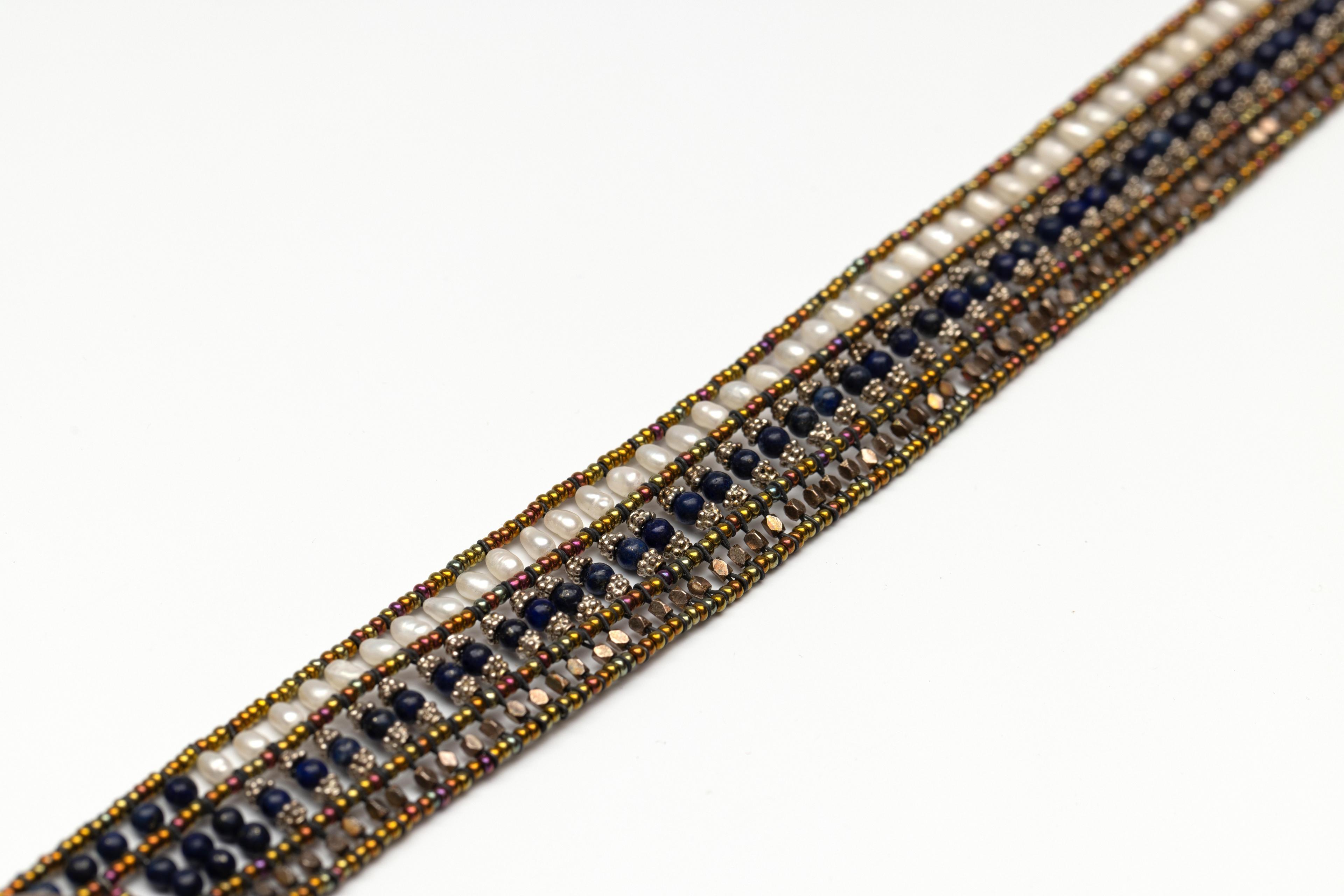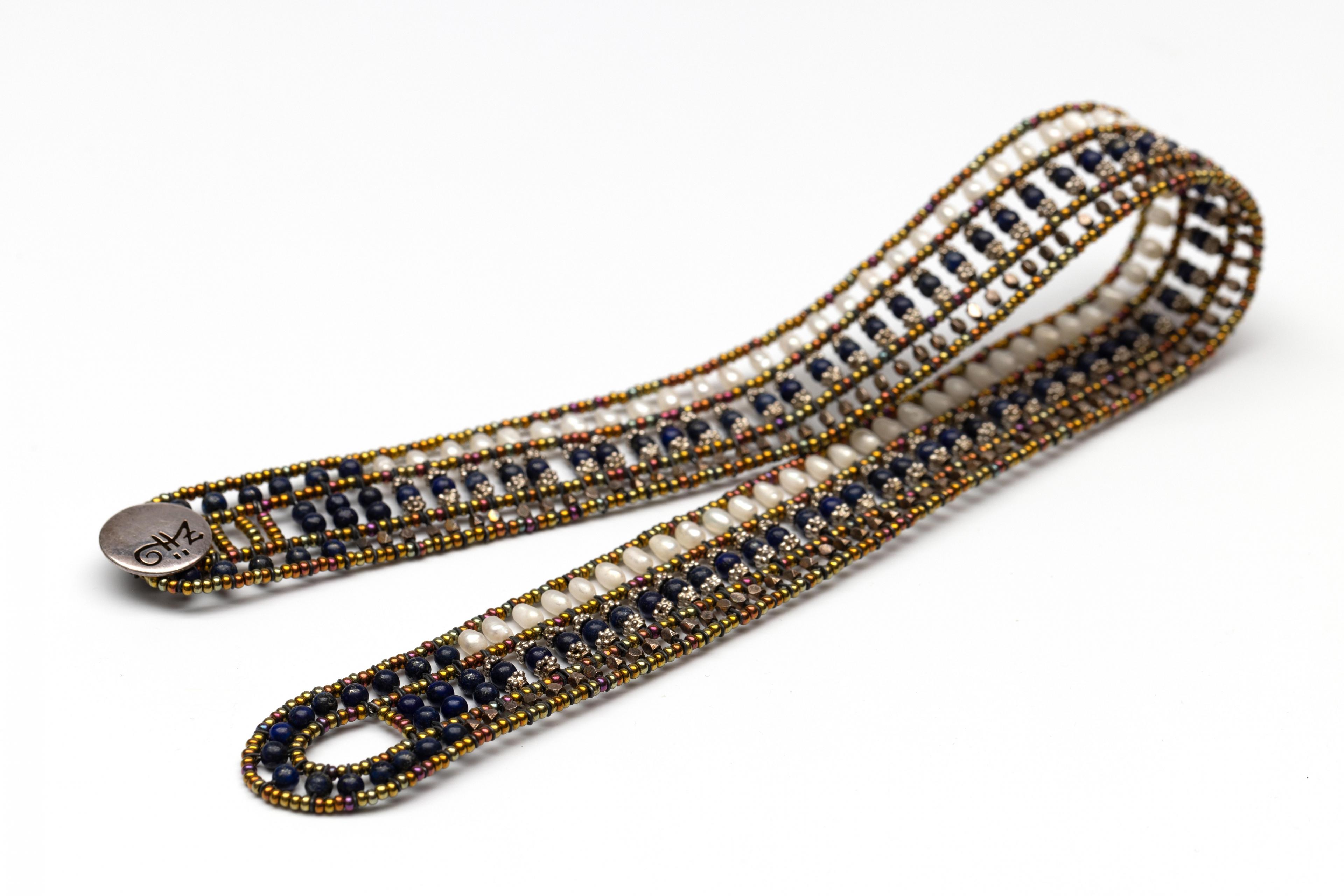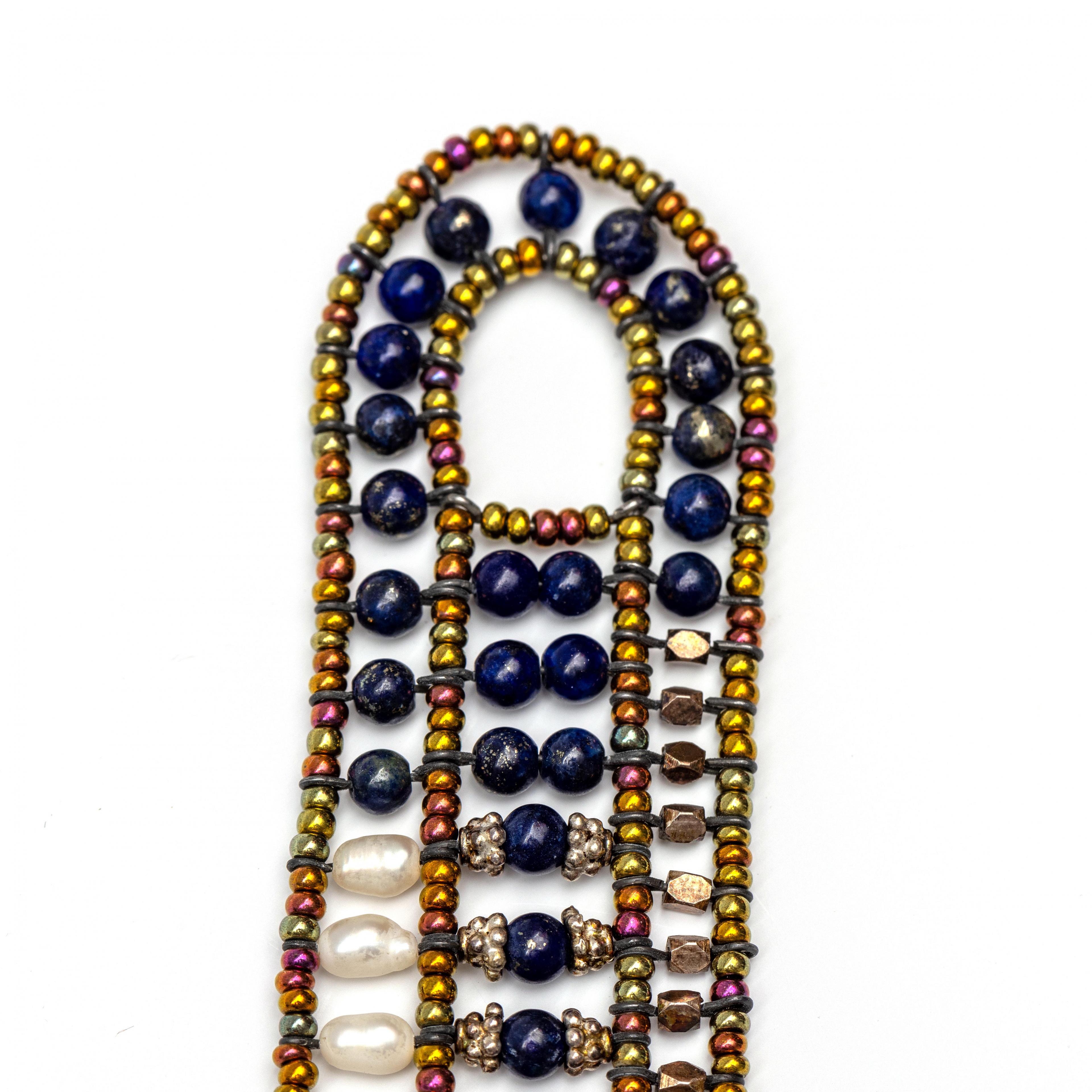 Eén cultivé parel collier (diam. 6,5 - 7 mm) aan een 9 kt. gouden sluiting en één collier du chien van glaskralen, lapis lazuli en zoetwaterparels