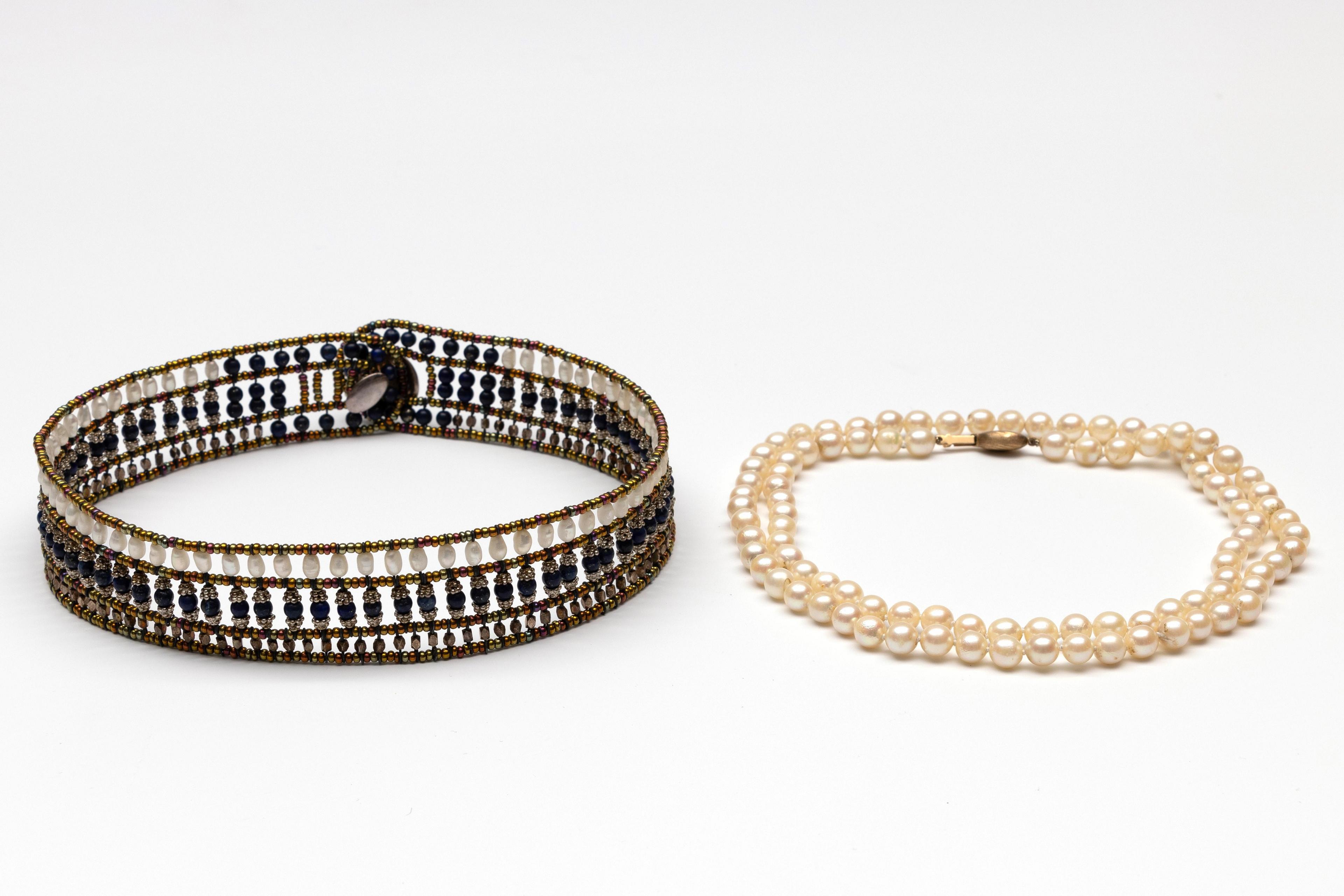Two necklaces. One cultured pearl necklace (diam. 6.5 - 7 mm) on a 9 k. gold clasp and one collier du chien of glass beads, lapis lazuli and freshwater pearls