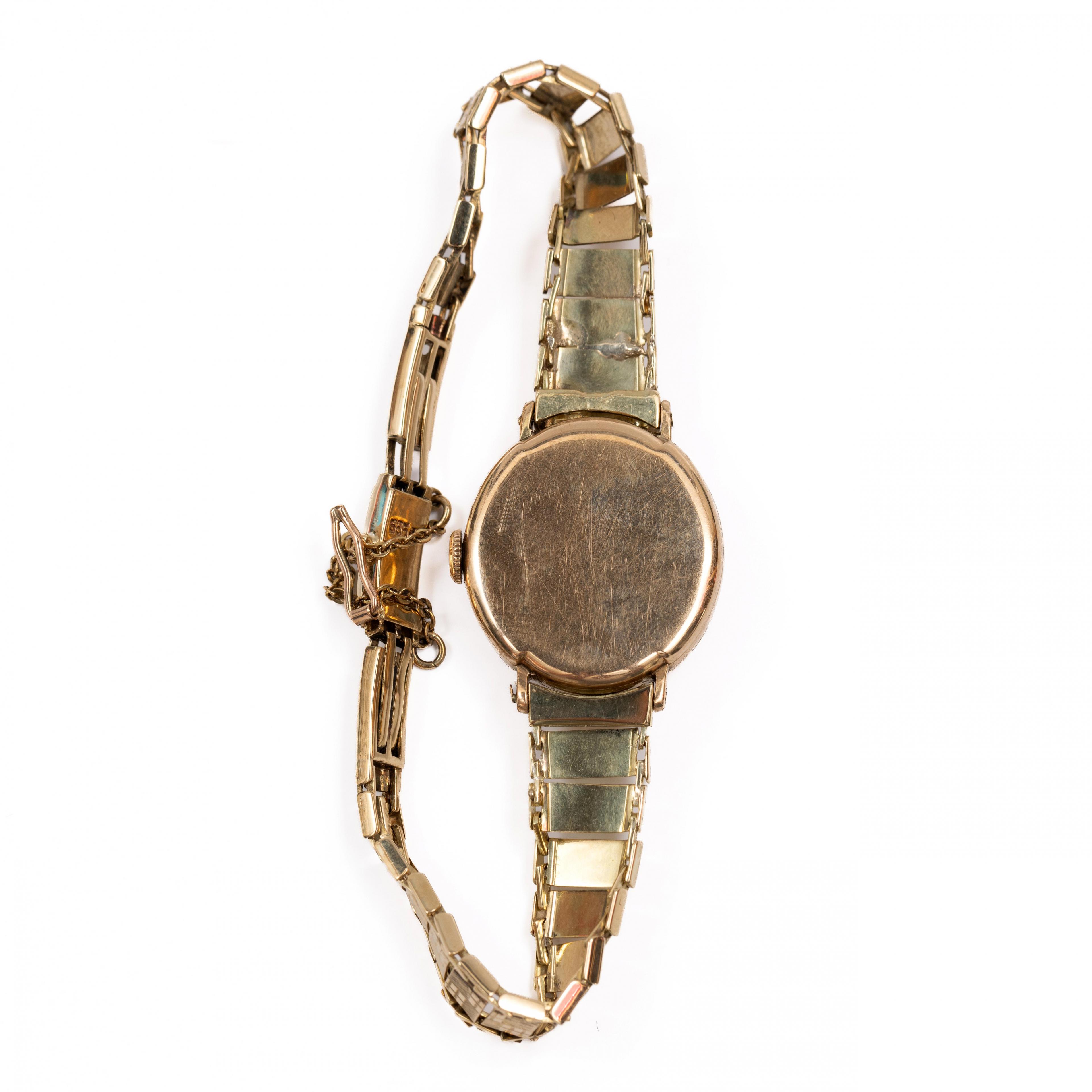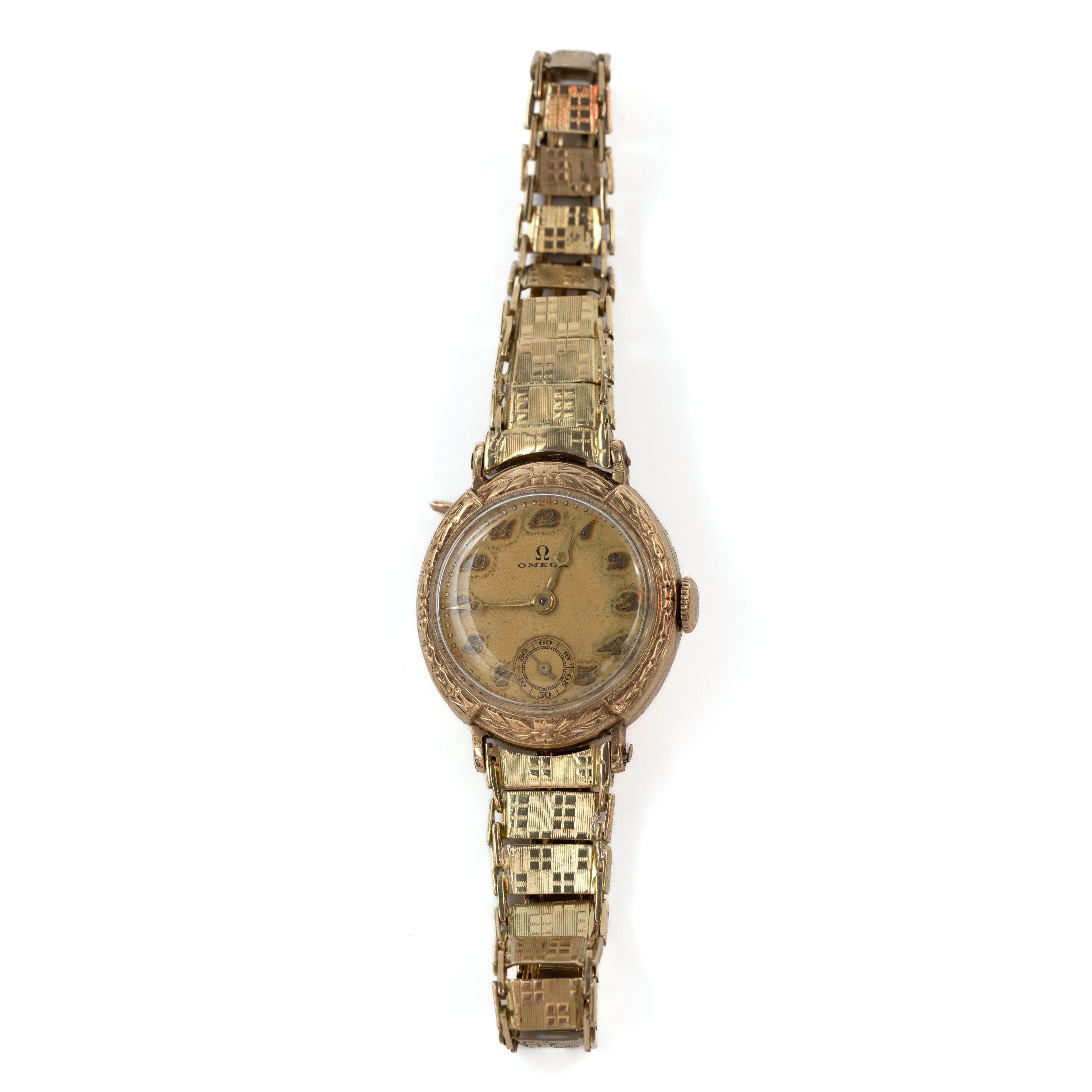 Handopwind. Met goudkleurige wijzerplaat met secondeaanduiding op de zes. Aan een gouden schakelband (van later datum), gedecoreerd met een patroon van blokjes. Loopt niet.