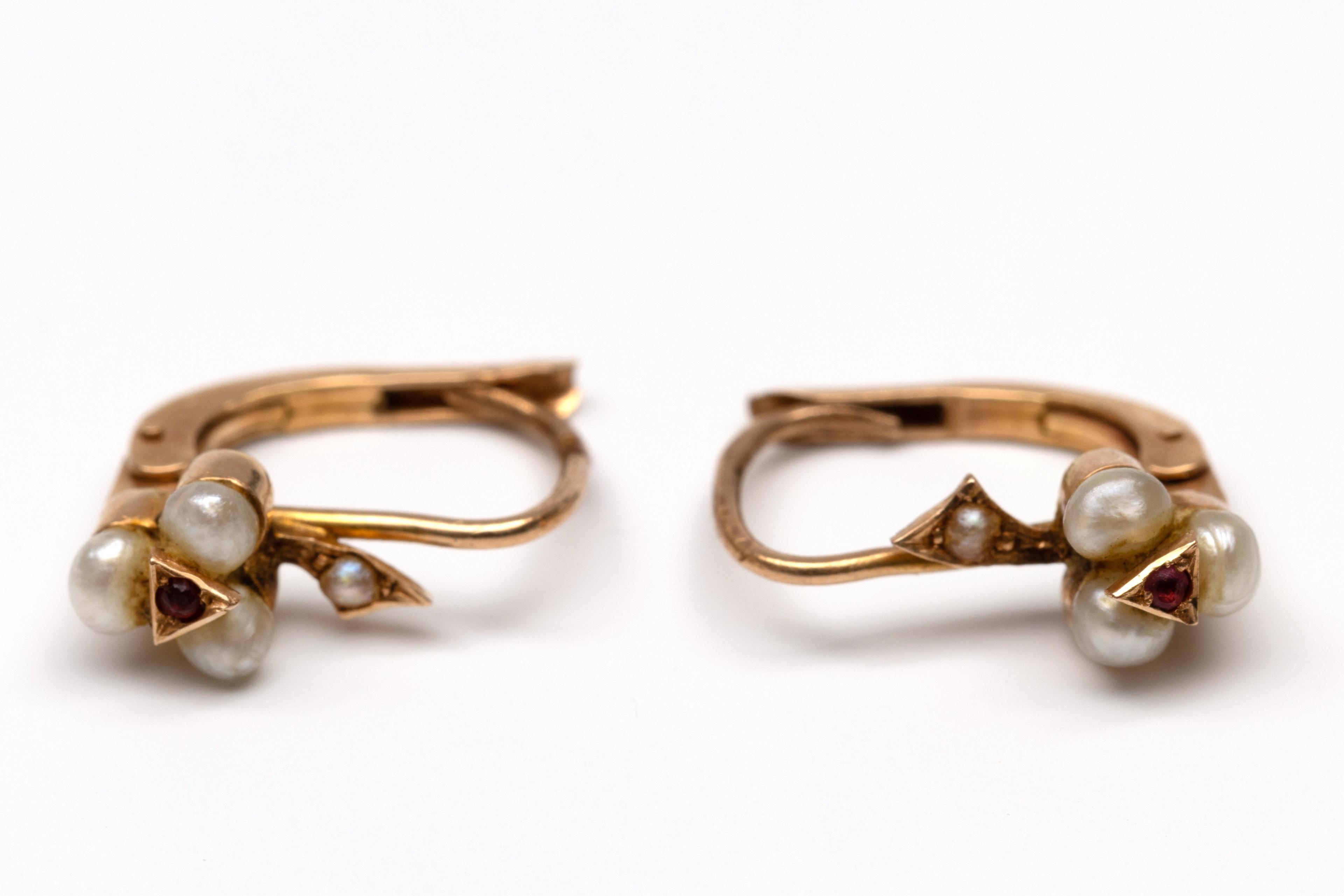 14 k. gold earrings, 19th century. In the shape of a three-leaf clover, set with small half-pearls and imitation rubies.