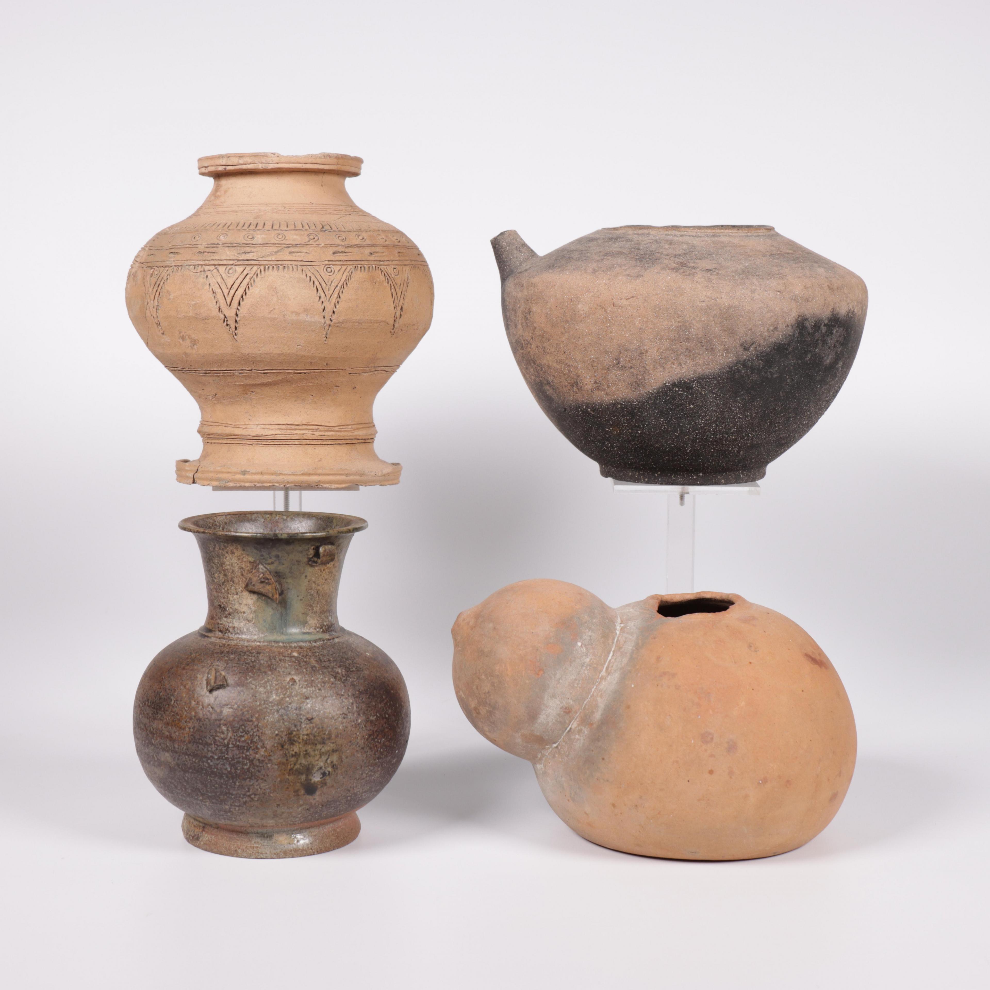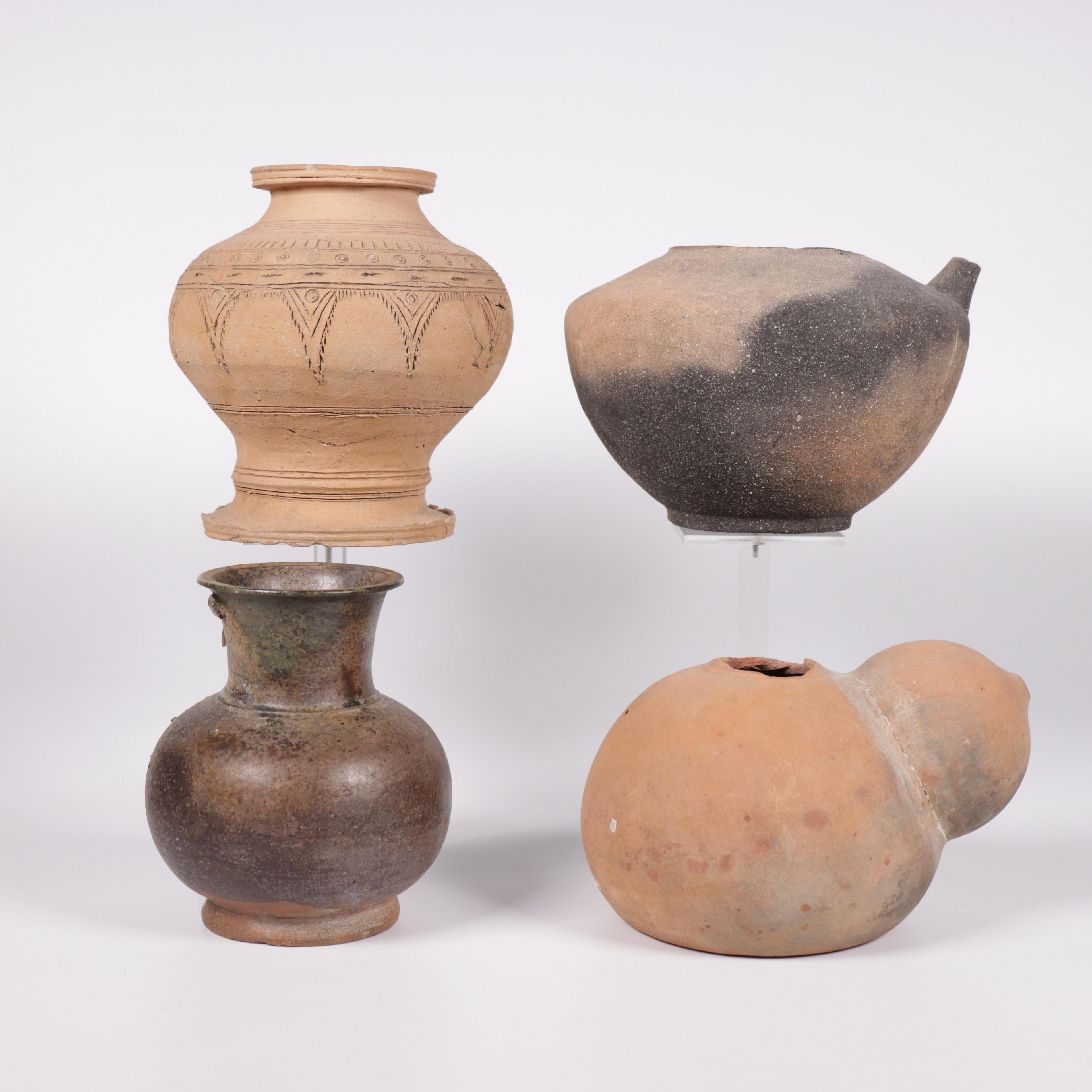 one with incised geometrical decoration (broken and reglued), one mammiform (reglued spout), one with short spout and one with brown glaze (some damage and wear as expected)