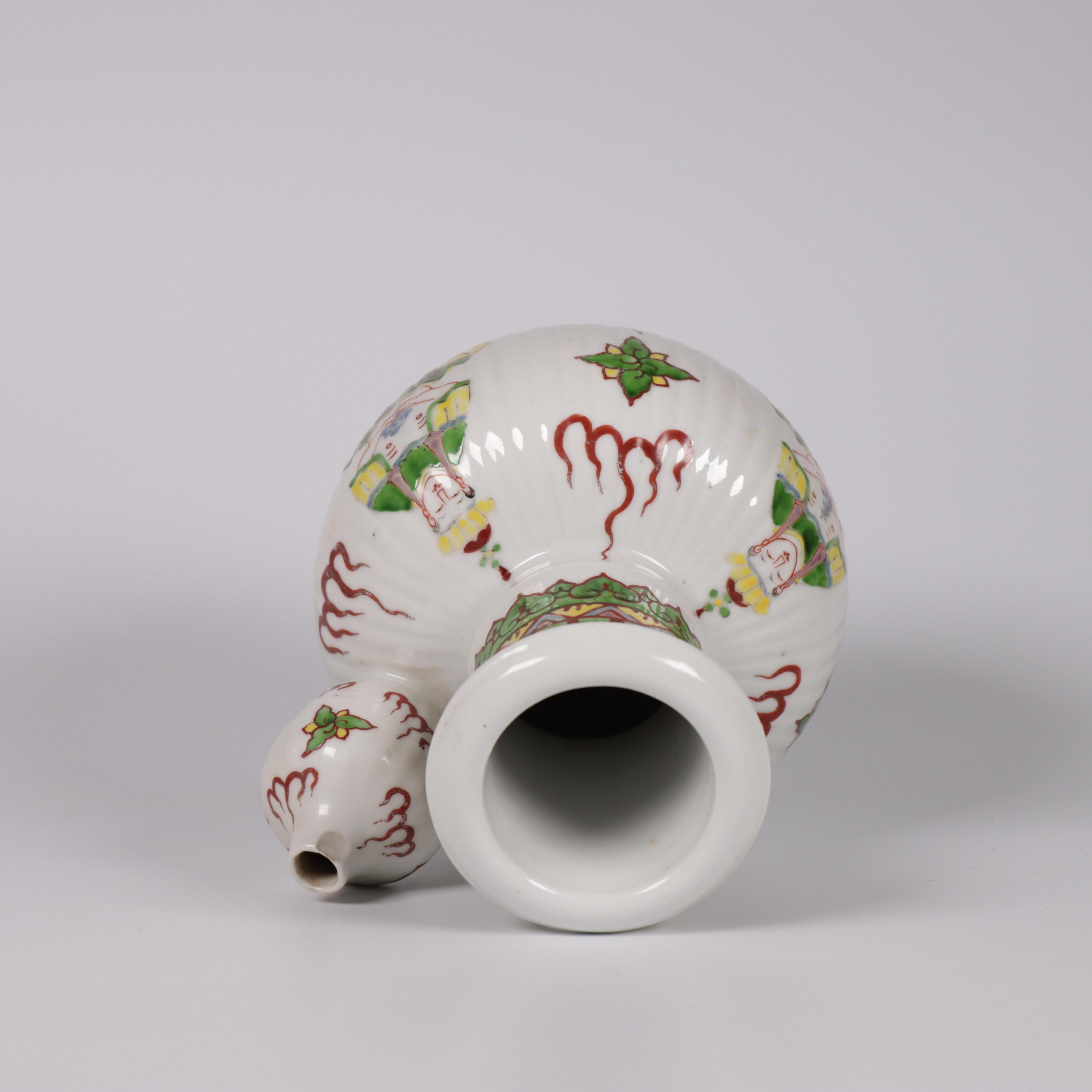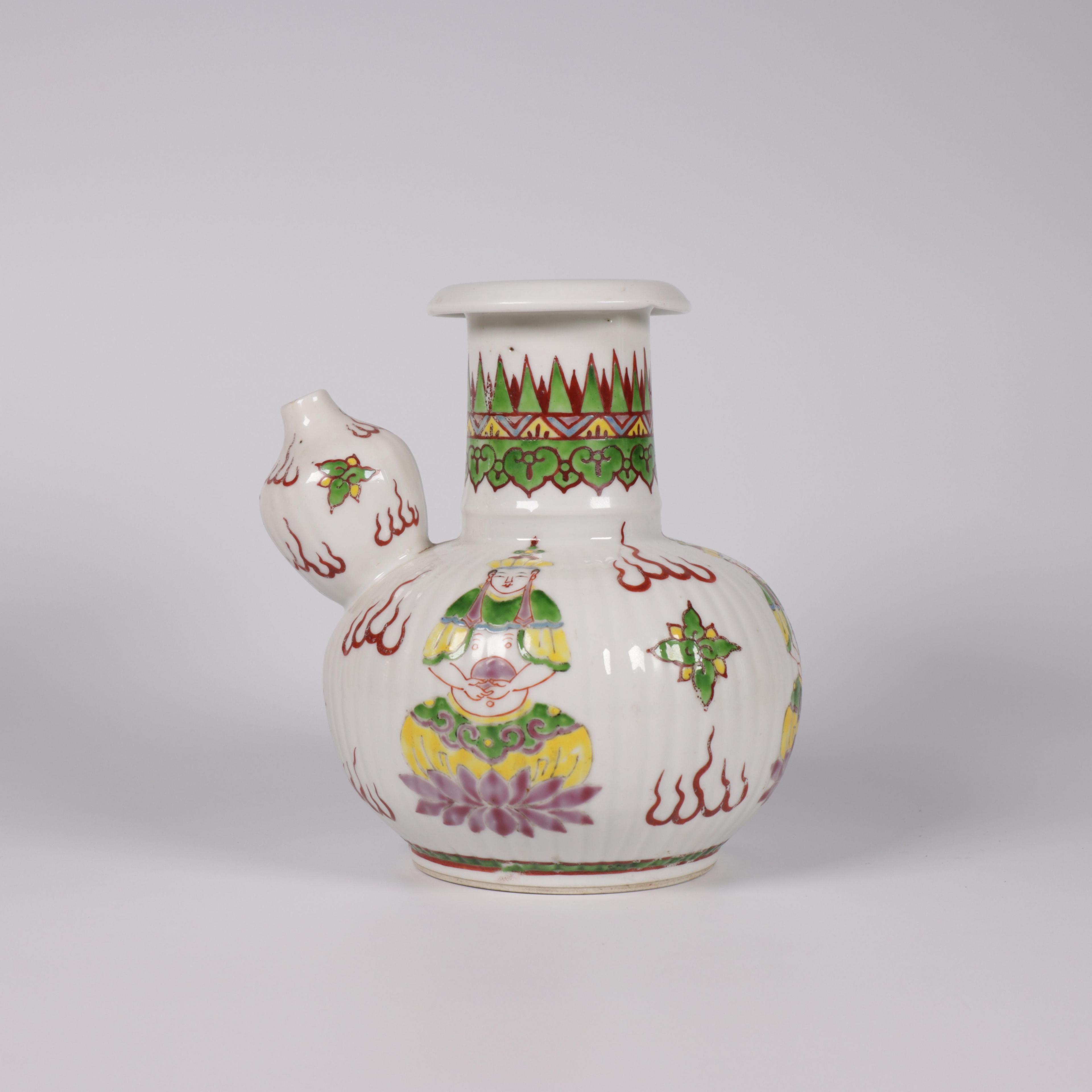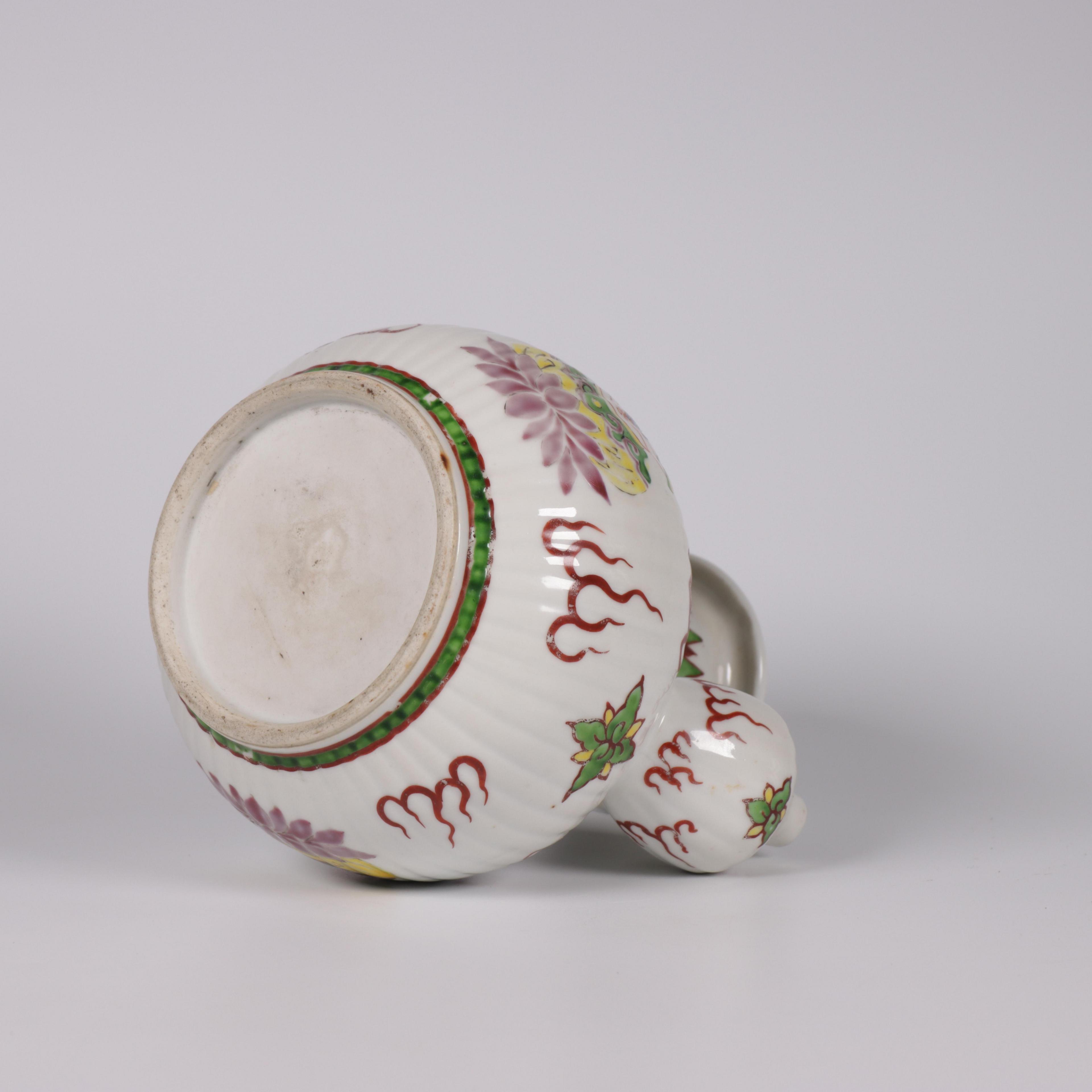 moulded with ribbed sides and painted with figures of Buddha seated on a lotus, surrounded by stylised flowers and cloud scrolls (grazed chip to spout, some wear and flakes to the enamels)