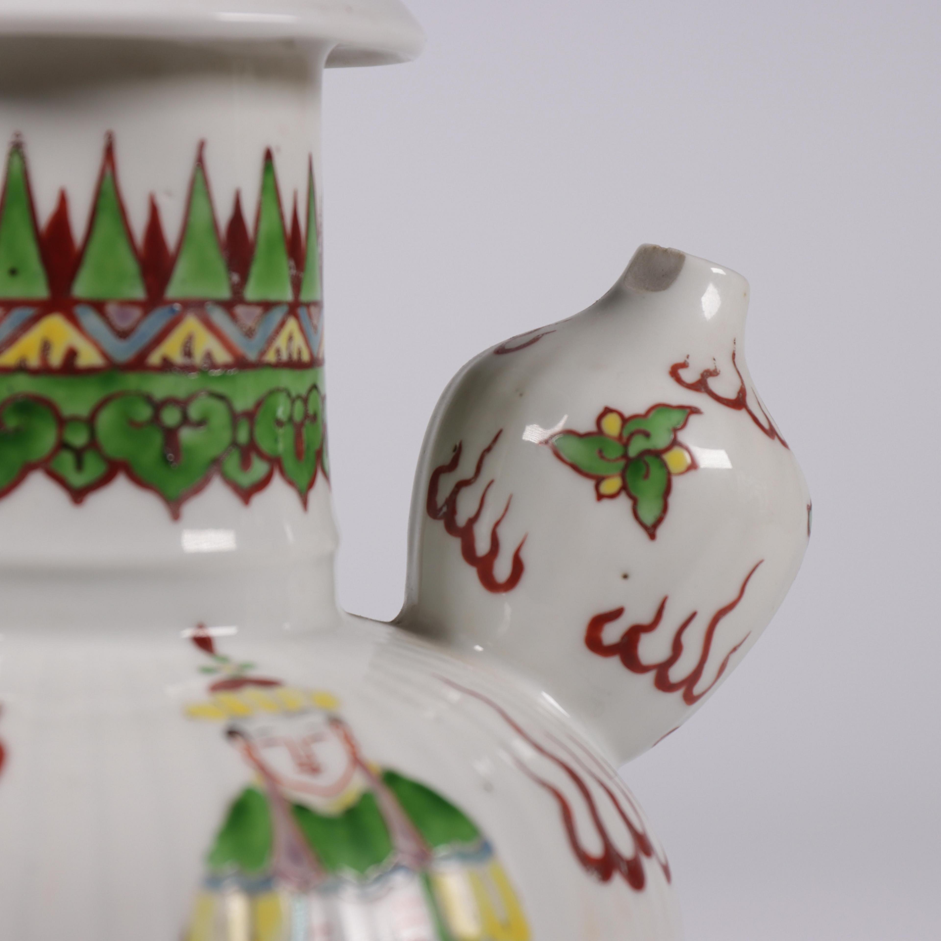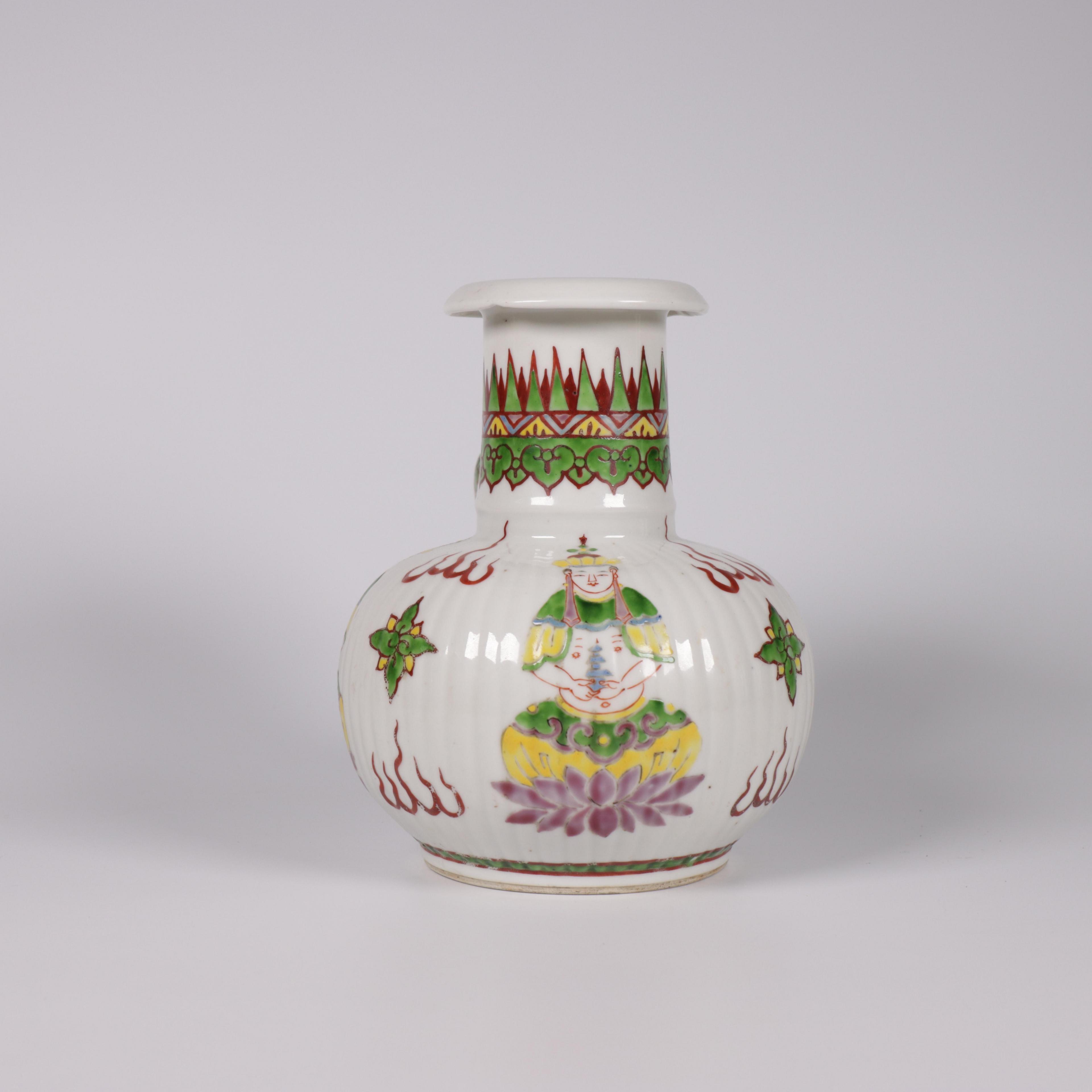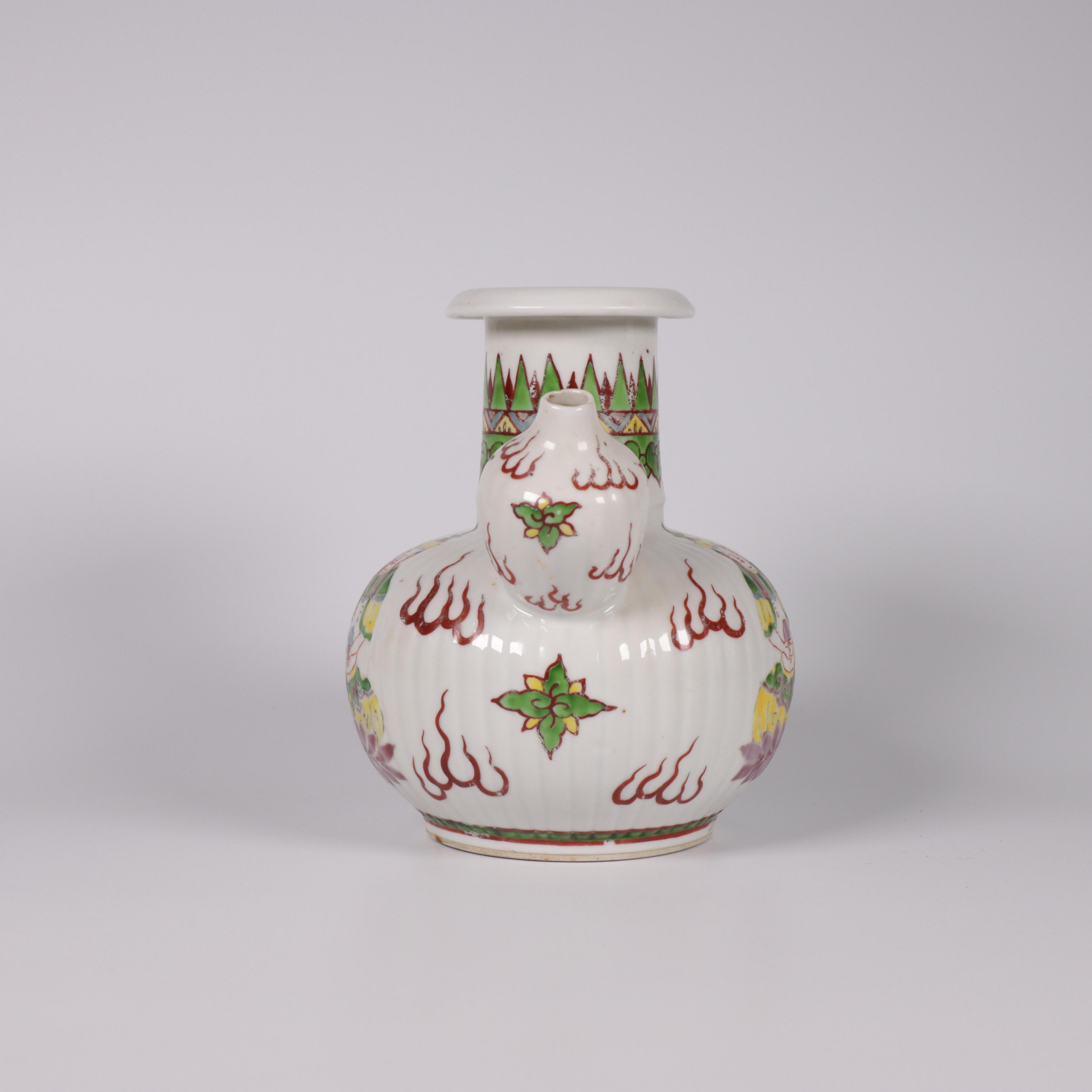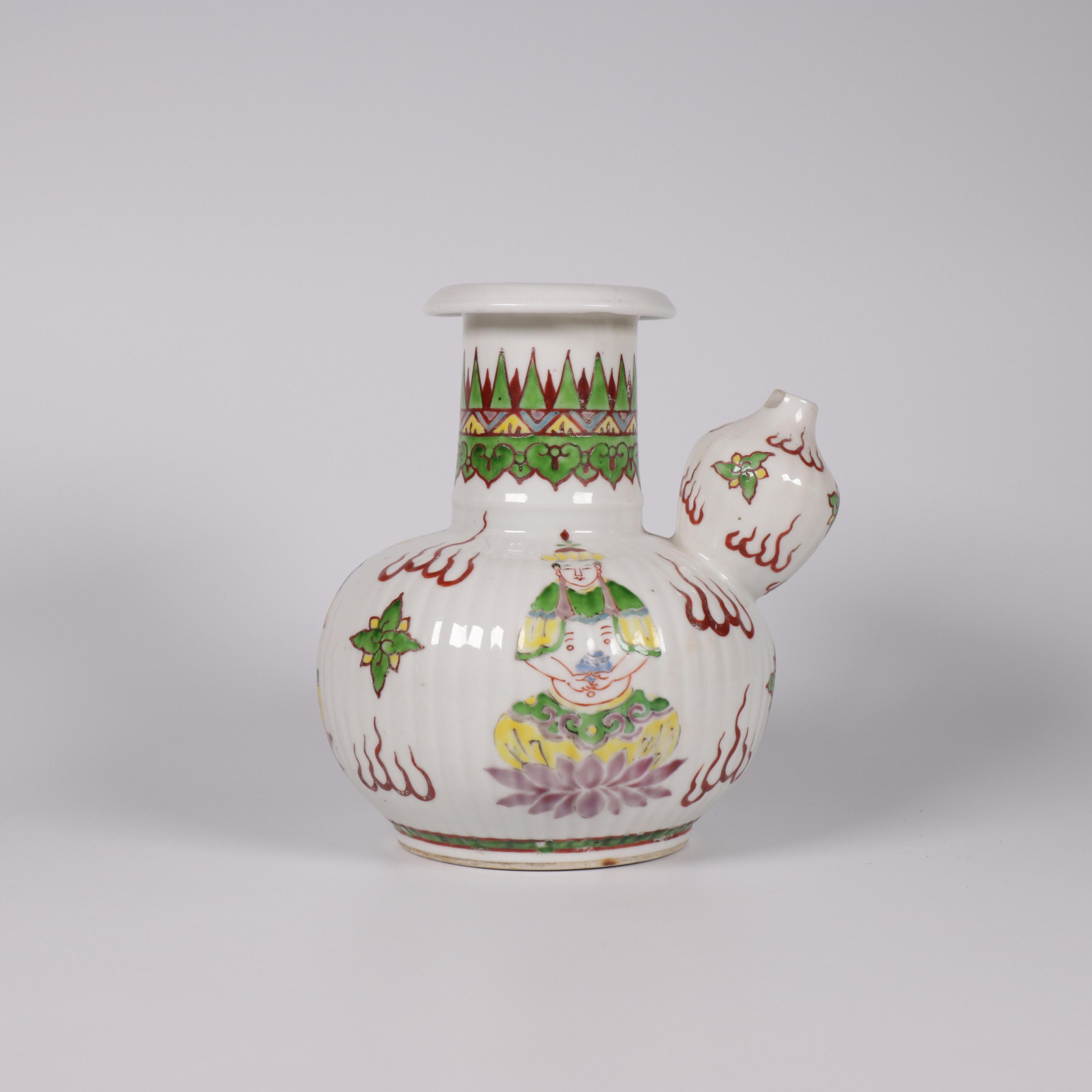 moulded with ribbed sides and painted with figures of Buddha seated on a lotus, surrounded by stylised flowers and cloud scrolls (grazed chip to spout, some wear and flakes to the enamels)