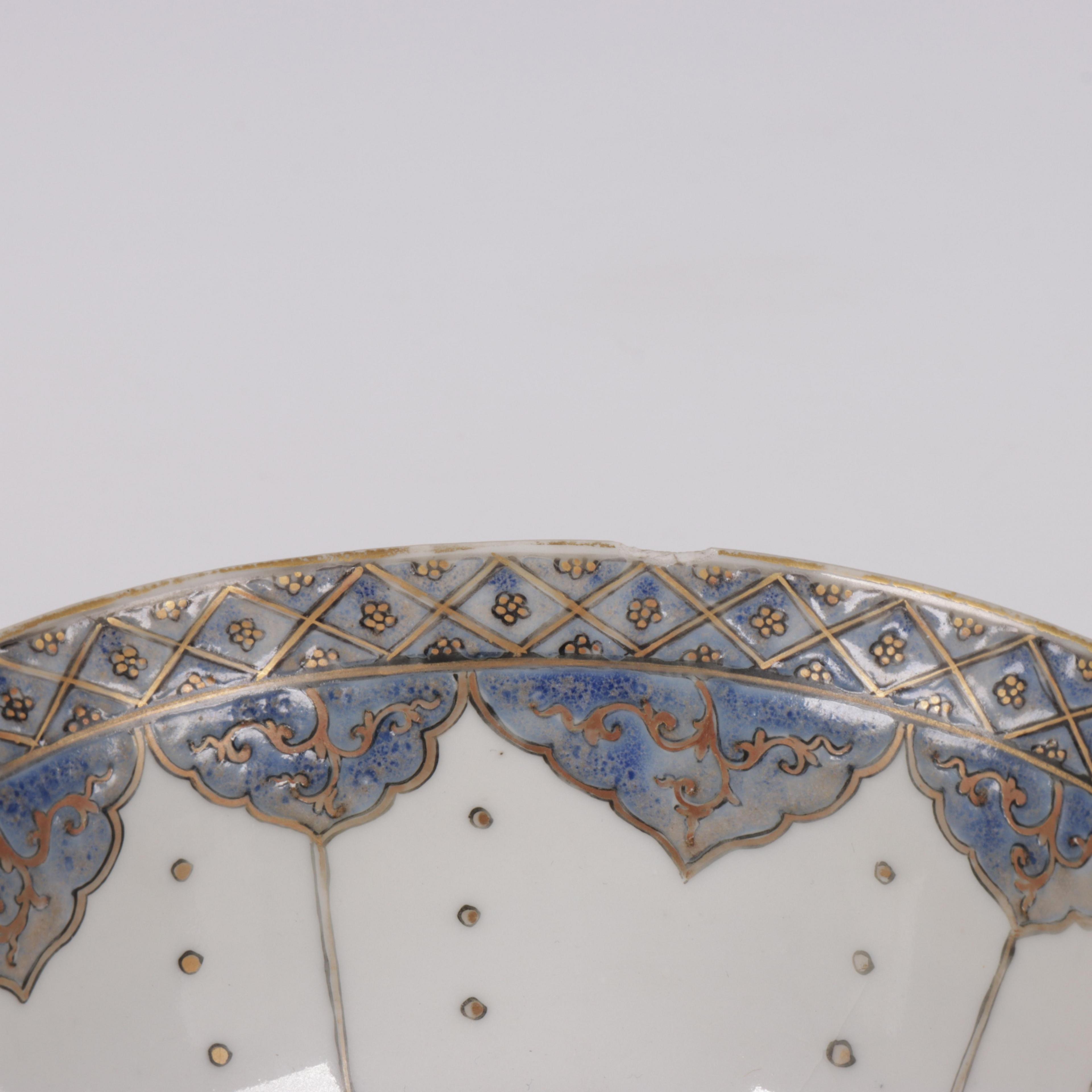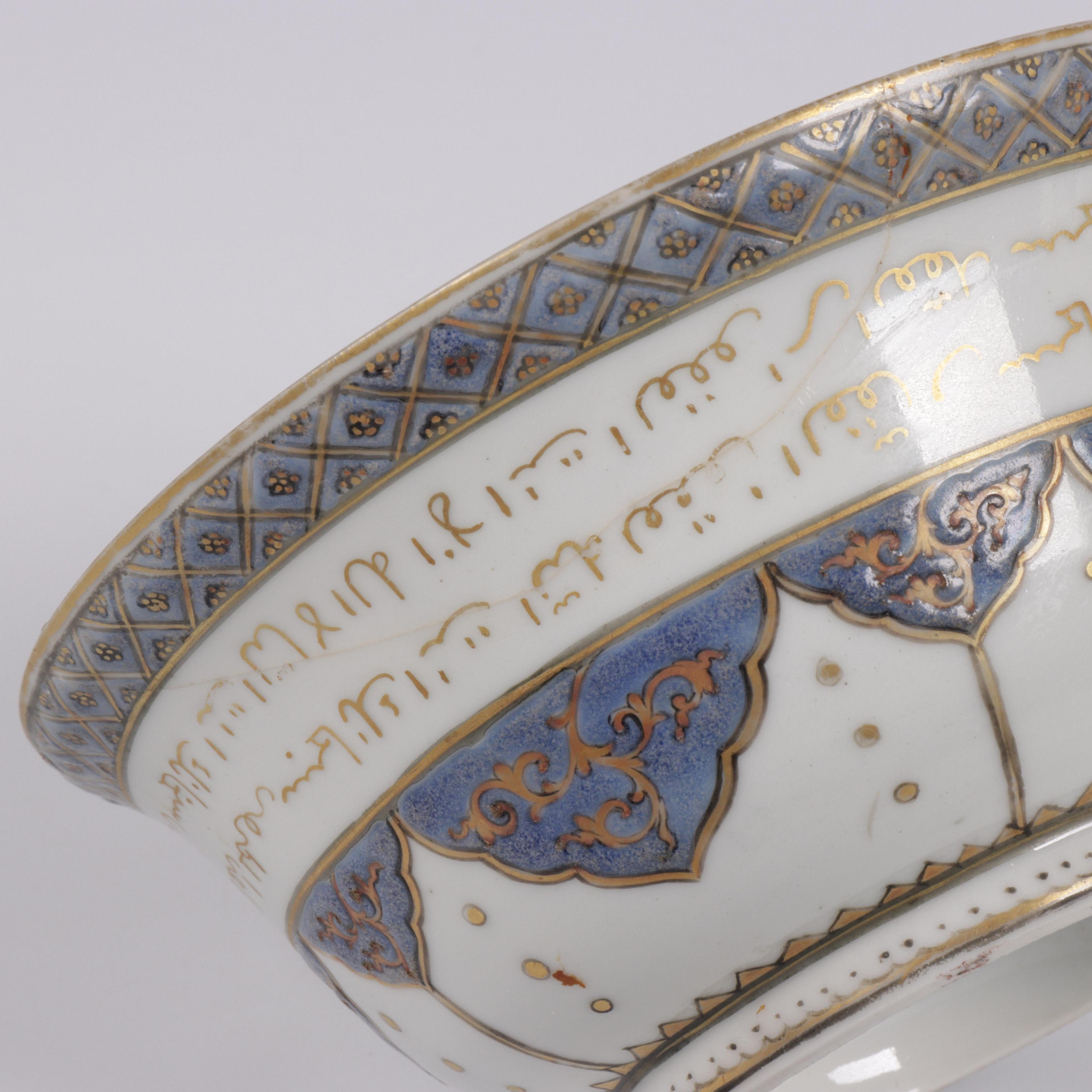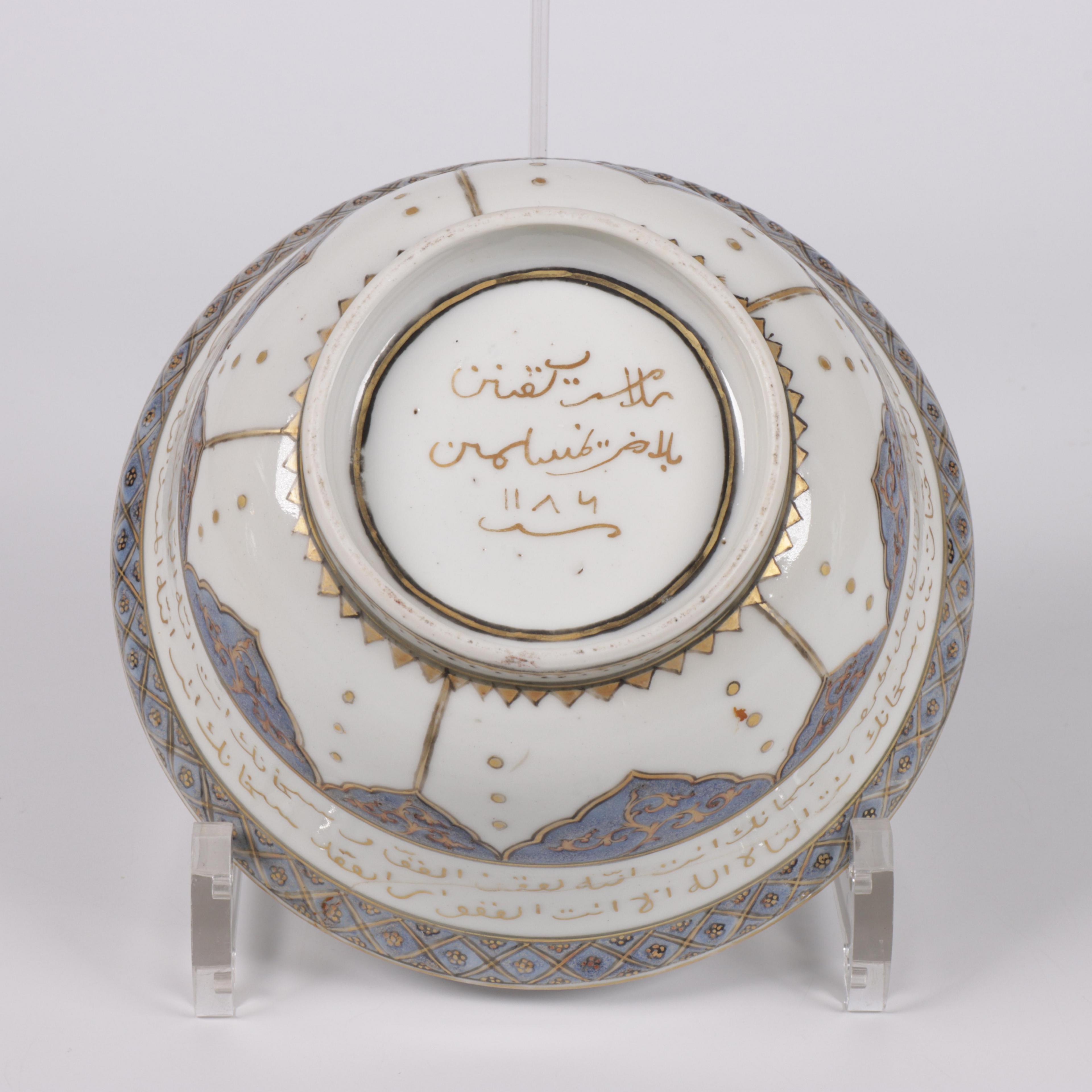 inscribed to the exterior and base with lines of Arabic calligraphy between decorative bands (reglued chip of ca. 10 x 4 cm, minor surface wear and rubbing to the gilt as may be expected)