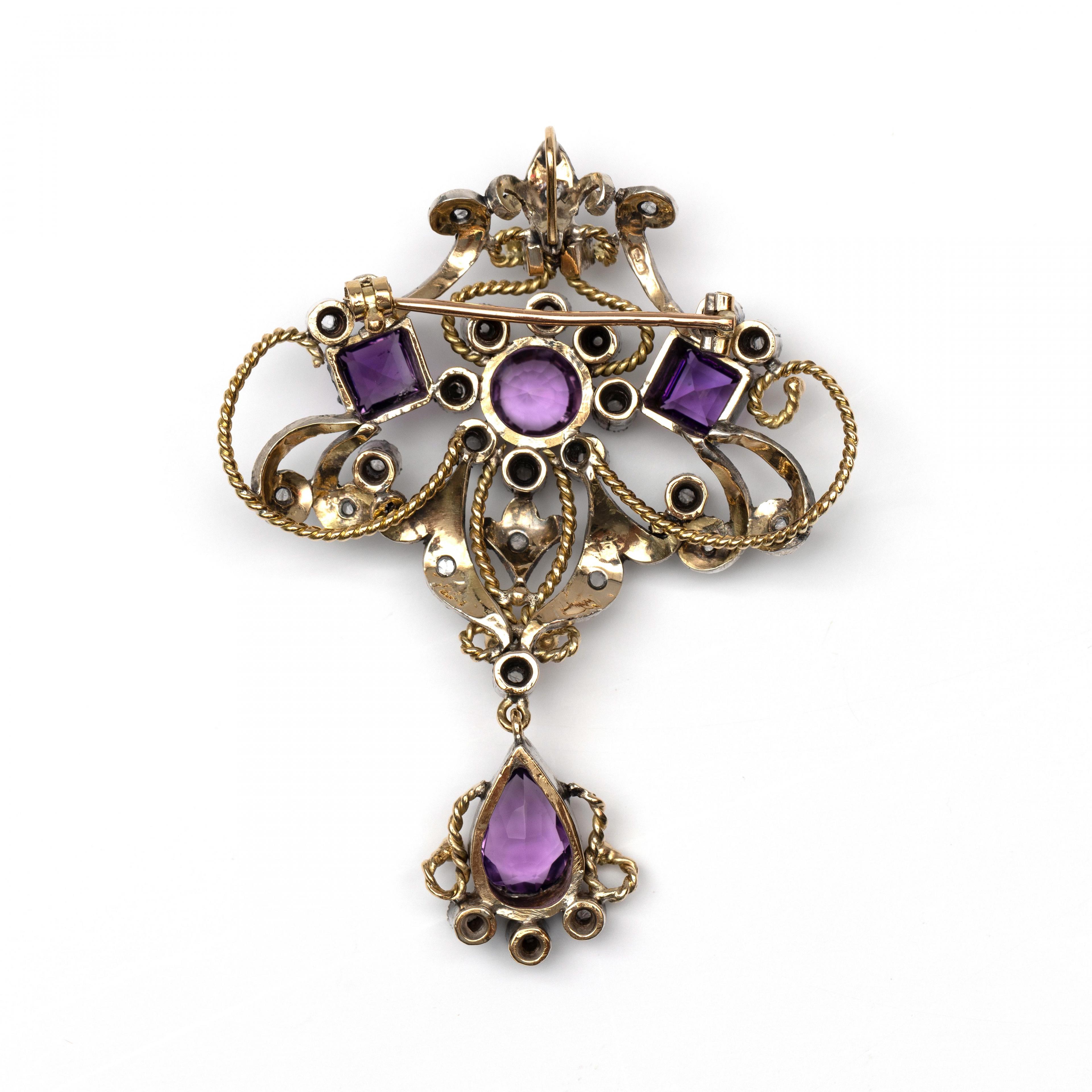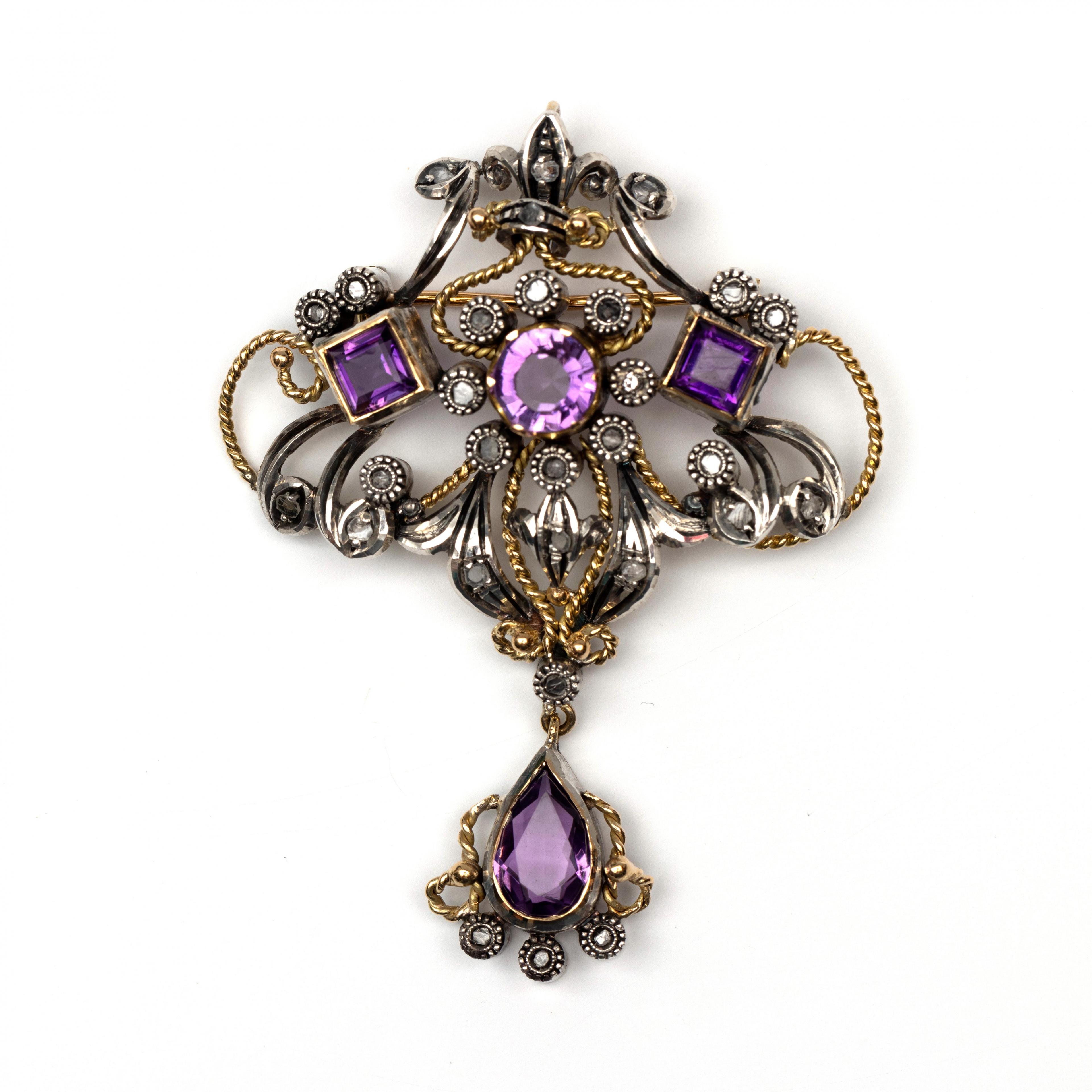 18 k. Gold and silver brooch / pendant. Richly decorated with curl motifs. Set with two square cut, one round faceted and one drop-shaped faceted amethyst and small rose-cut diamonds. Import mark Homberg Firm, Amsterdam, 1966 - 1996