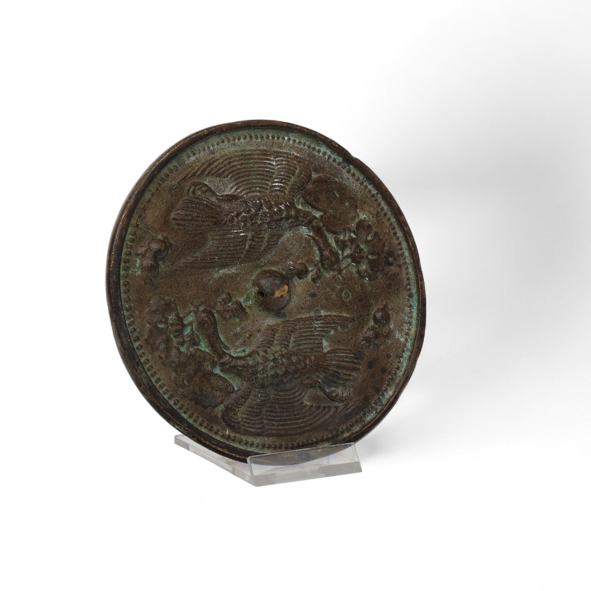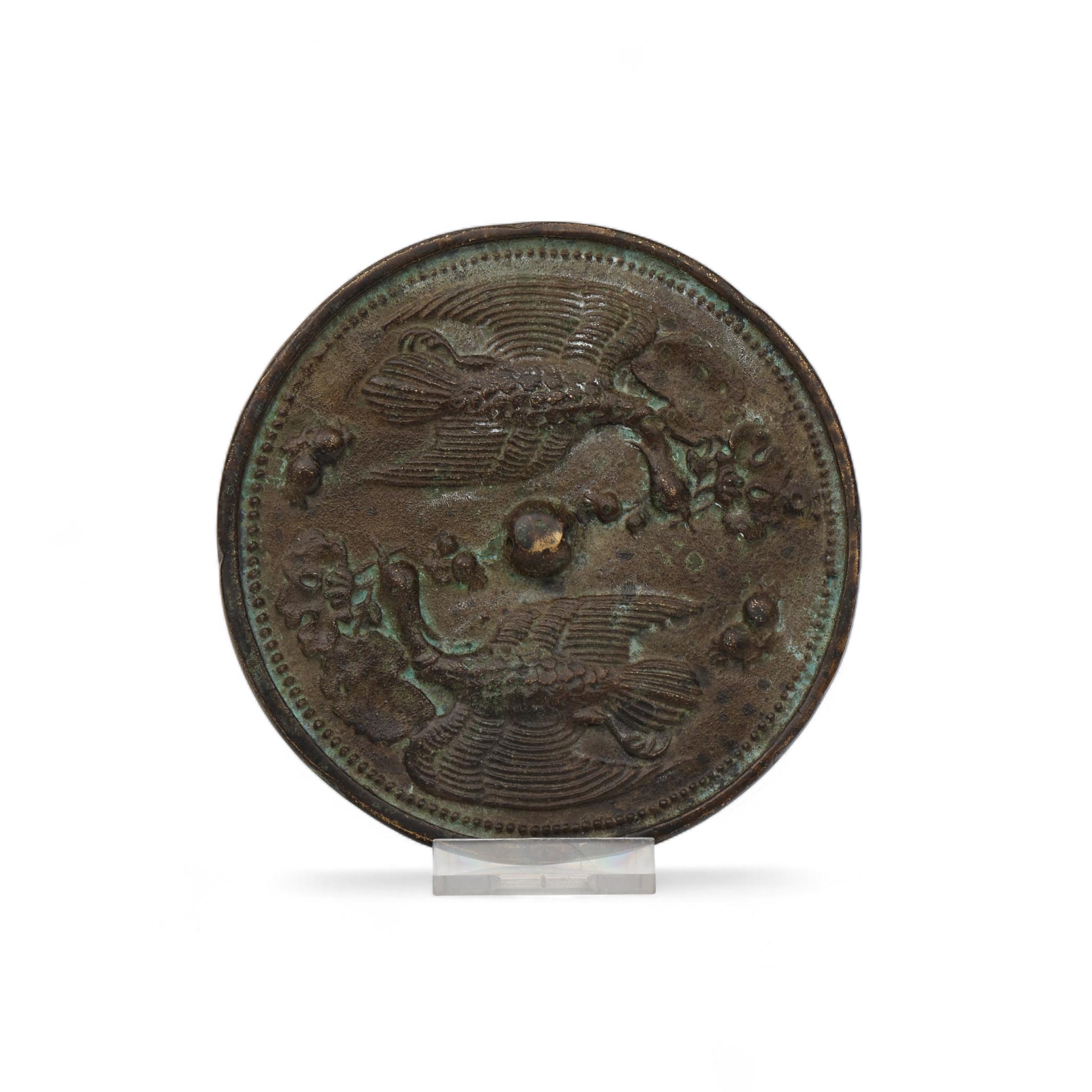 the circular plaque modelled in relief with two geese carrying flowers in their beaks (some wear)