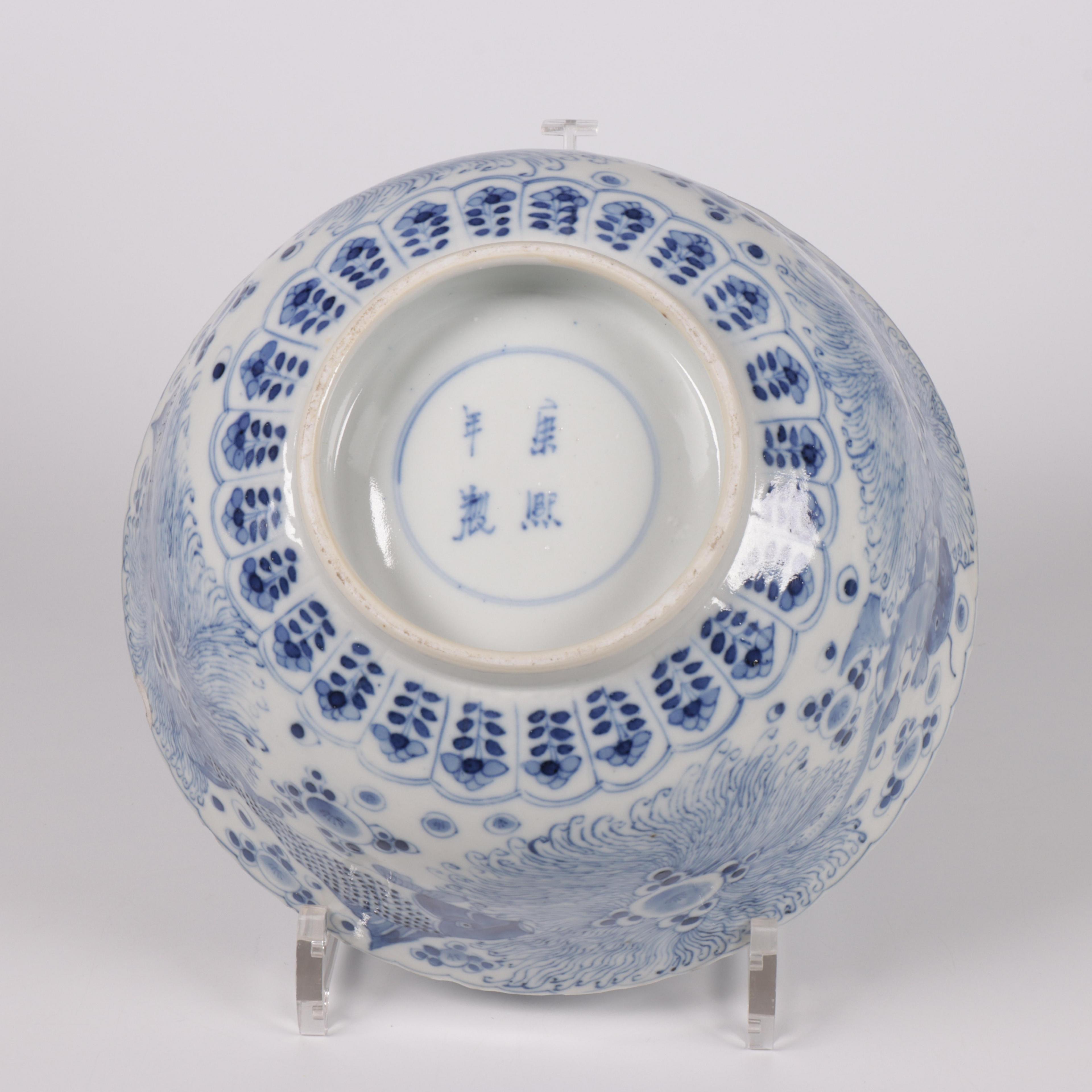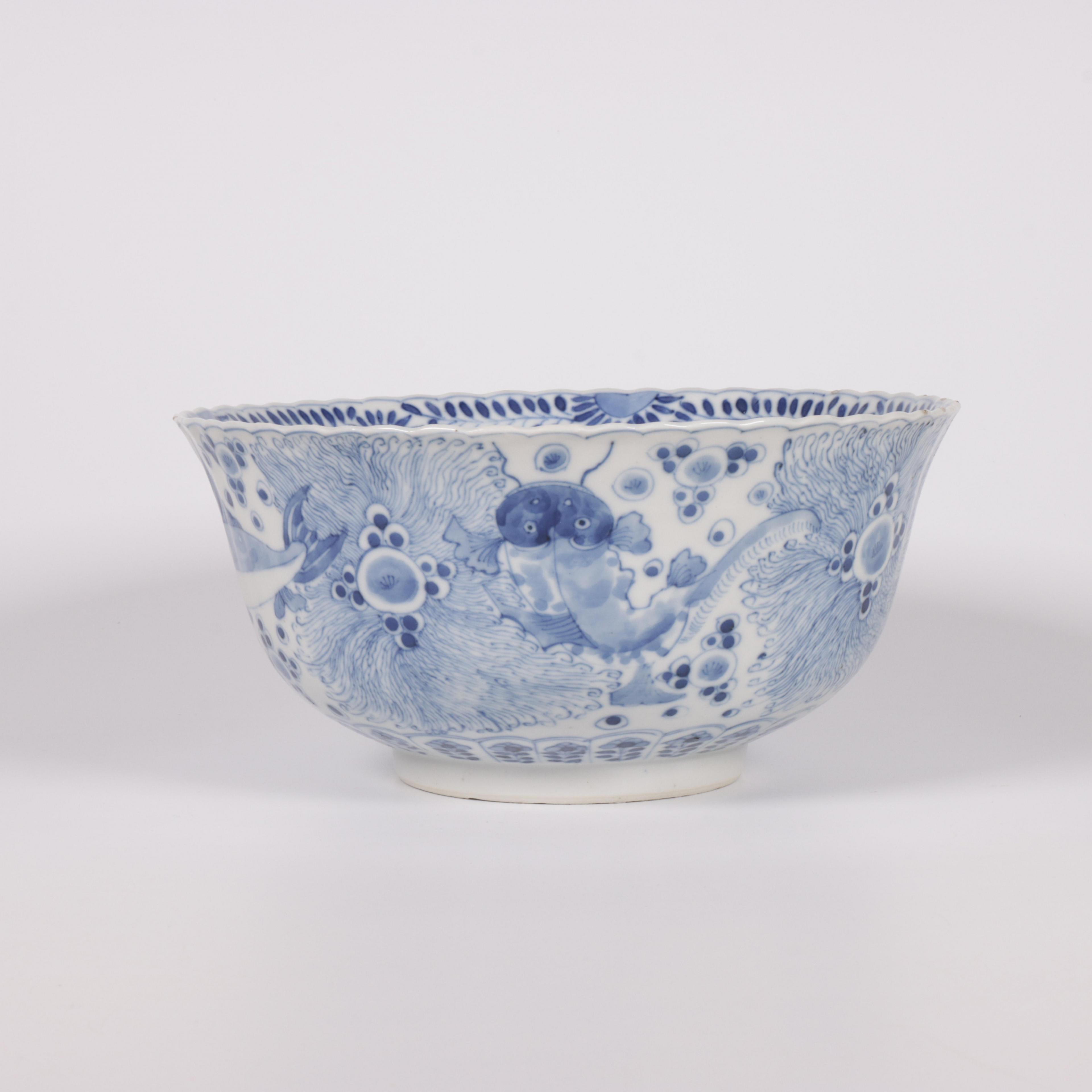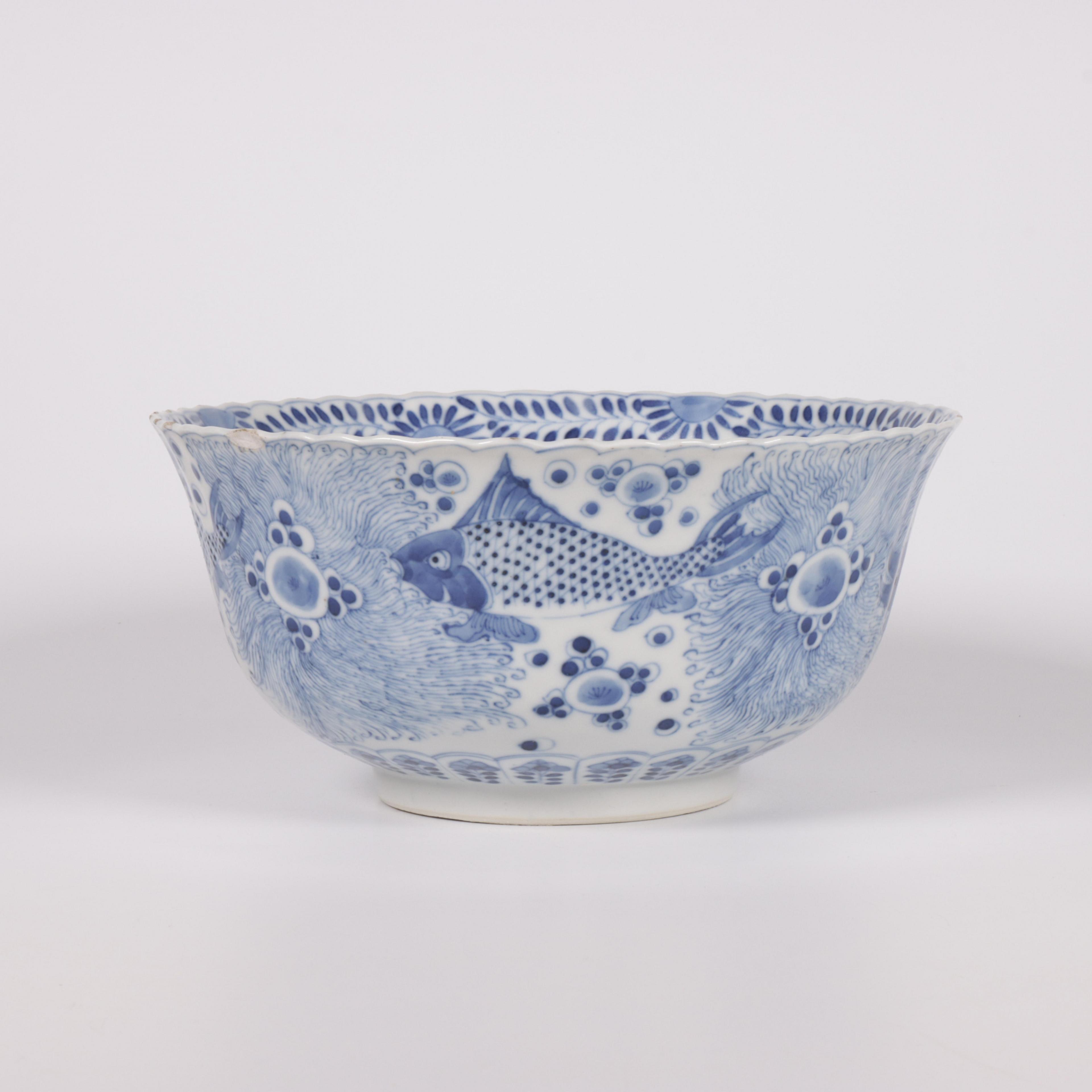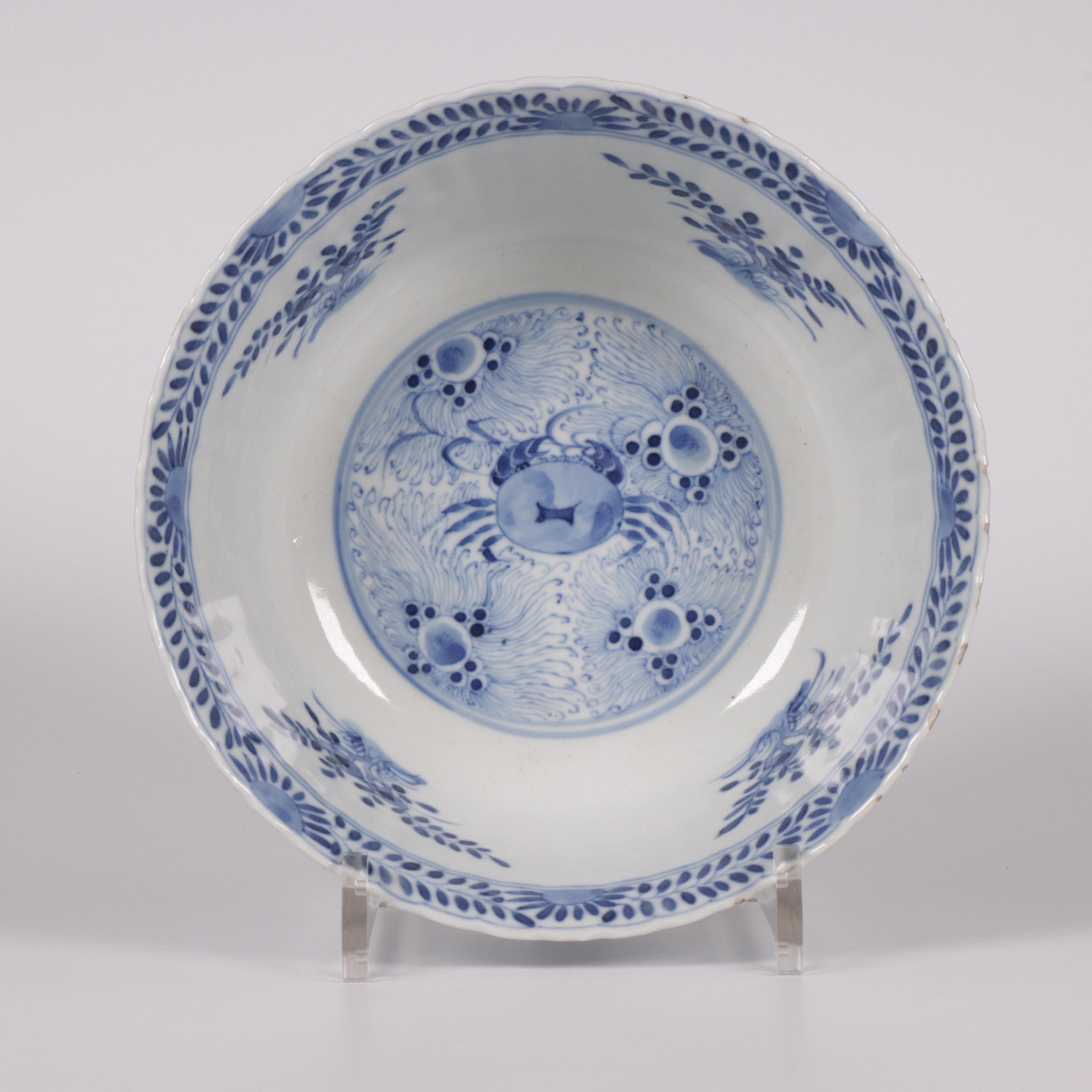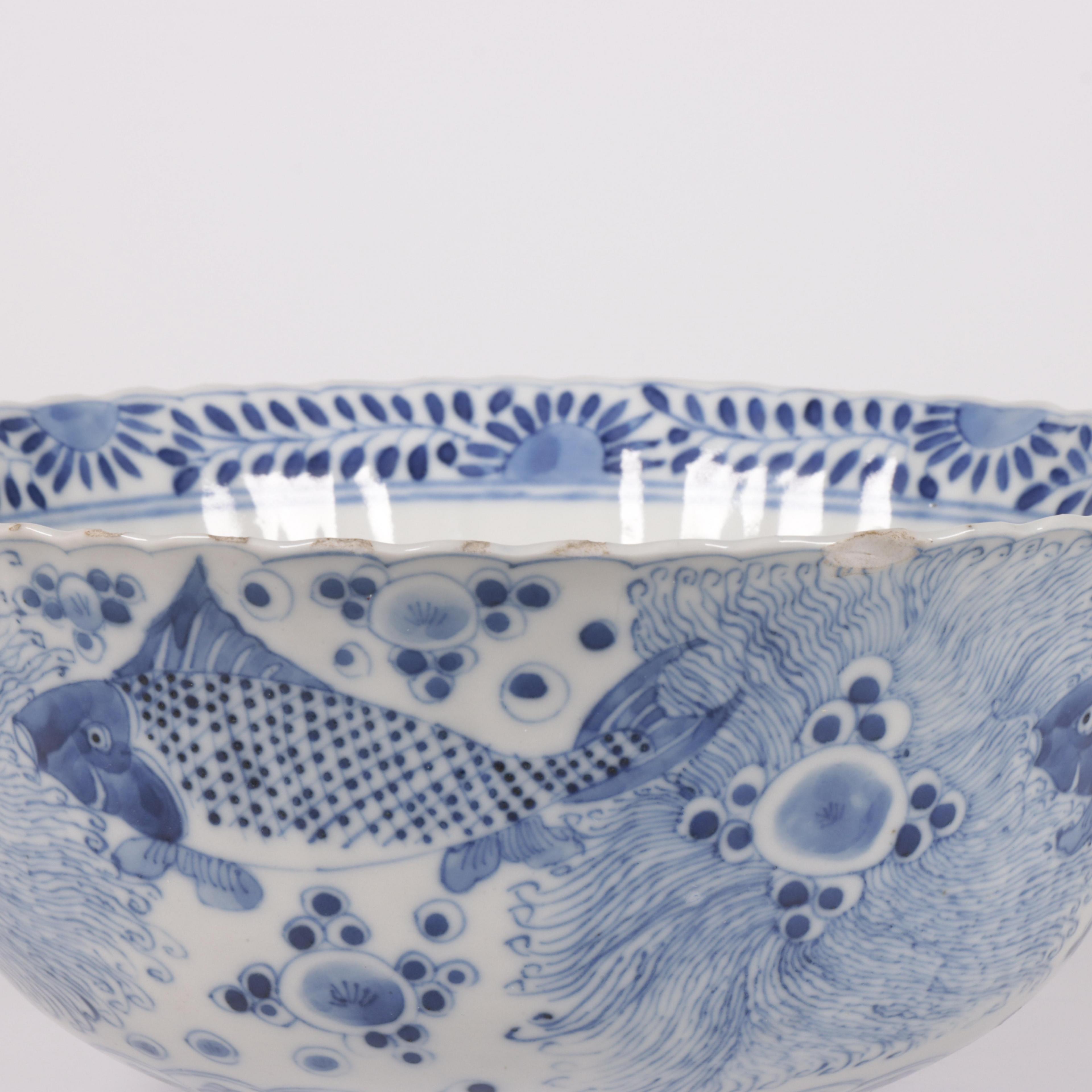 the exterior painted with various types of fish among waterweeds and the interior with a crab, the base has an apocryphal four-character mark (some small rim chips)