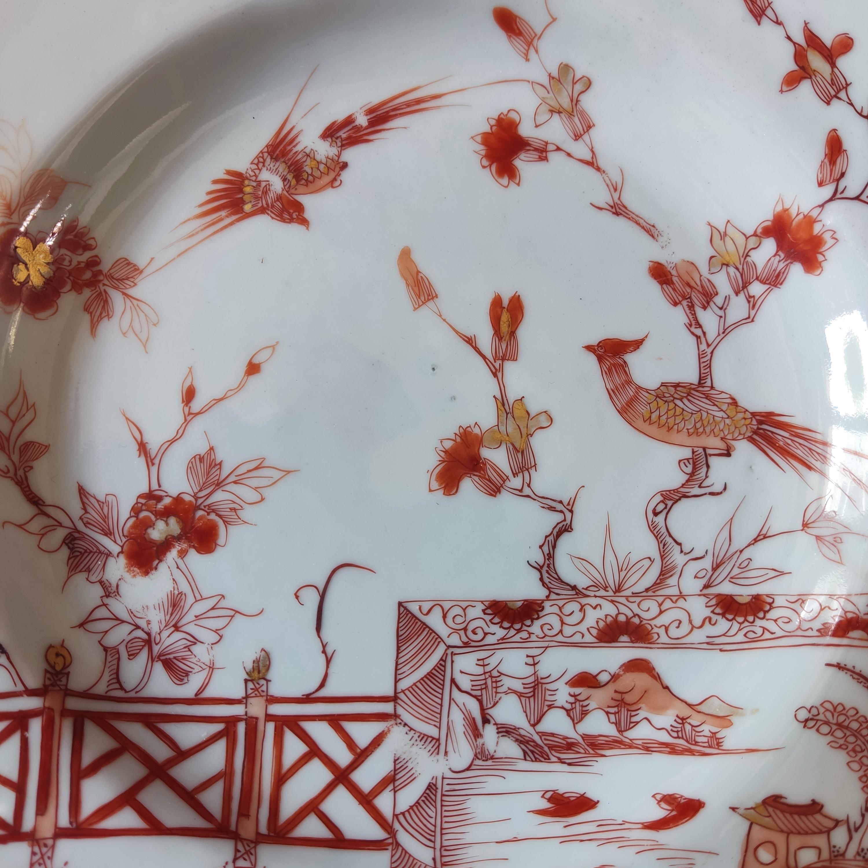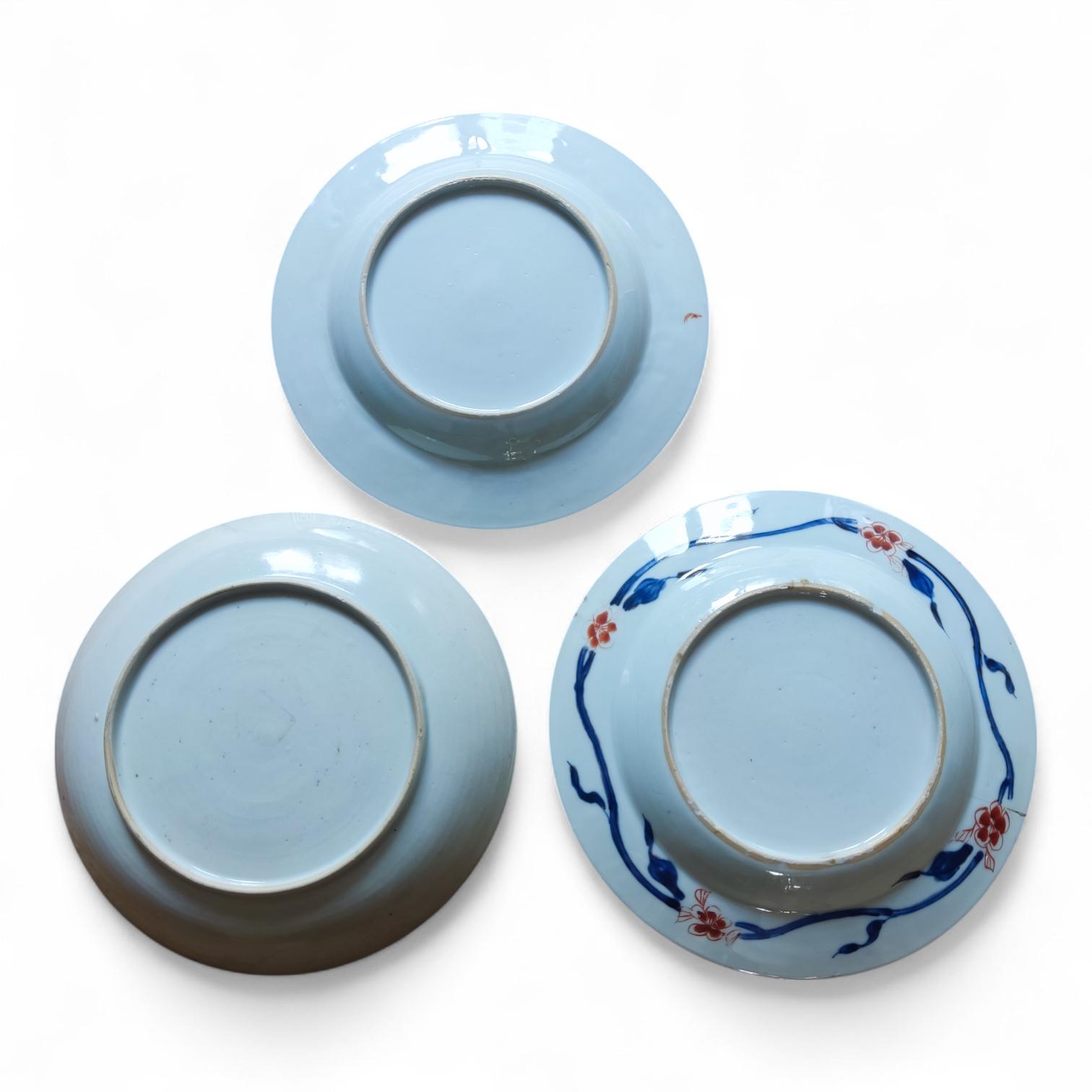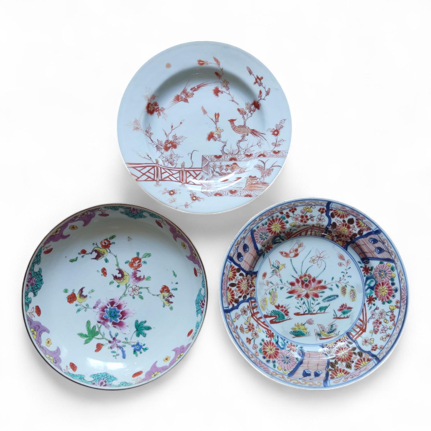 China, two famille rose and one iron-red-enamelled porcelain plate, 18th century,