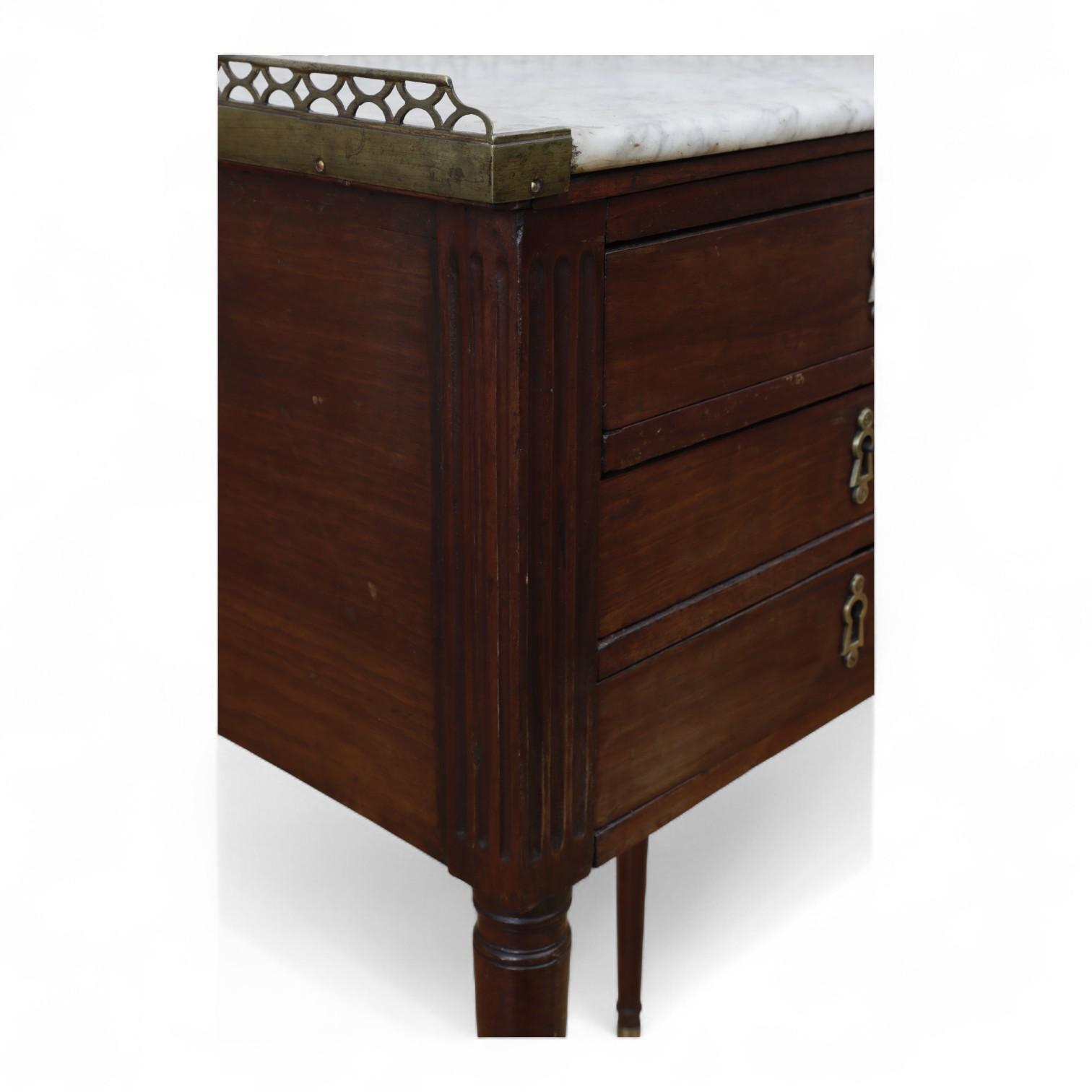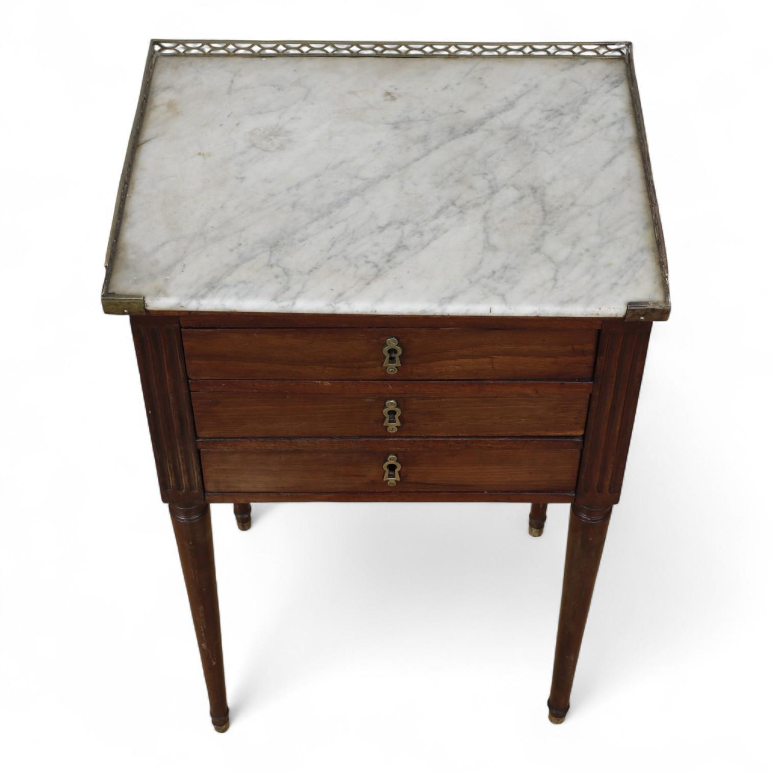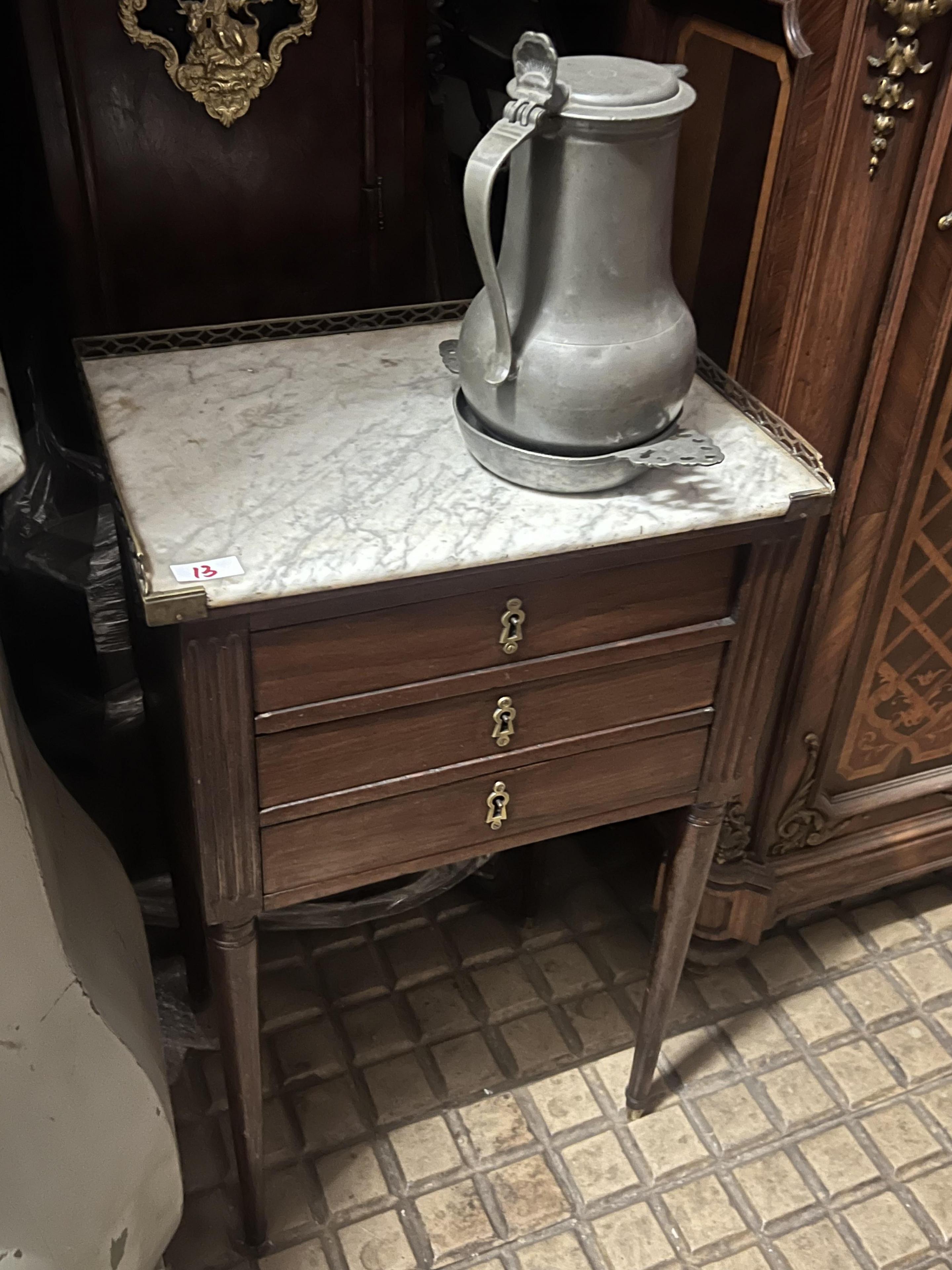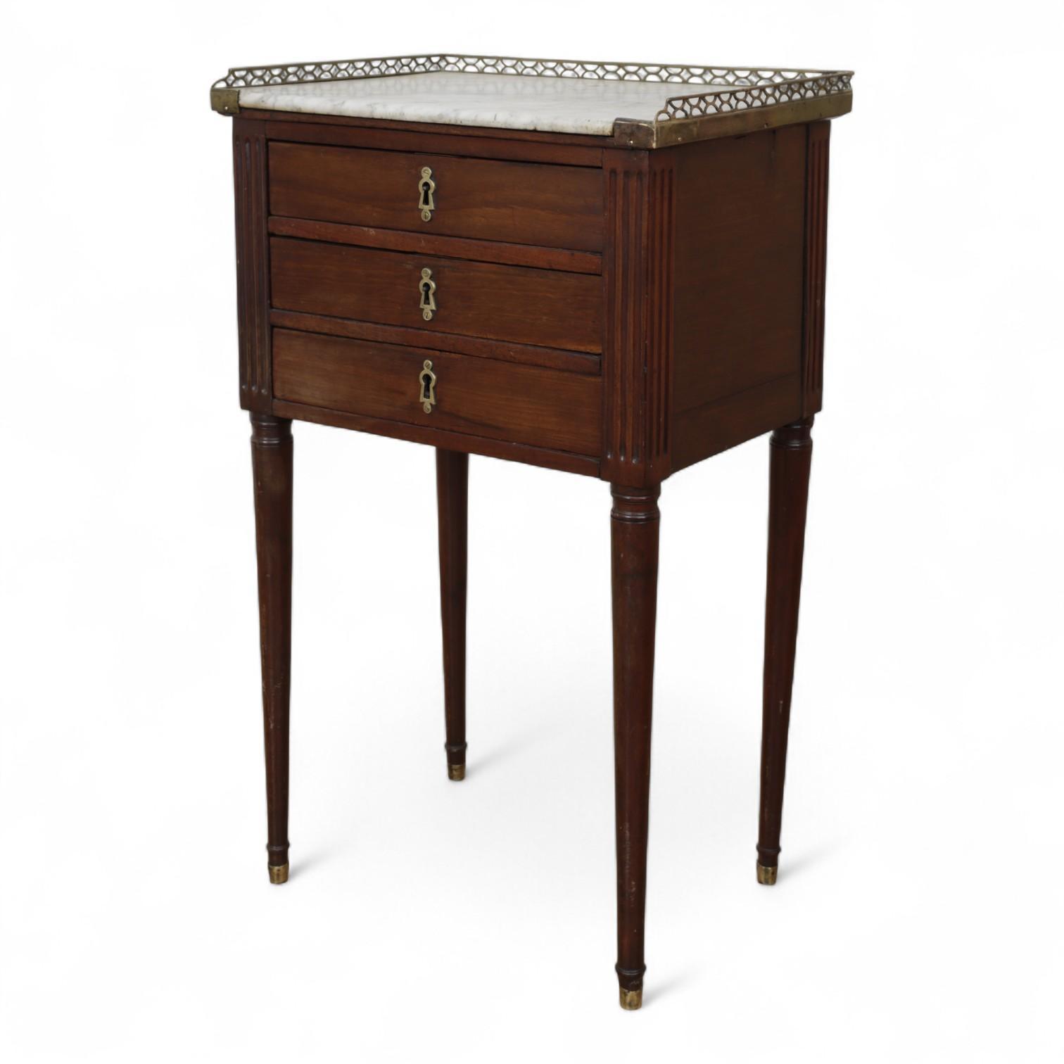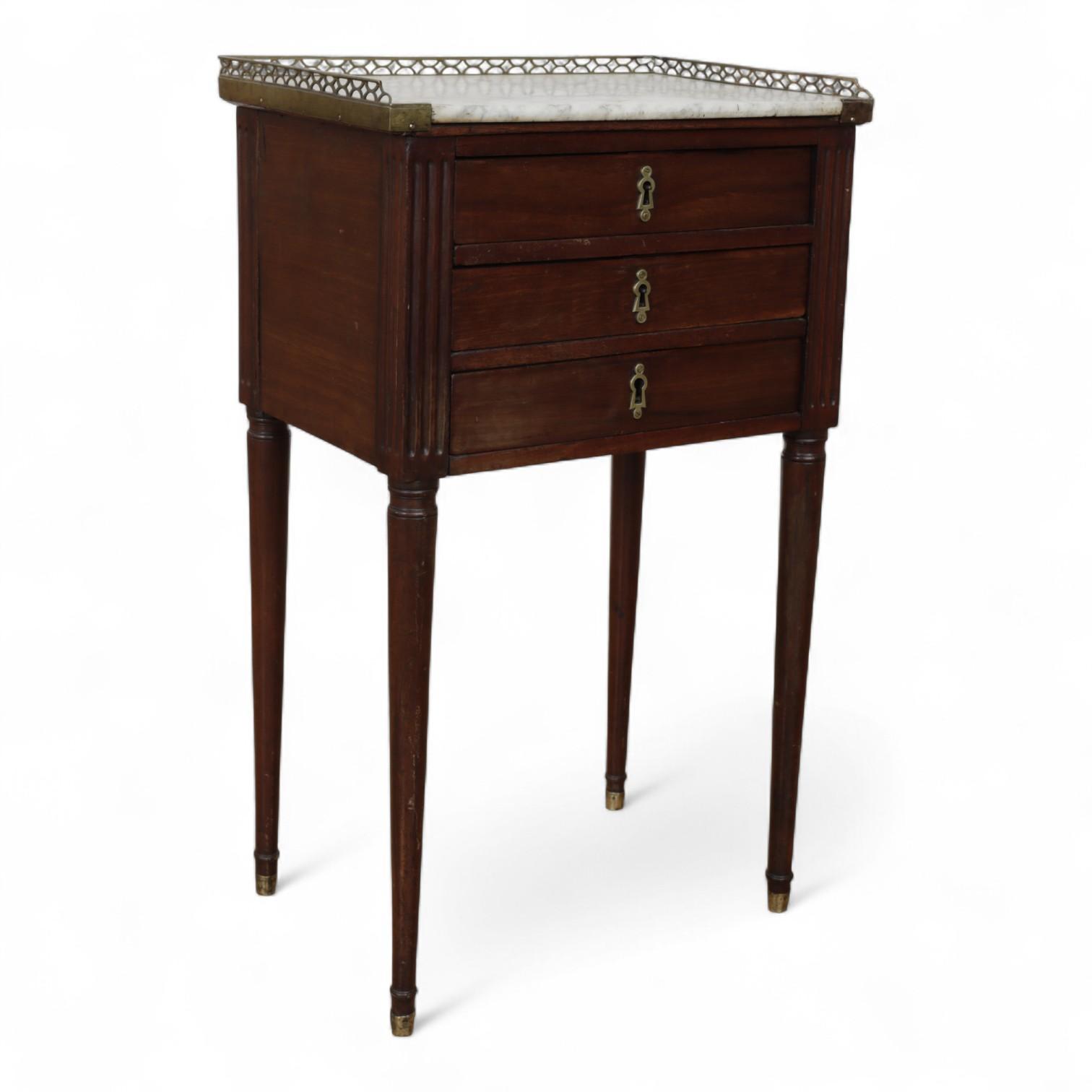 met Carrara marmeren blad en messing hekwerk. In het front drie laden, ieder met messing slotplaatje