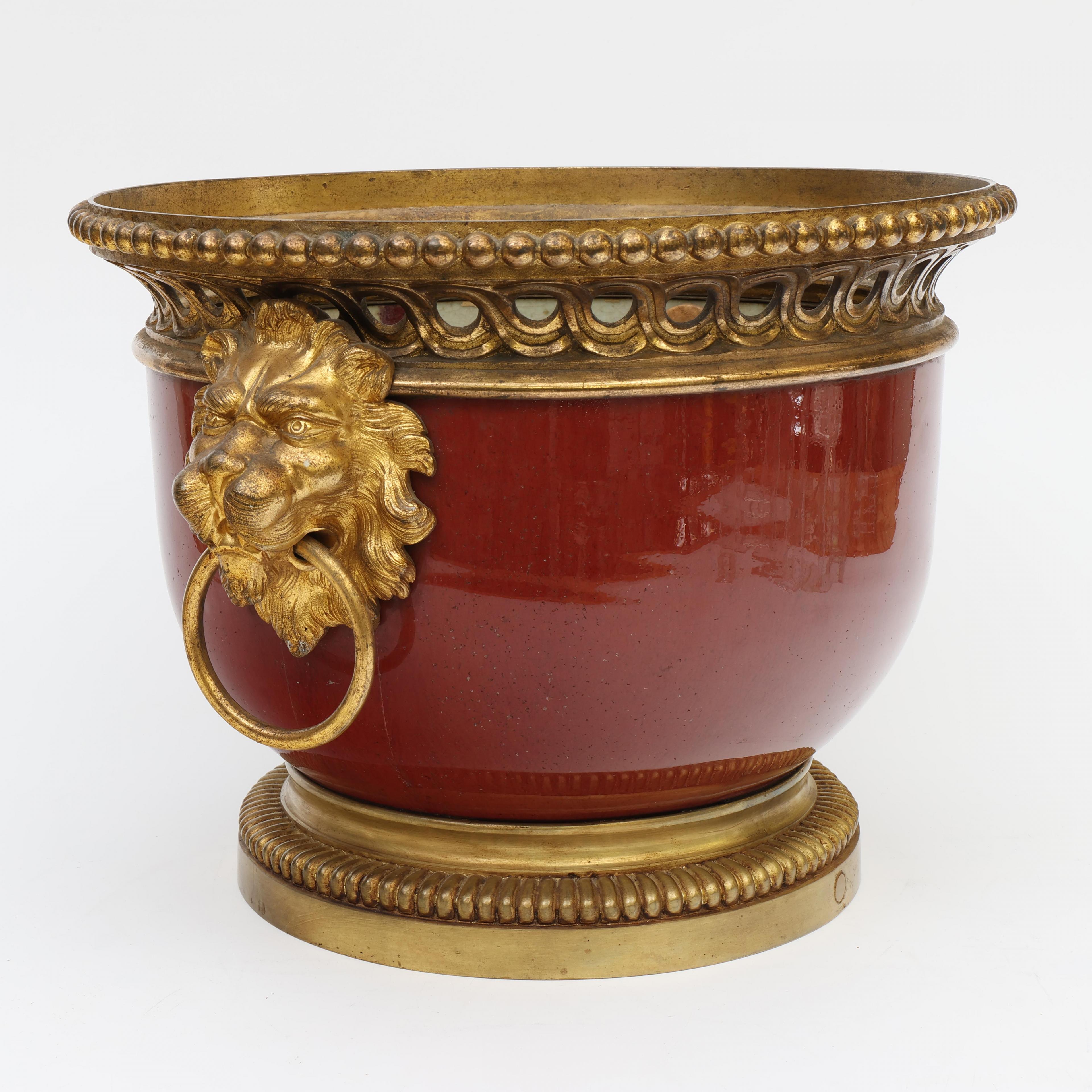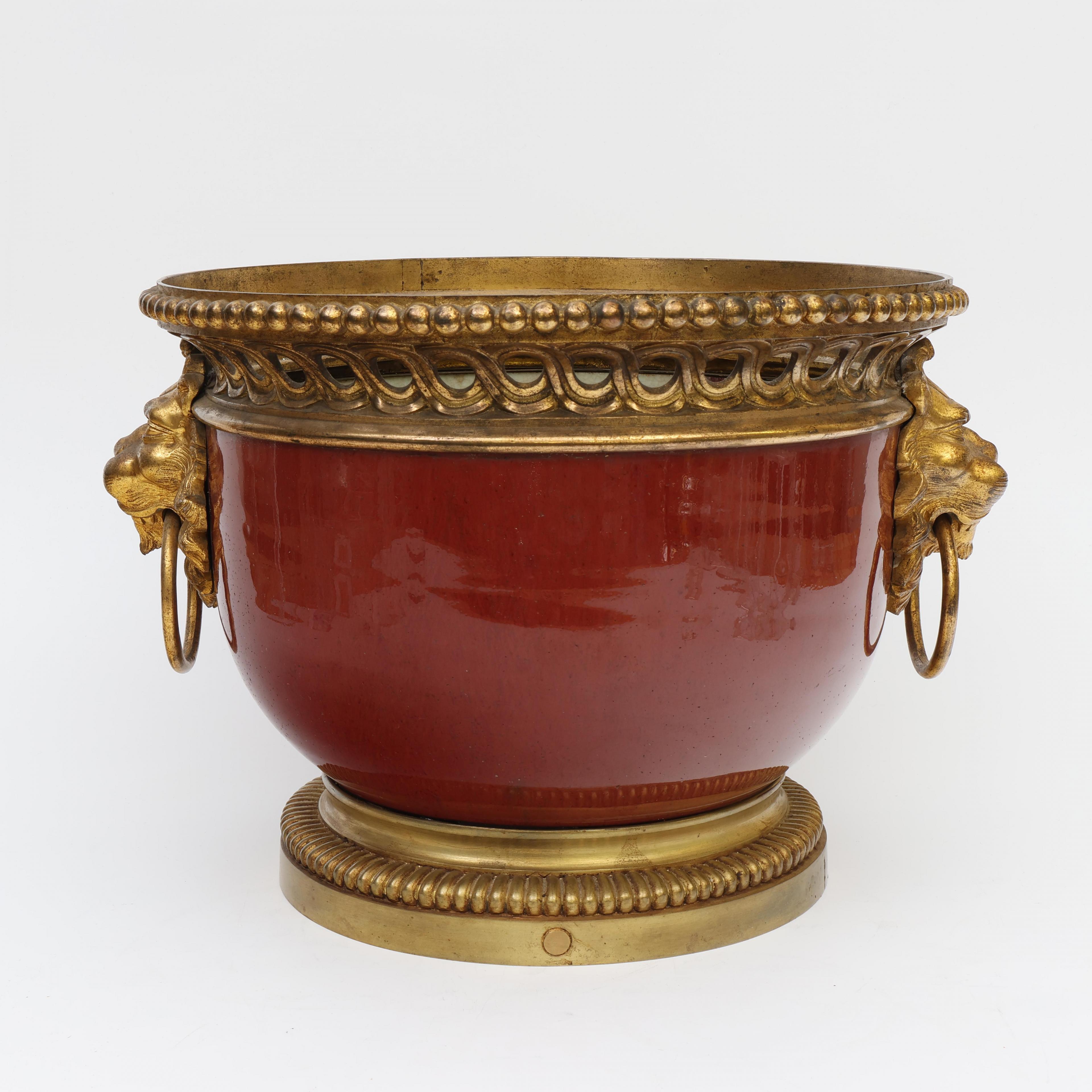 Uitgevoerd met vuurvergulde bronzen monturen, twee leeuwenmaskers. (drie scheuren in het porselein).