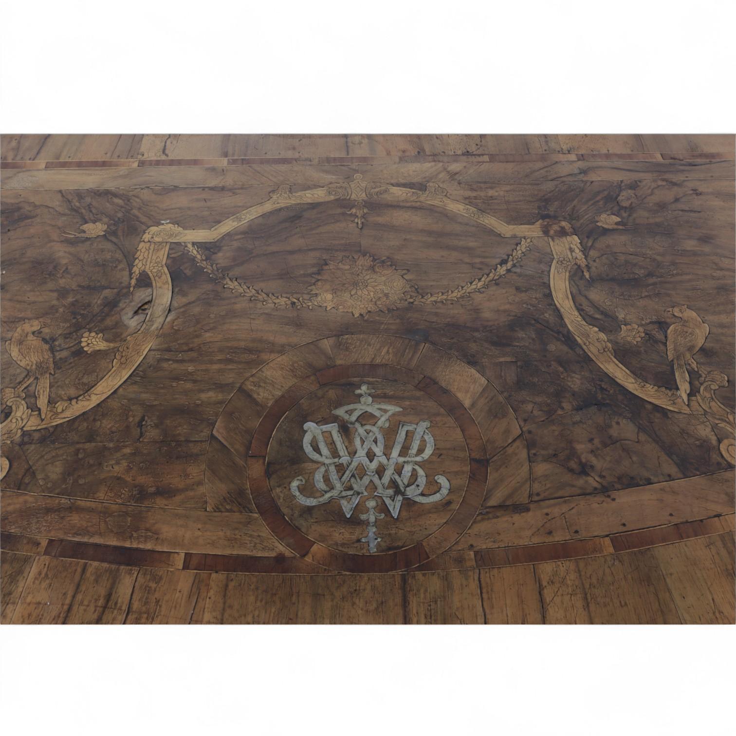 met in het gebogen front drie laden. Het geheel met nikkelen monogram, bieswerk en marqueterie van o.a. vogels, blad- en bloemranken