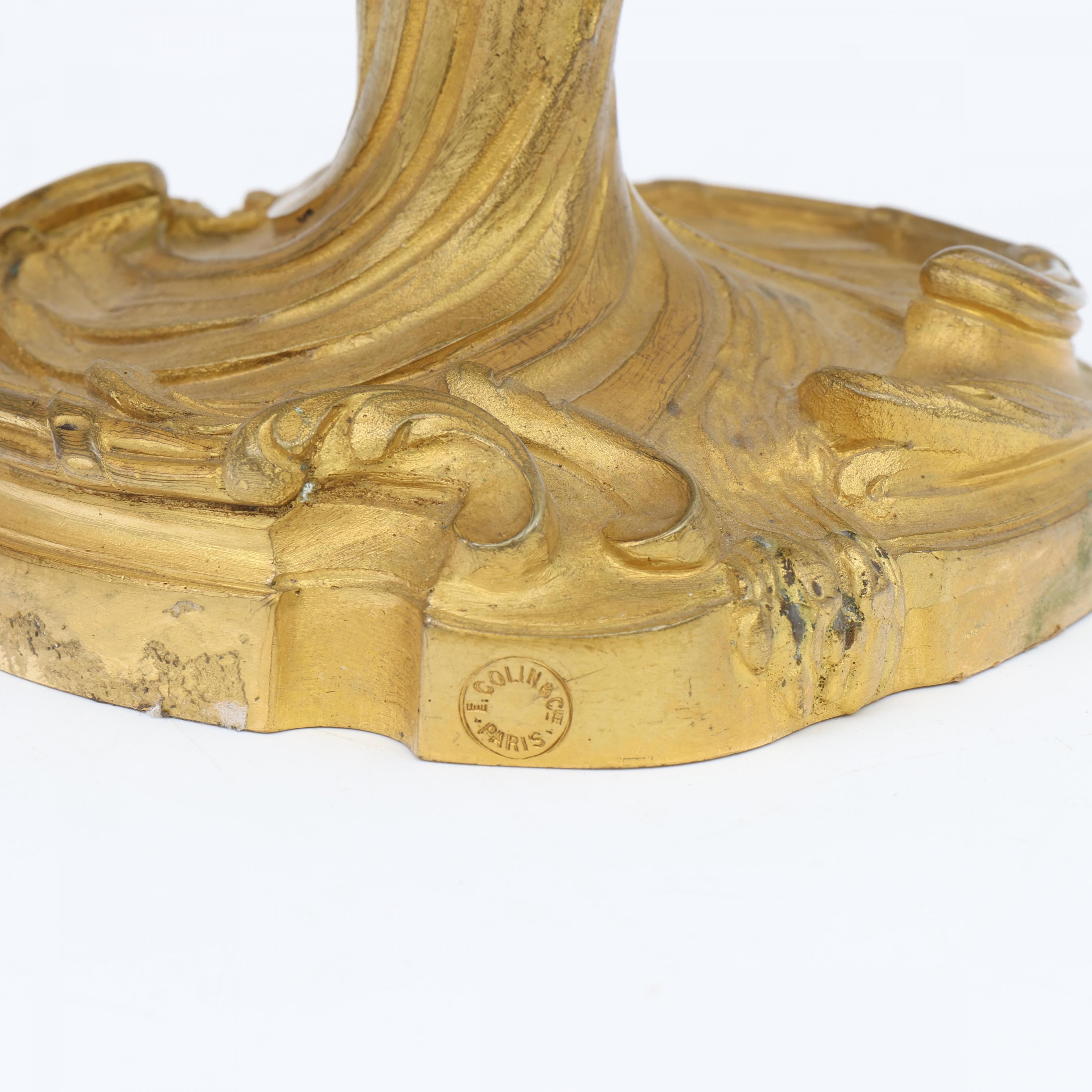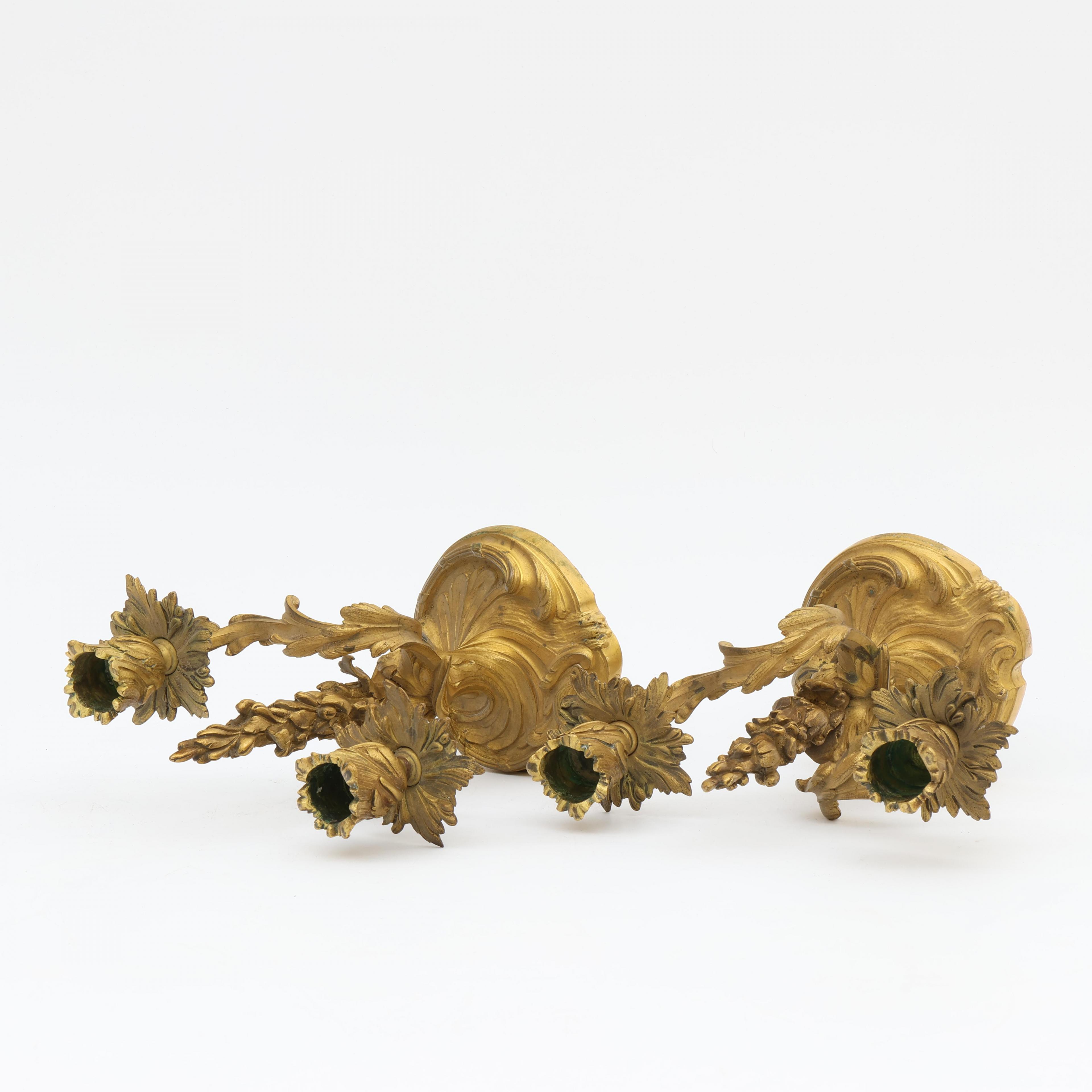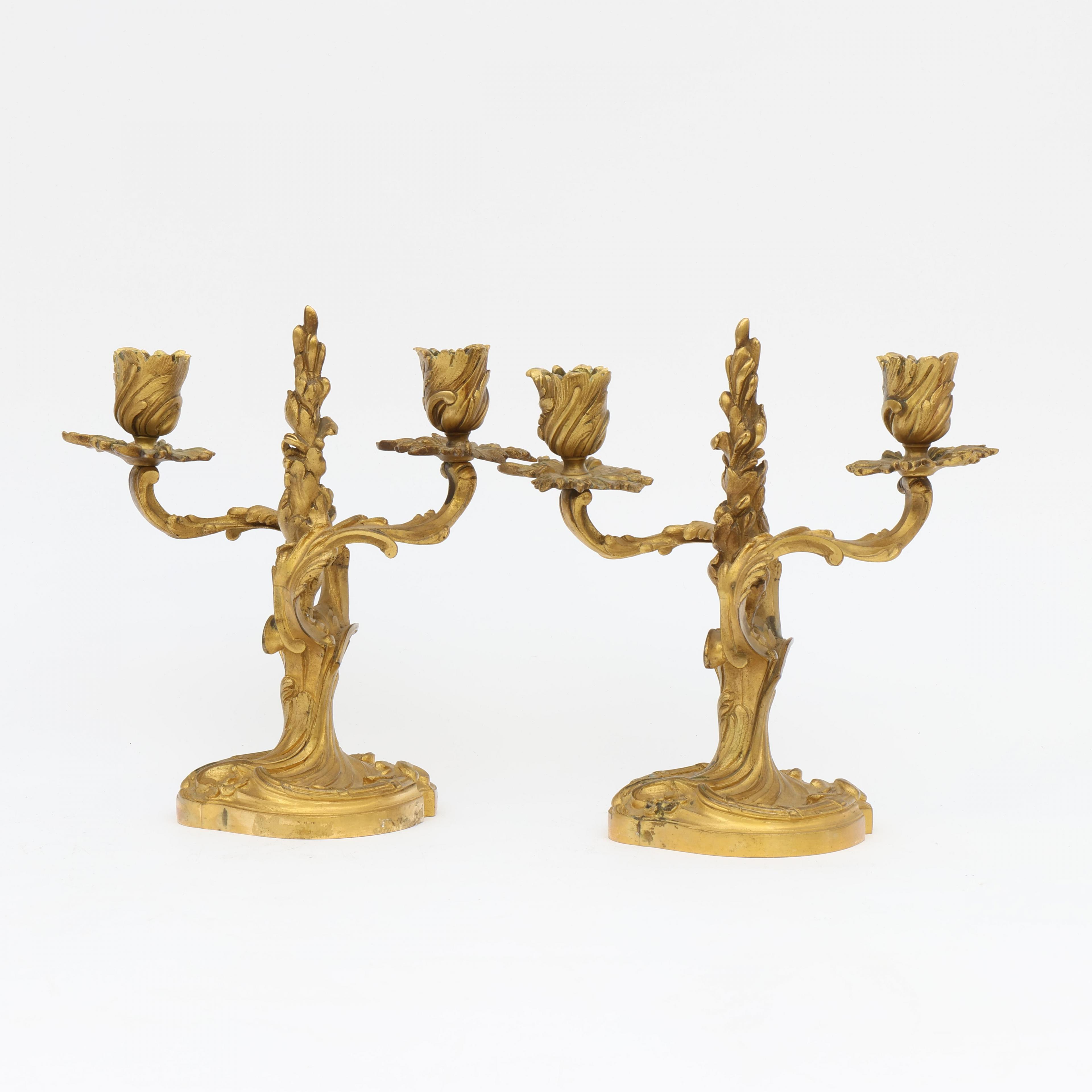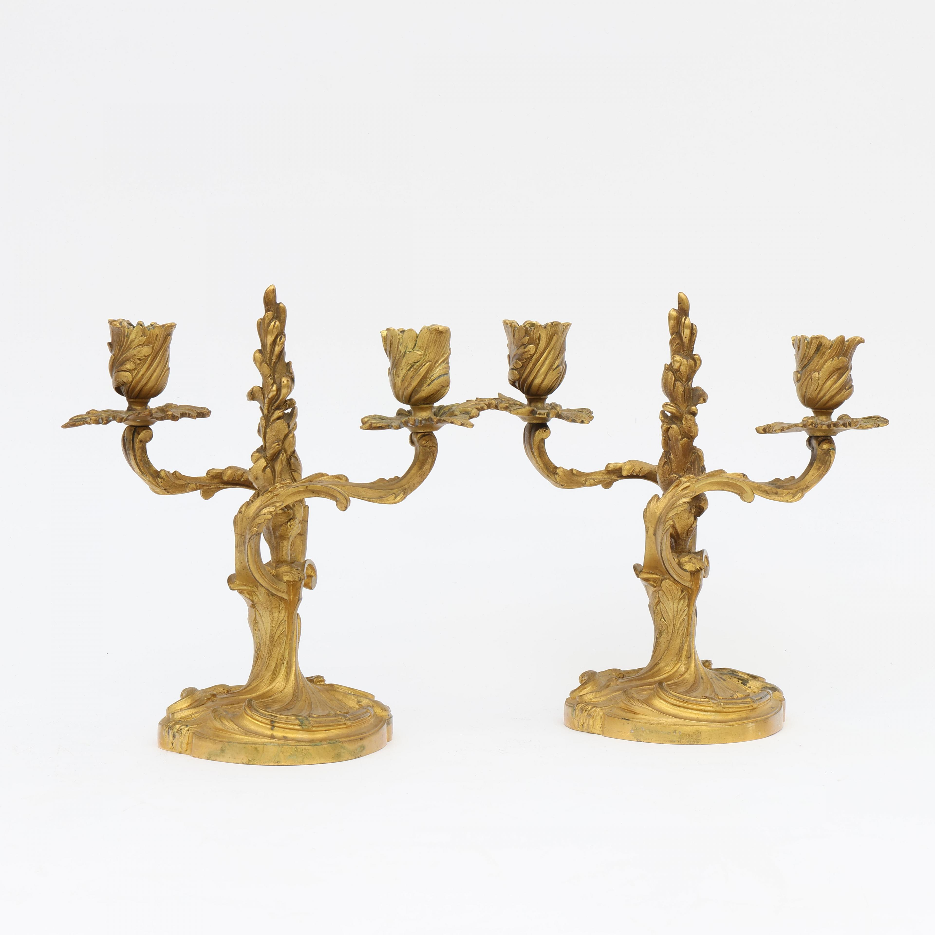 Frankrijk, paar vuurvergulde bronzen tweelichts kandelaars, Louis XV stijl, 19e eeuw;