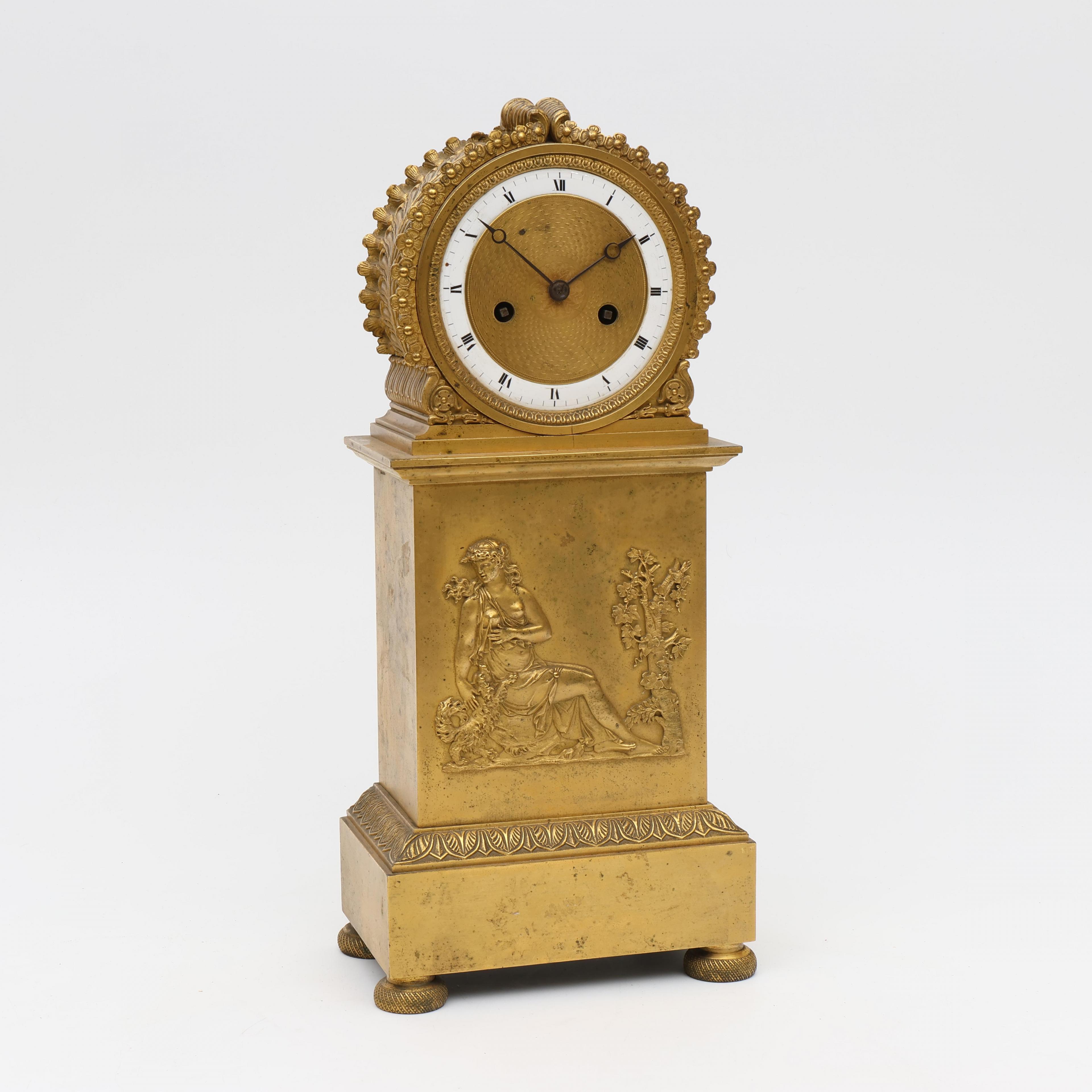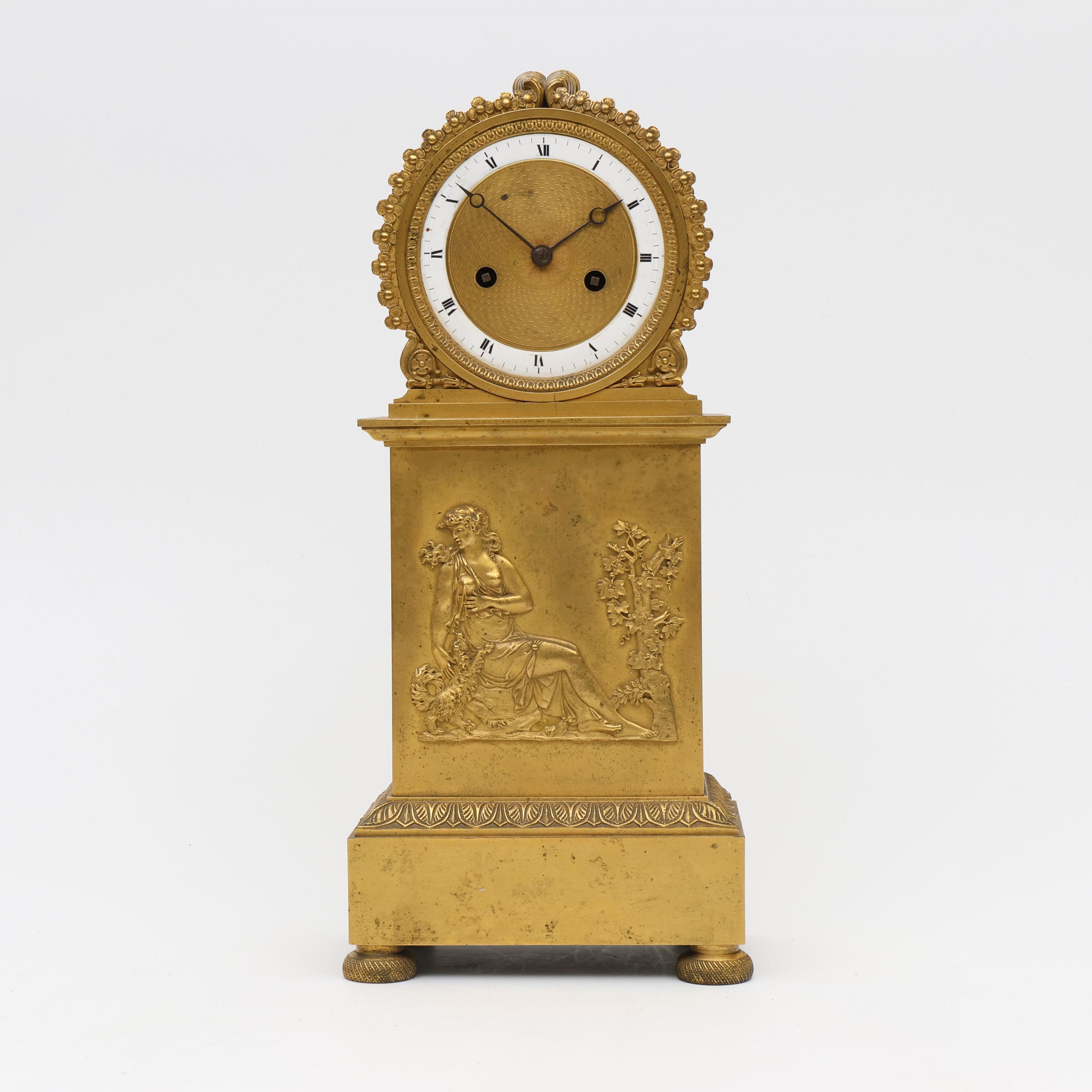Uurwerk uitgevoerd met gaand- en slagwerk. Wit emaille cijferring met Romeinse cijfers, stalen Breguet wijzers. De kast met applique van klassieke vrouw met hond.