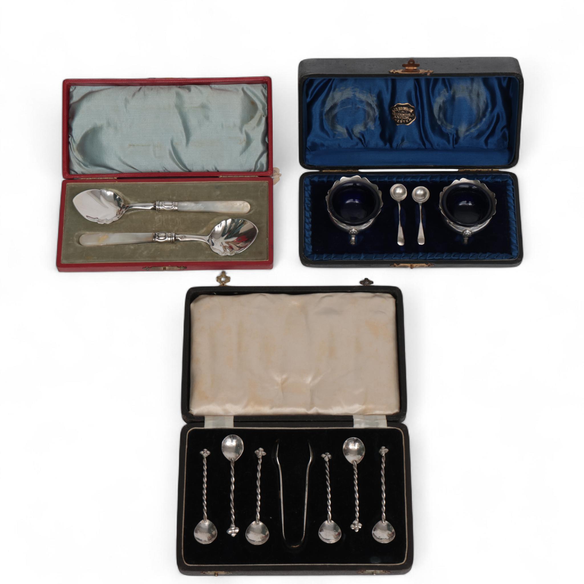 Engeland, set zoutvaatjes, twee jamlepels met parelmoer grepen en set theelepels en tang, ca. 1900,