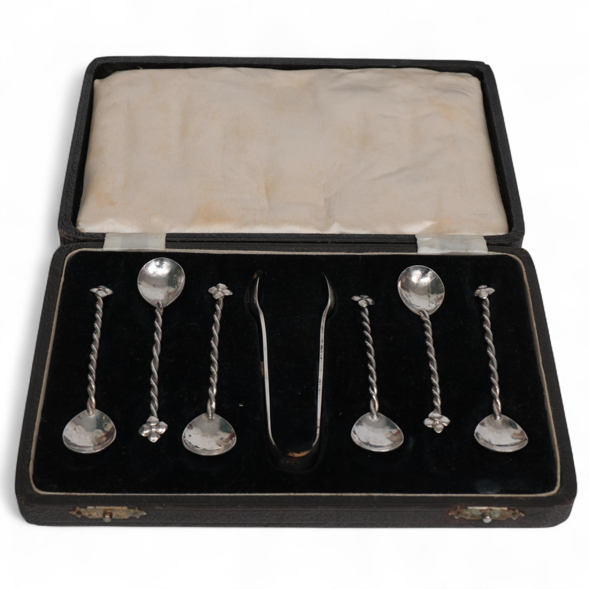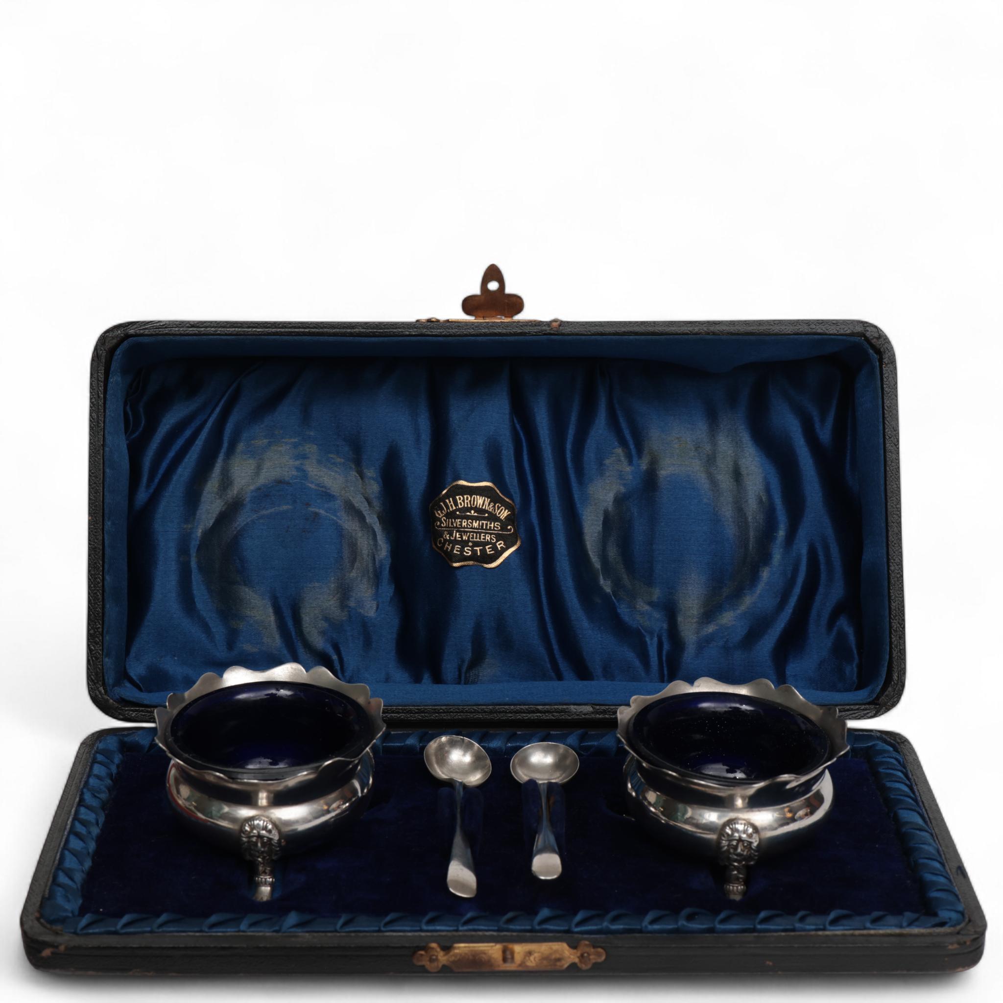 Birmingham, set vaatjes met blauw glazen binnenbakjes met zoutlepeltjes in etui en theelepels, Londen set theelepels, gemerkt met meestertekens, jaarletters en 1e gehalte, alle in etui,