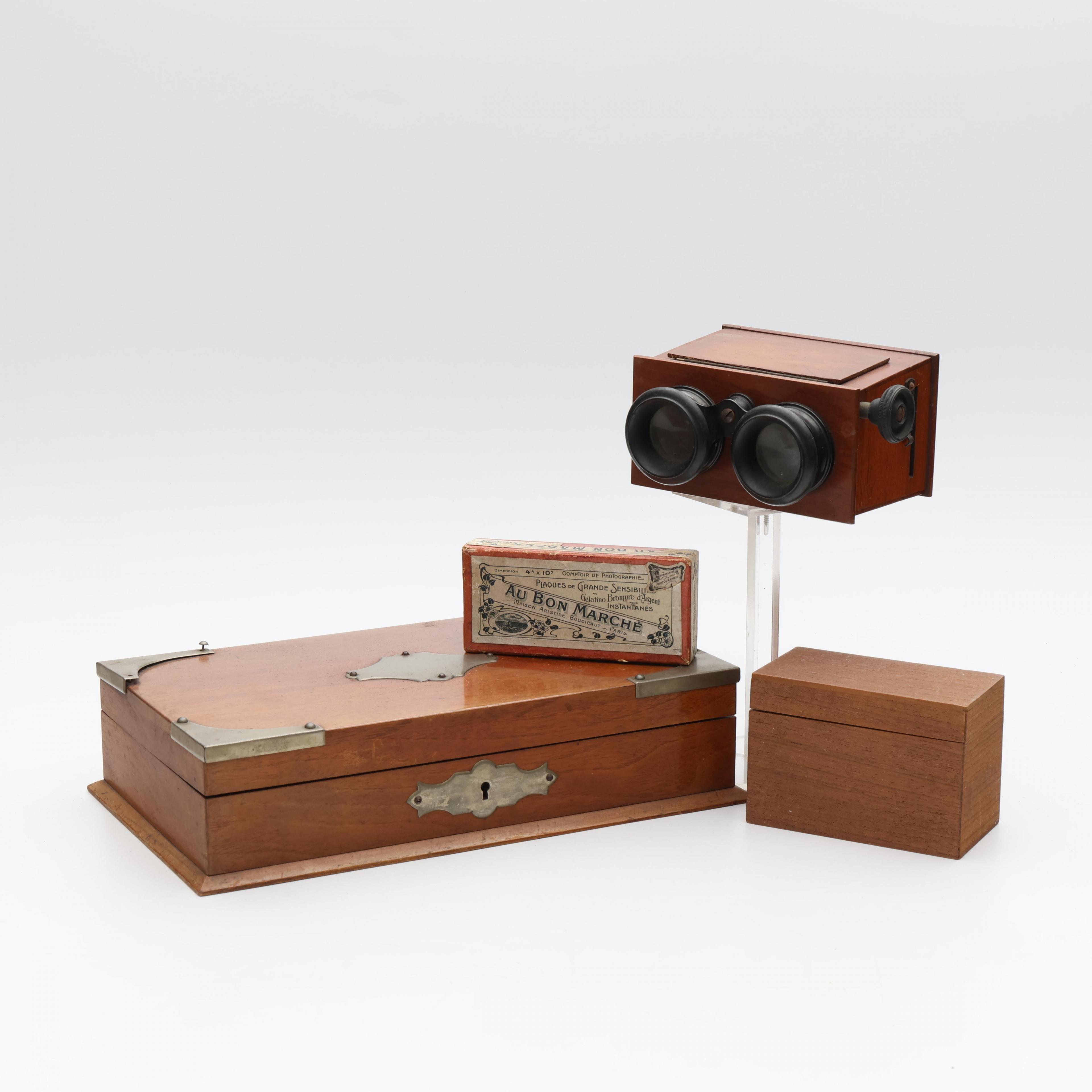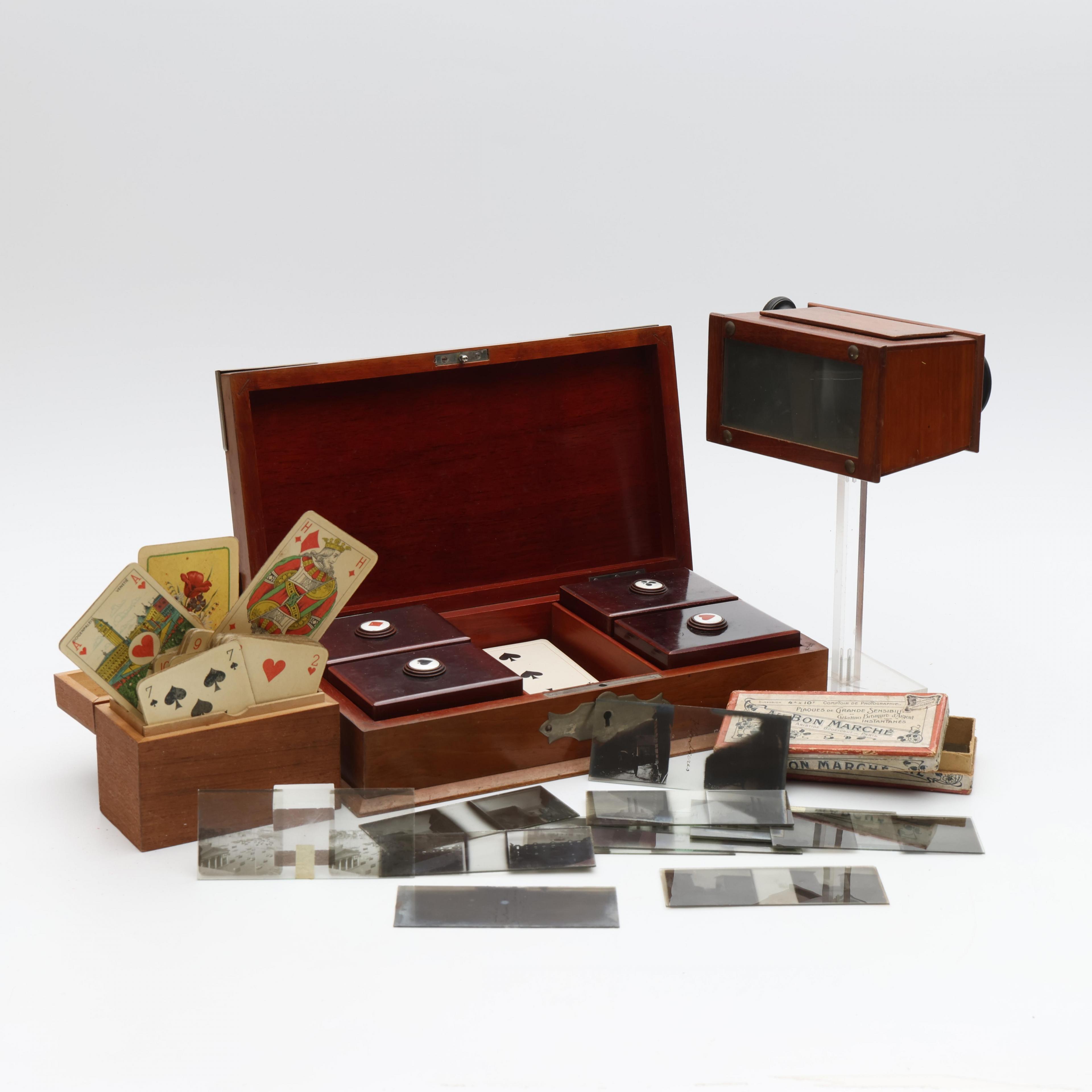 Stereokijker met doos glazen stereofoto's, fiches doos en doosje met speelkaarten, circa 1900;