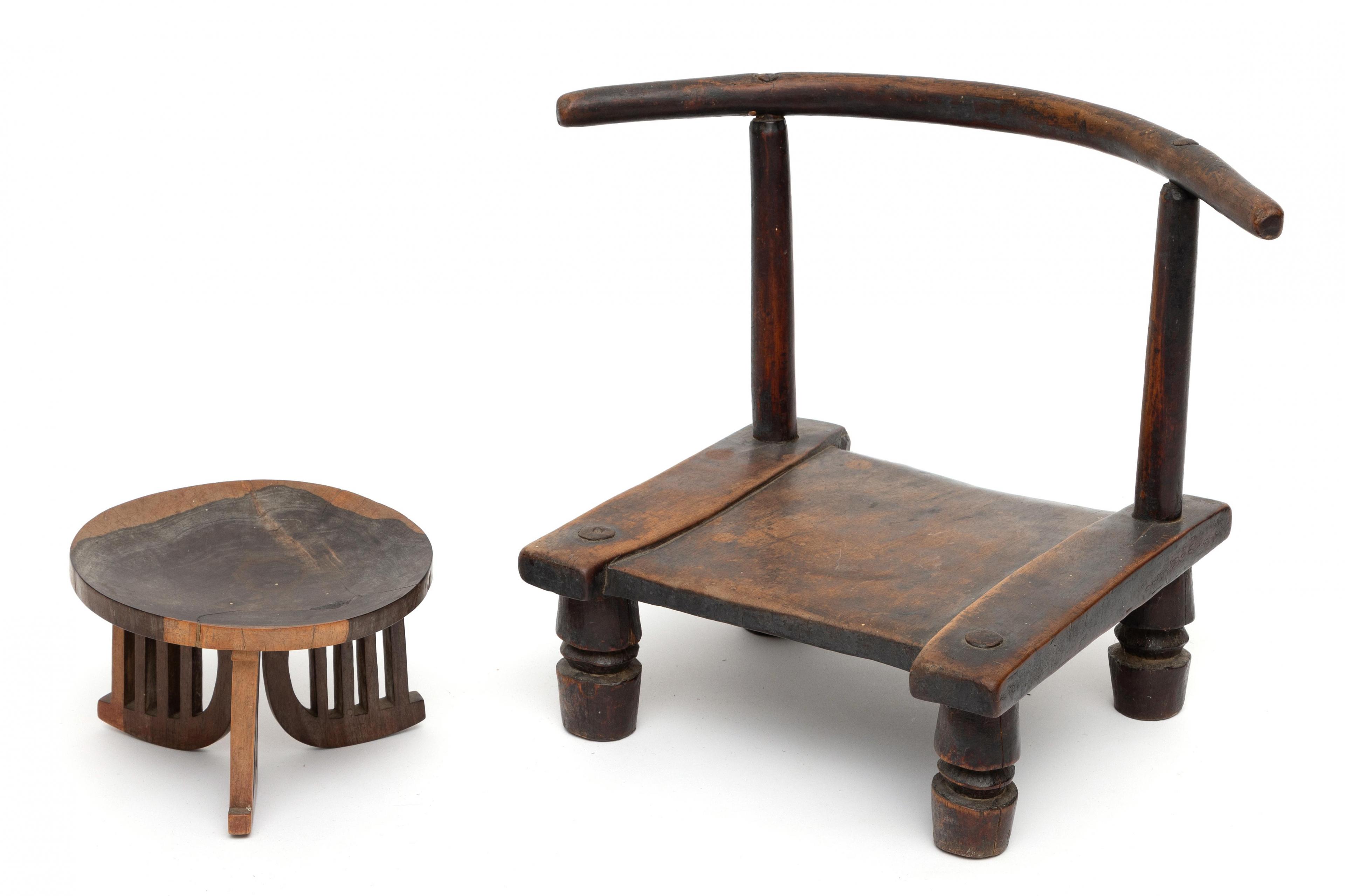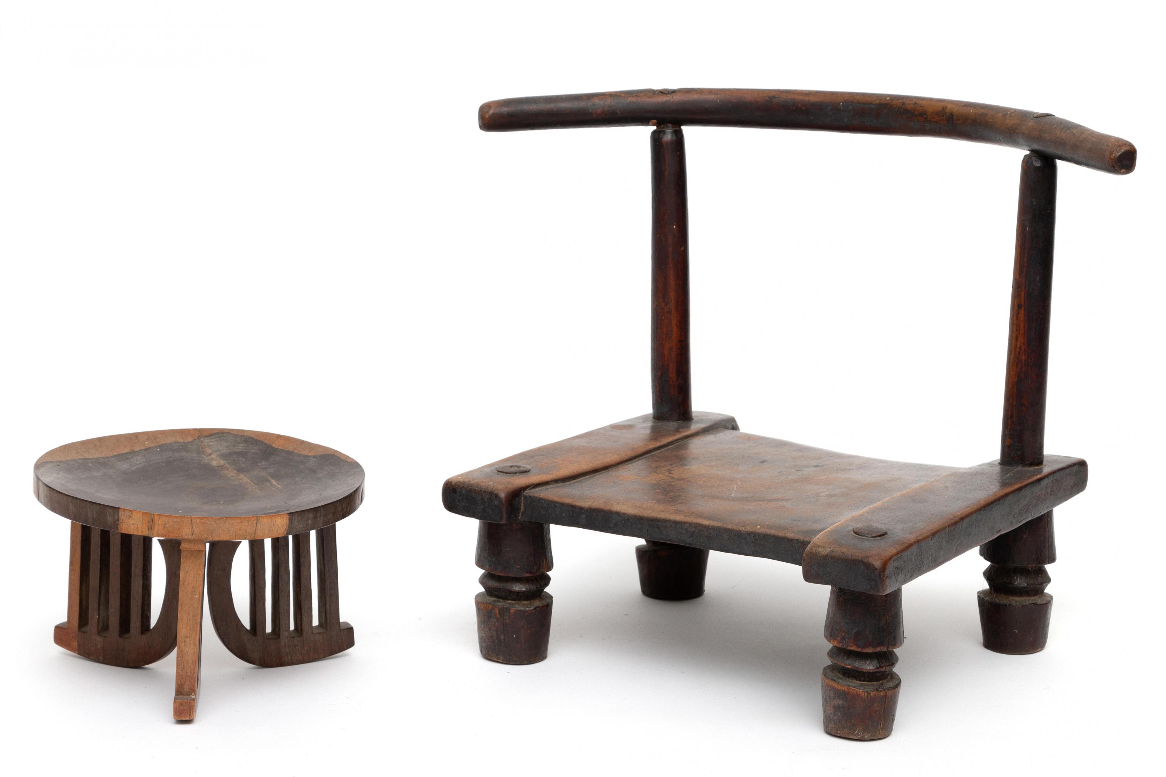Ivory Coast, Dan, chair and Kenya, Kamba, small stool.