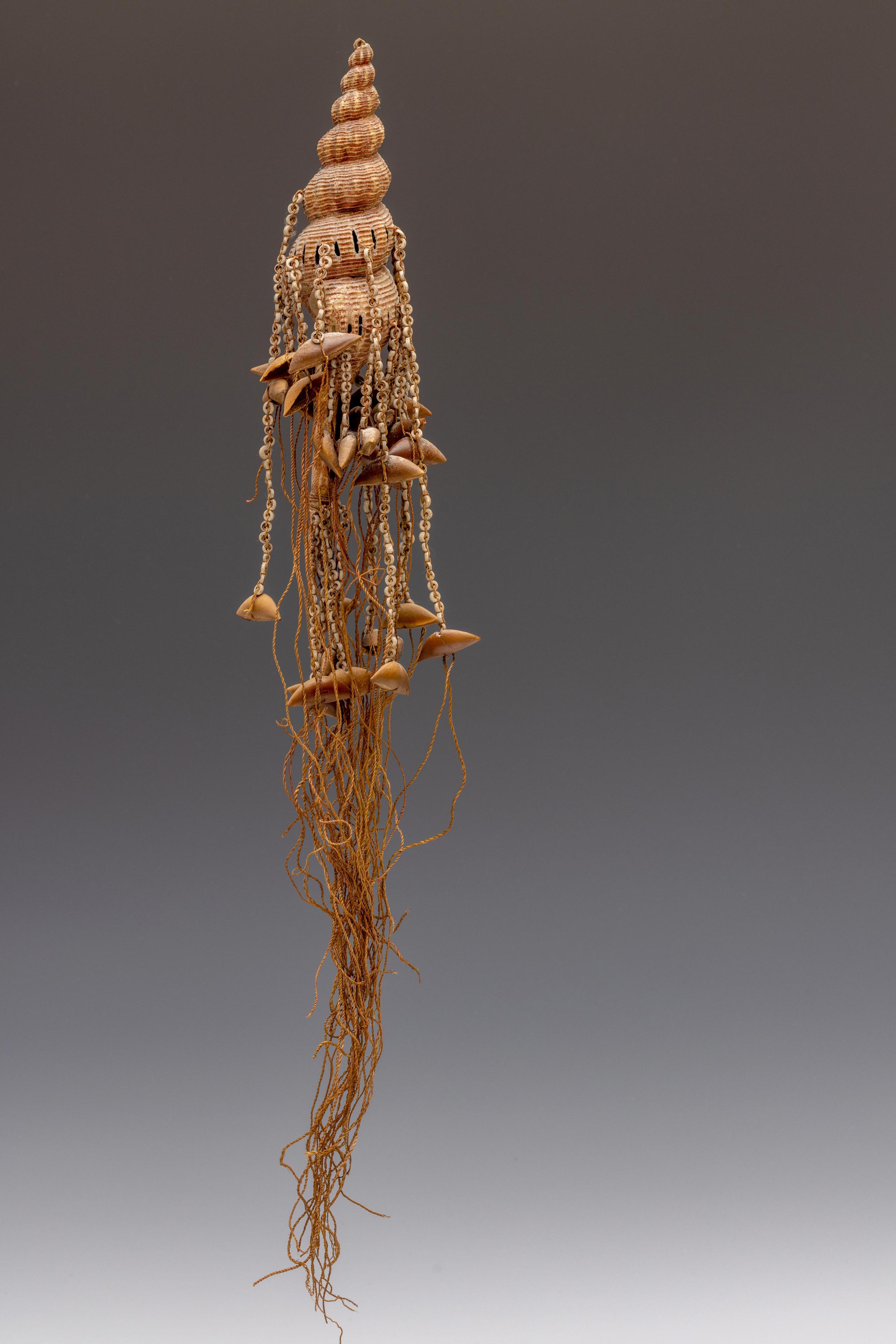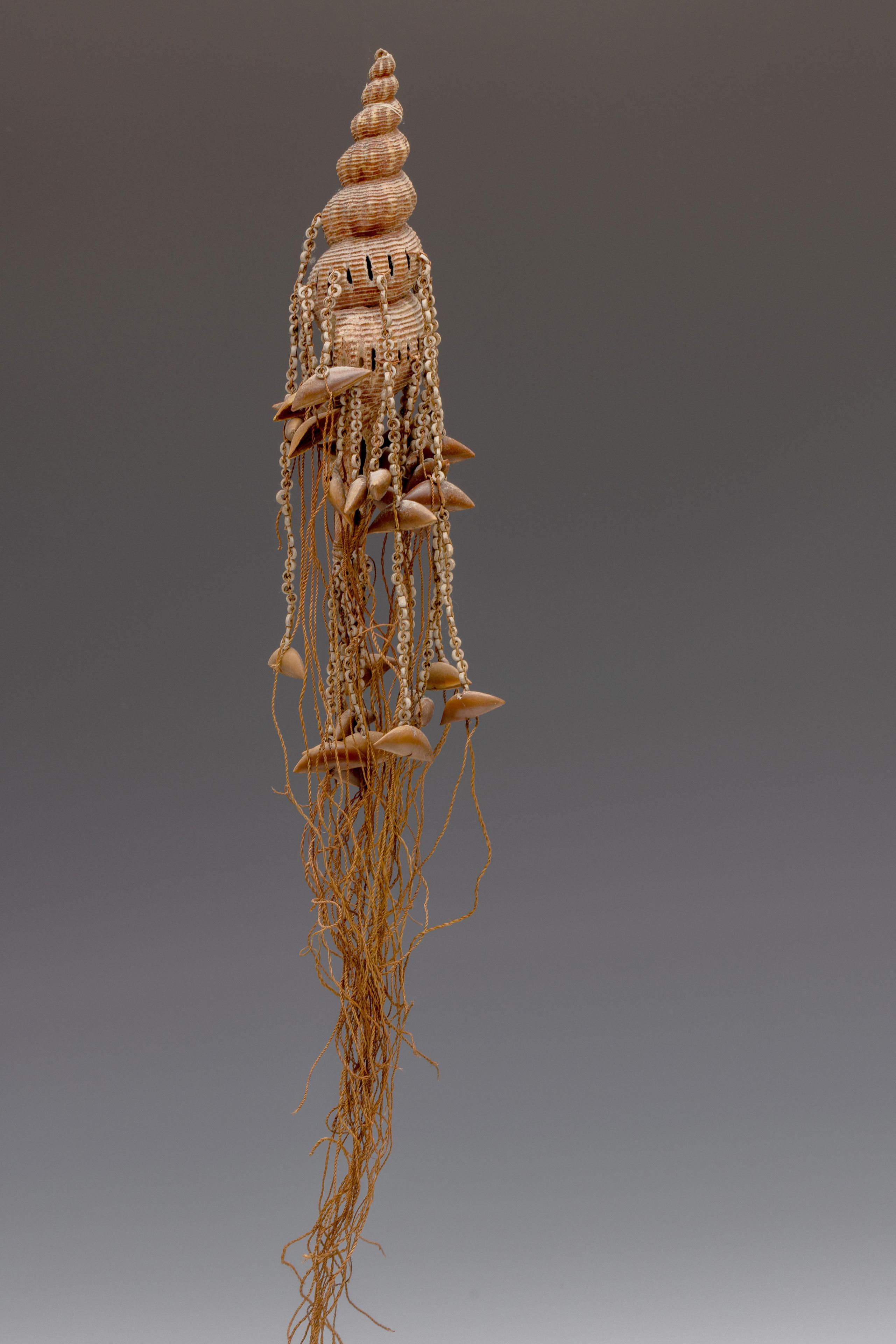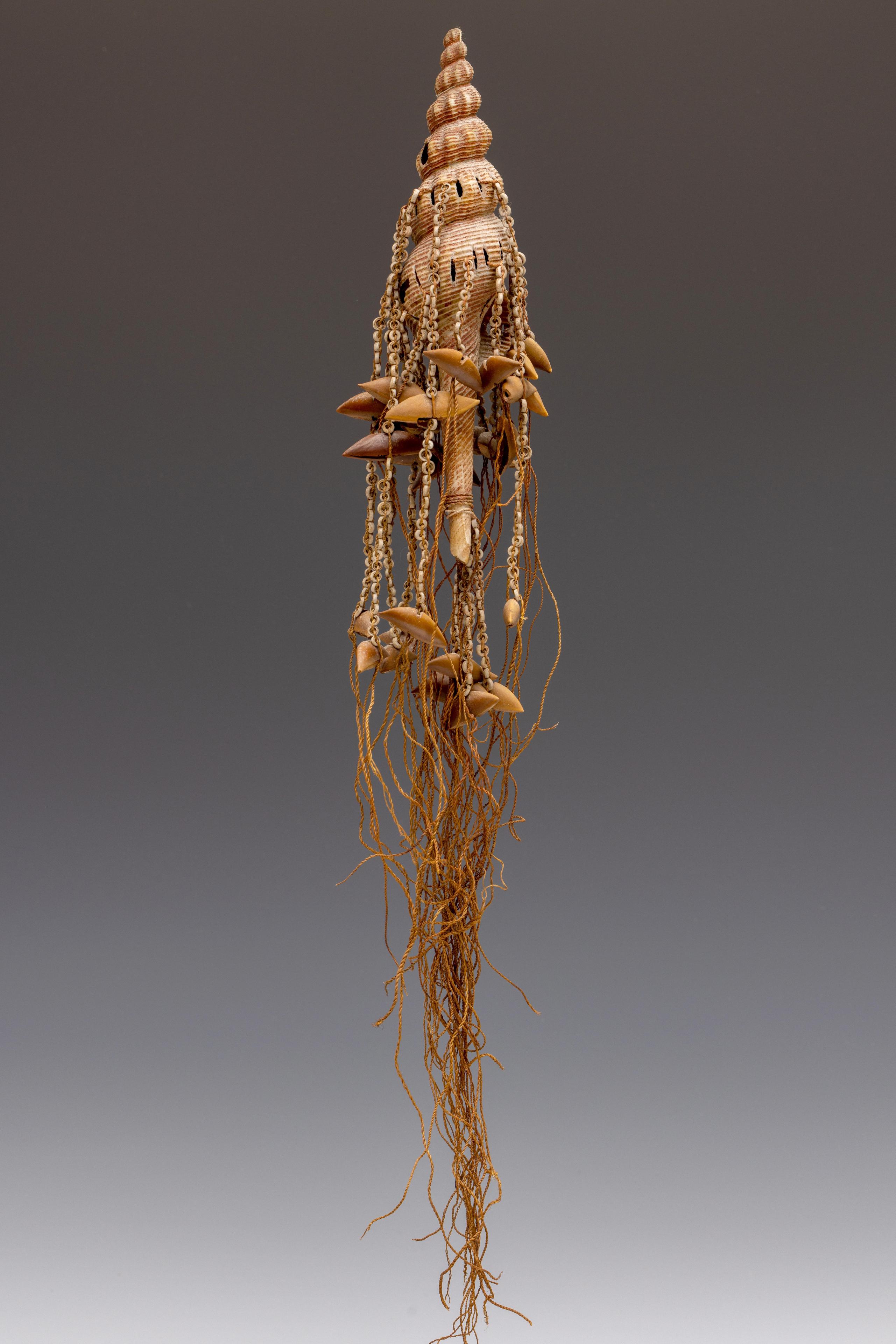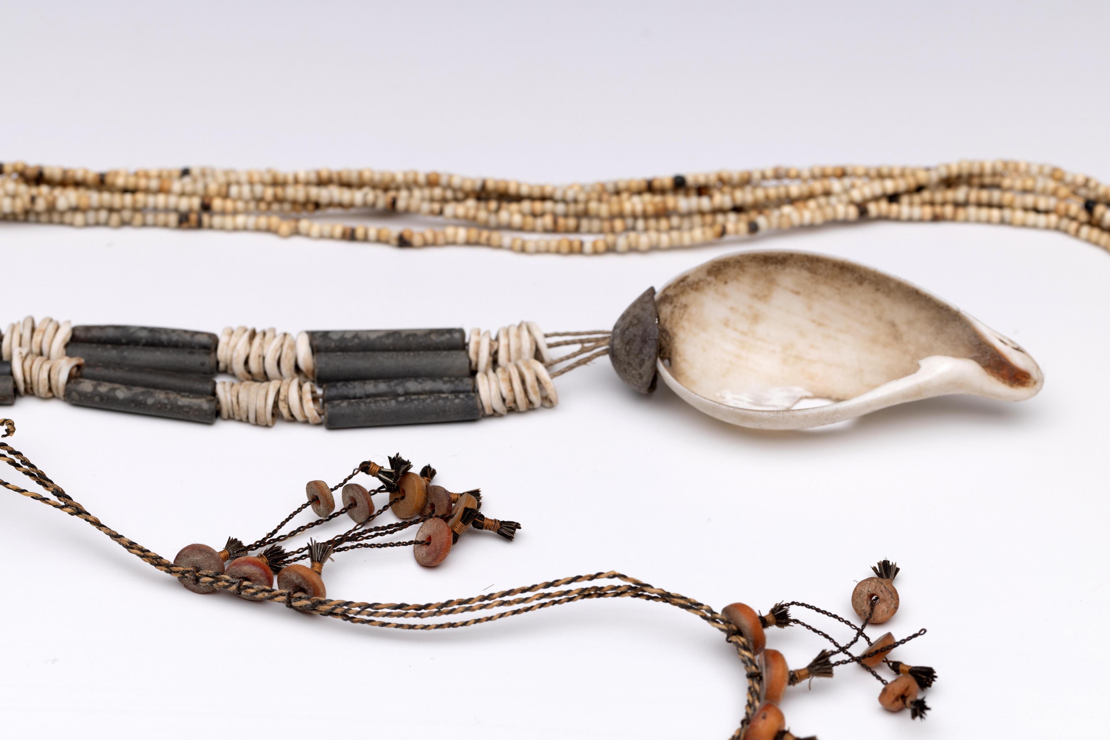 Micronesia - Melanesia, a collection of three necklaces and a conch shell dance implement;