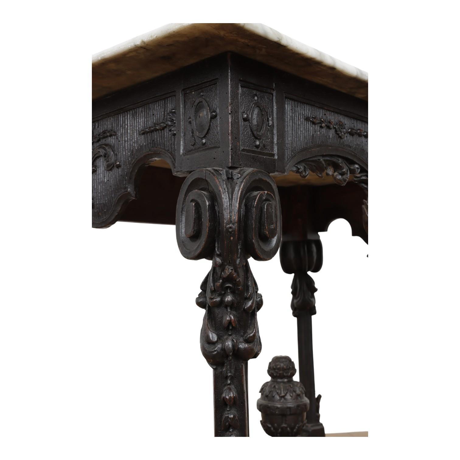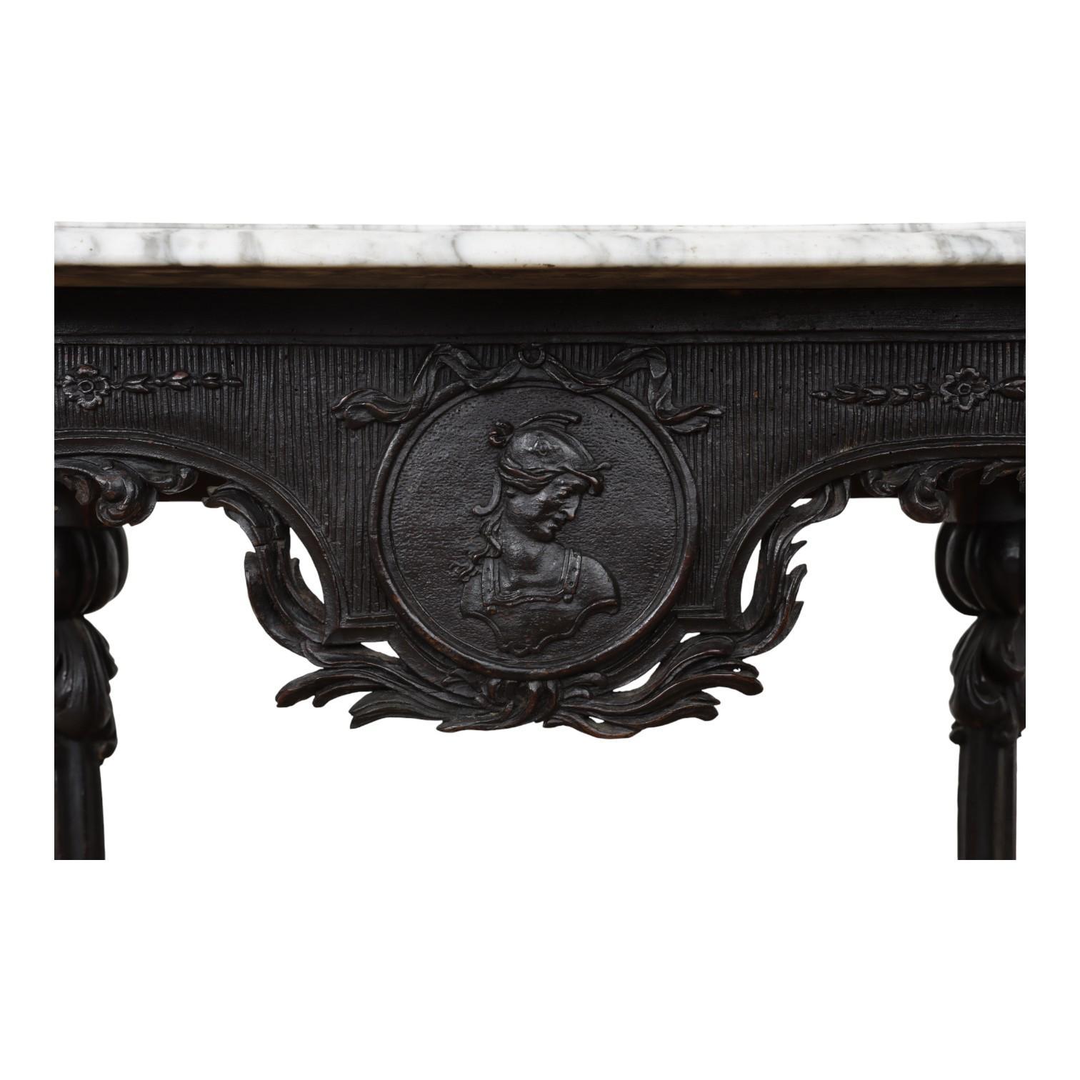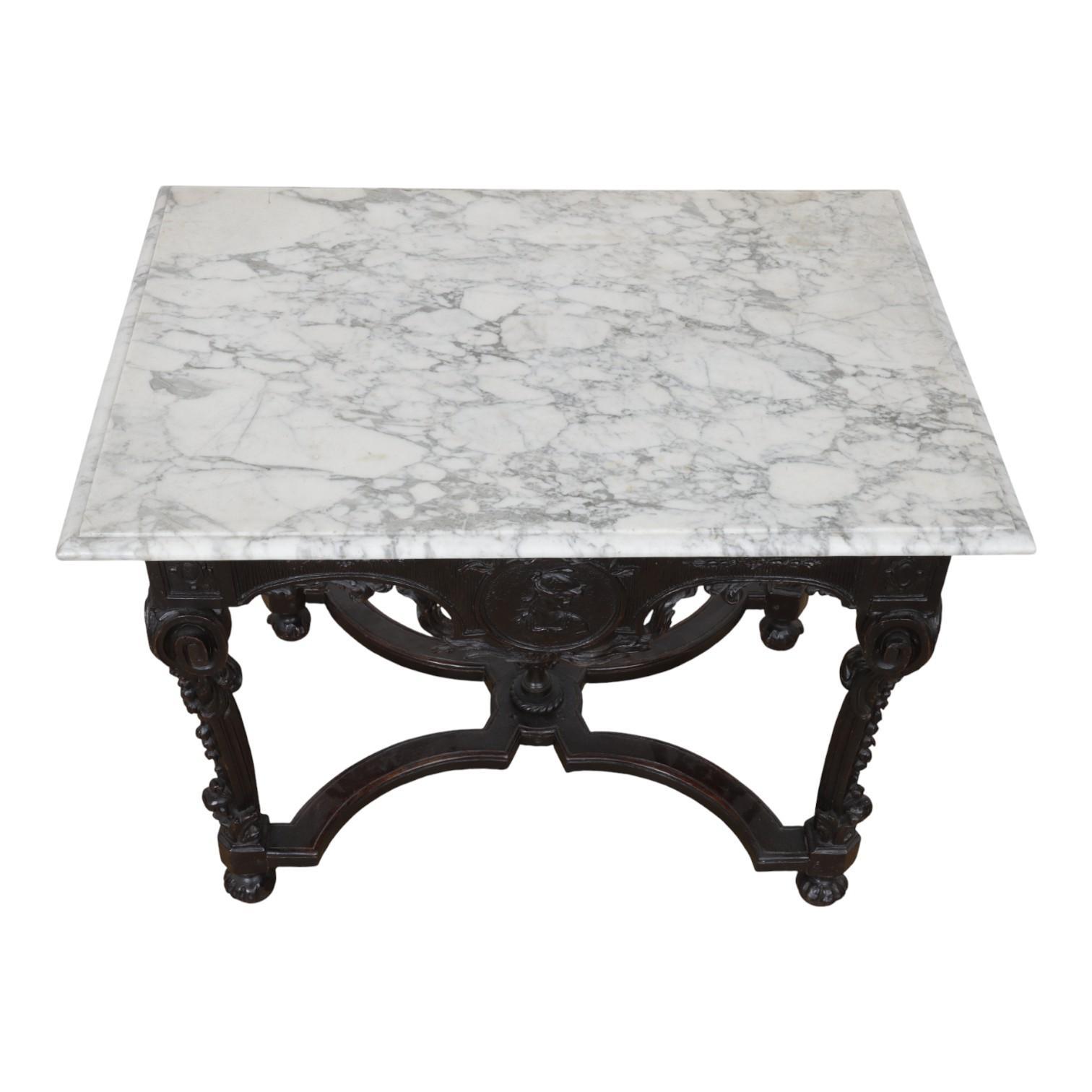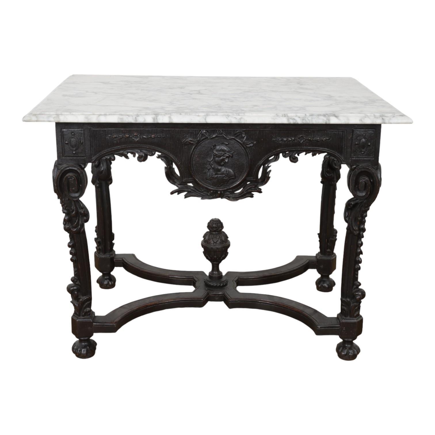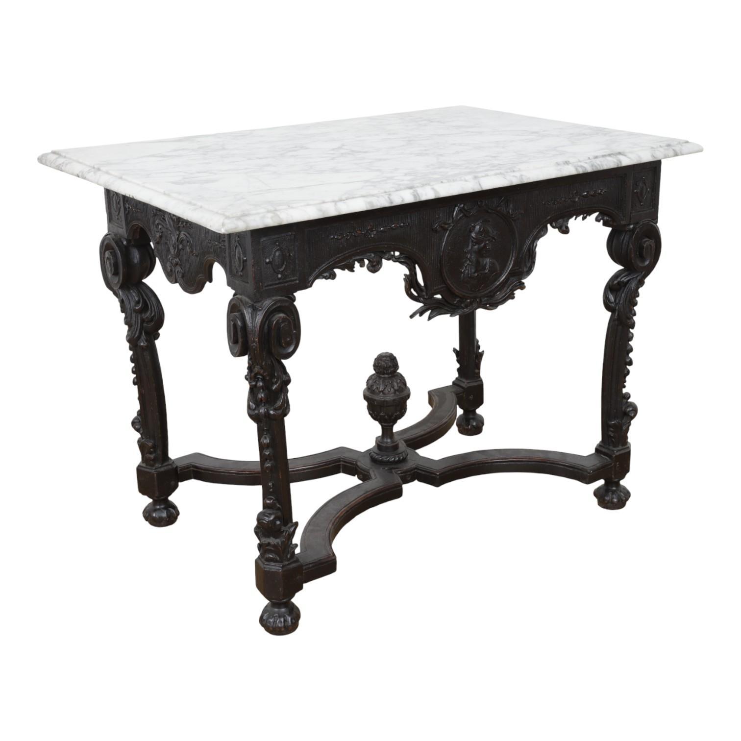 met marmeren blad en o.a. gestoken medallion en -vaasornament. Tussen de vier poten een kruisregel