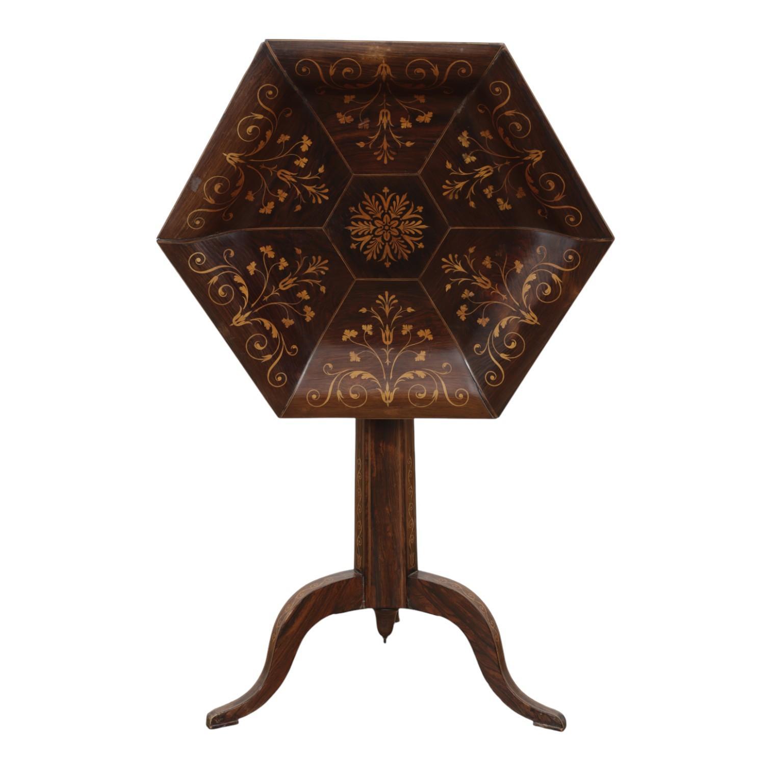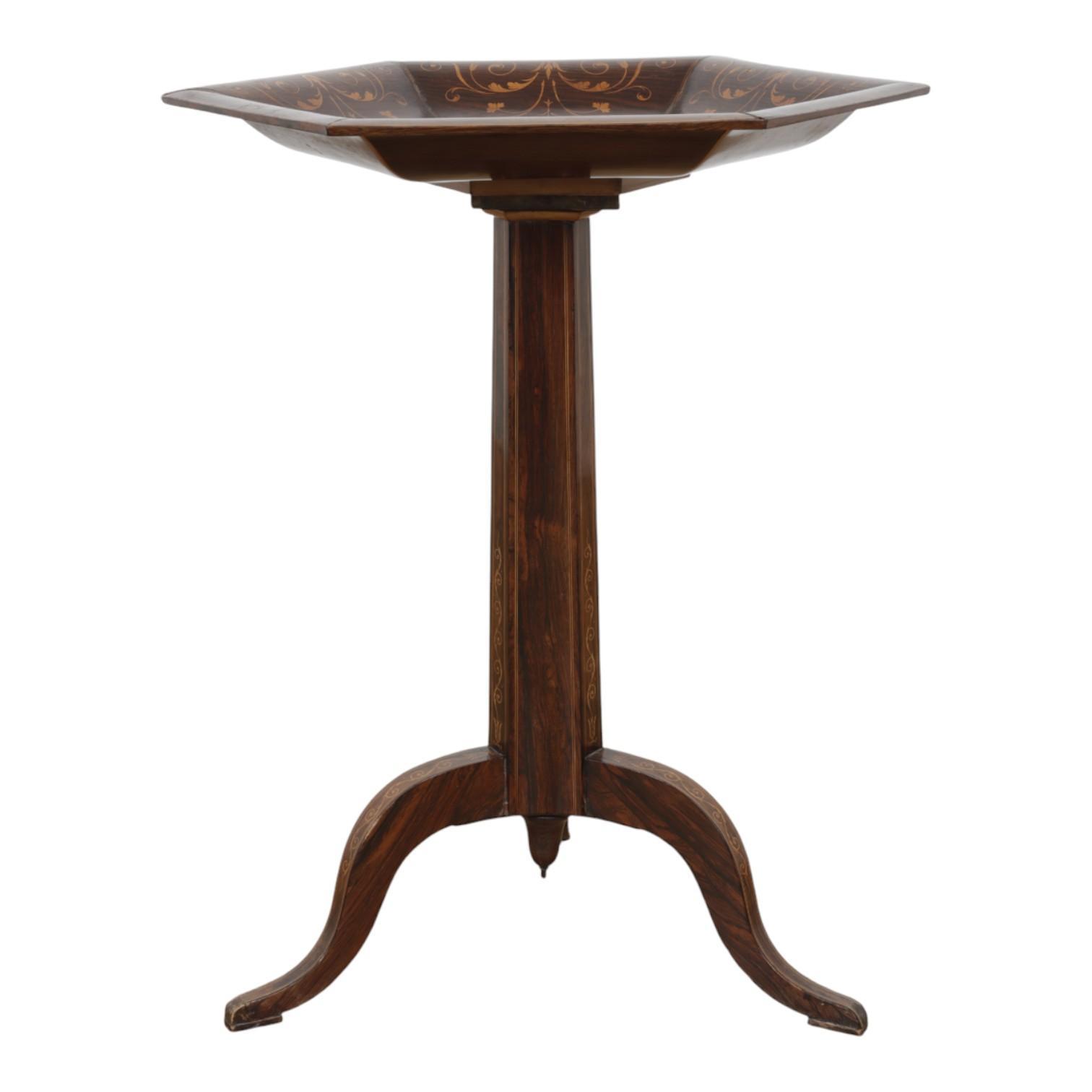 met kantig blad. Op kolompoot met driesprant. Het geheel versierd met marqueterie
