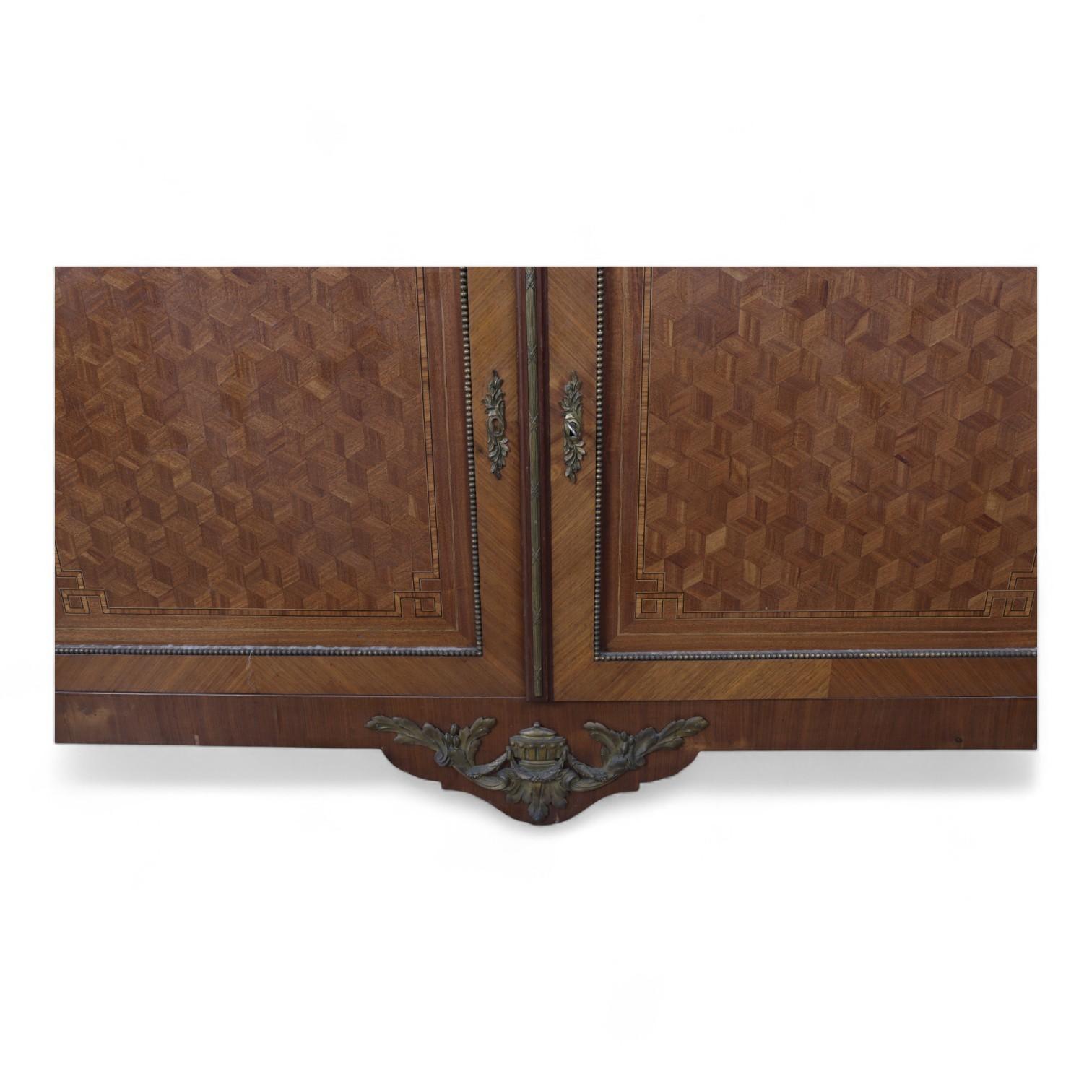 De twee deuren met ruit, waaronder twee laden en twee deuren. Het geheel versierd met bieswerk, marqueterie de cube, bronzen en messing ornamenten. Op bronzen klauwpootjes