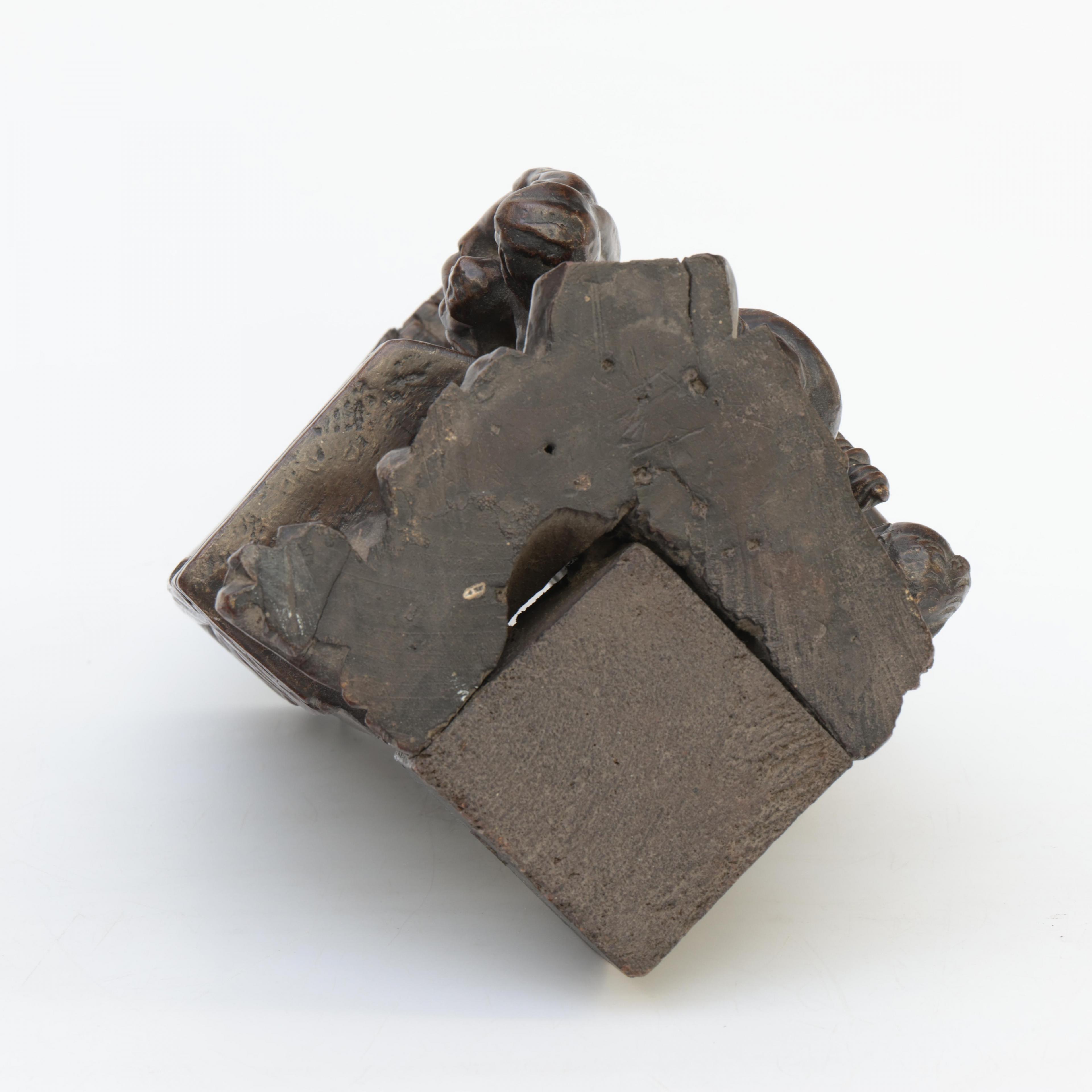 Waarschijnlijk hoekornament van beeldenkast. Achterzijde met oud handgeschreven etiket.
