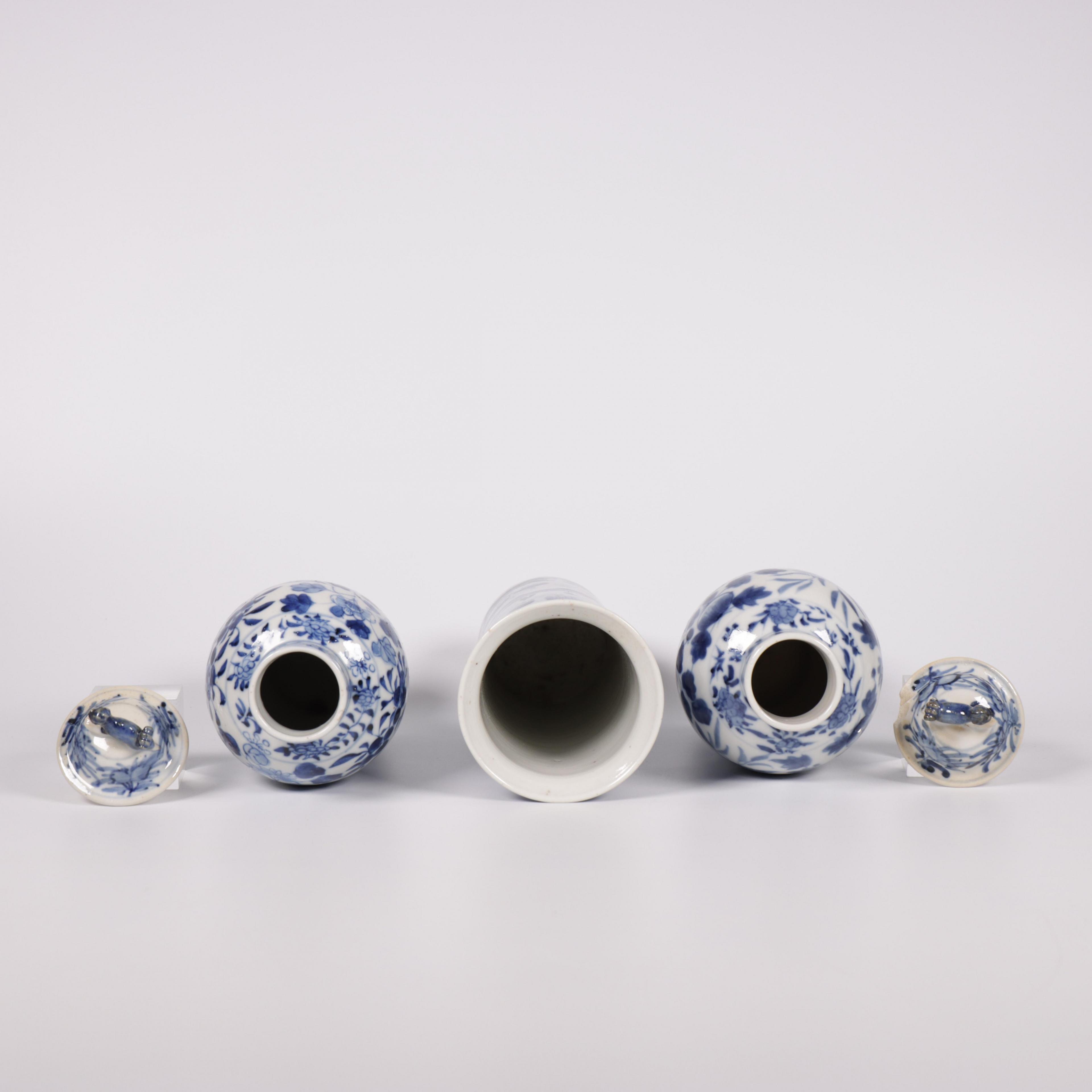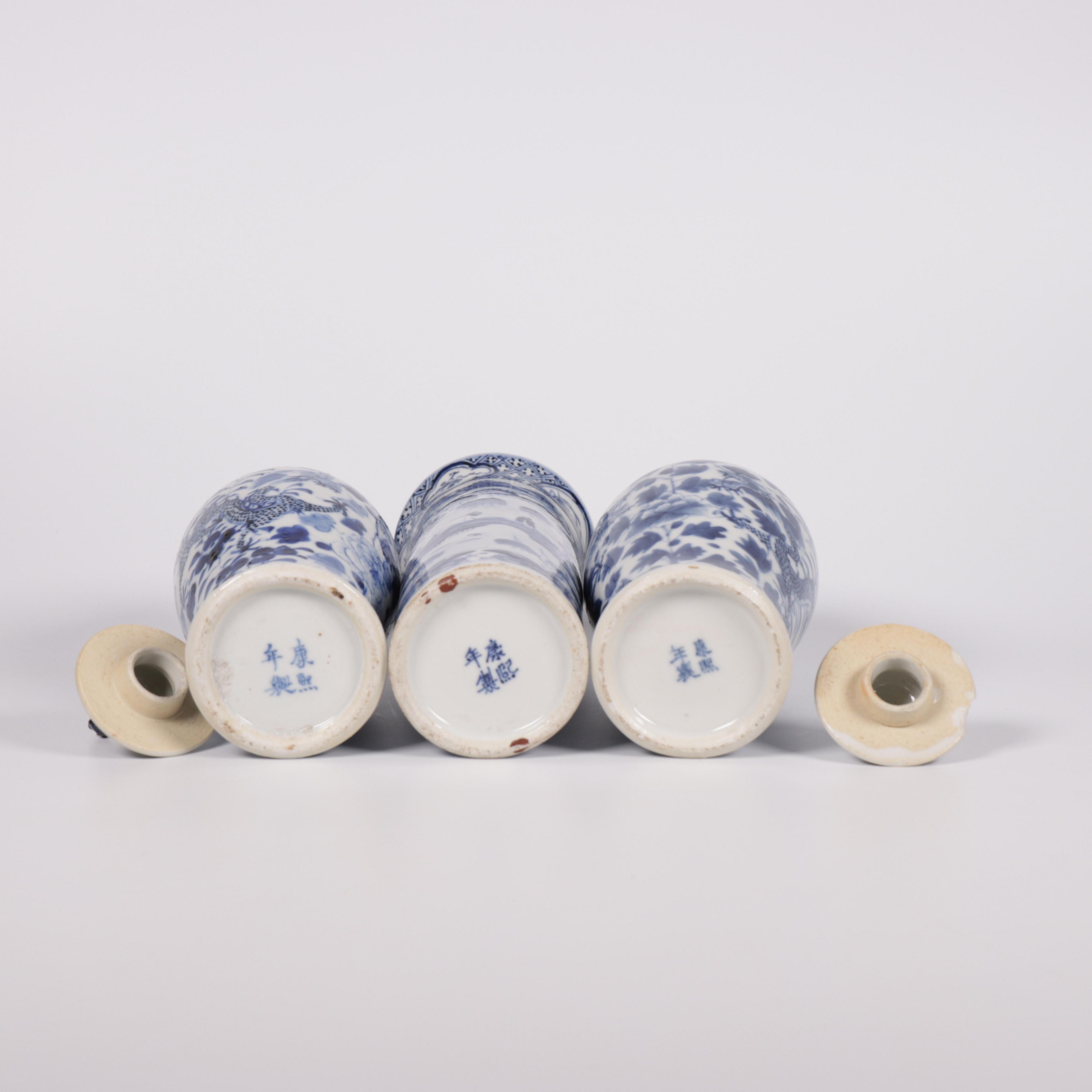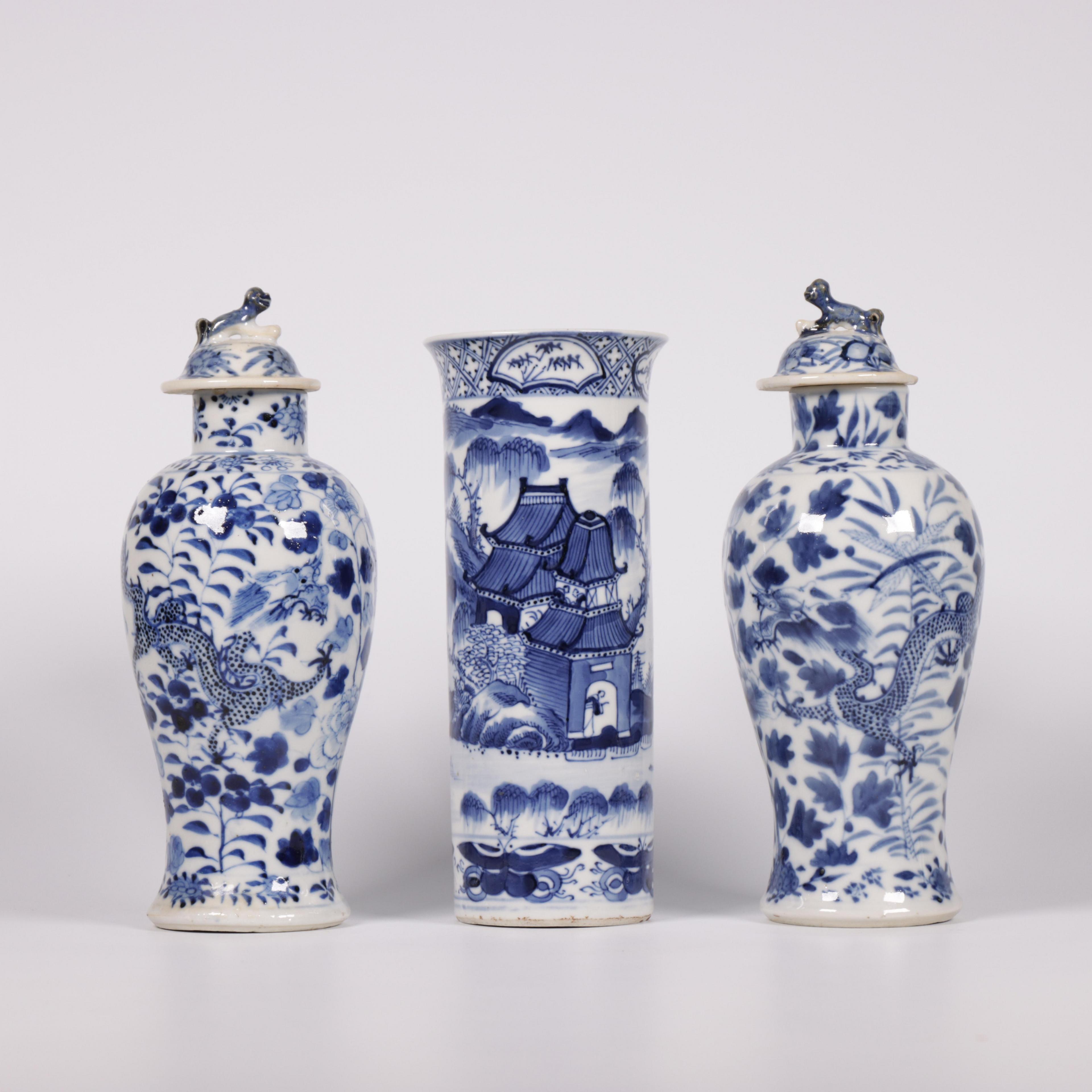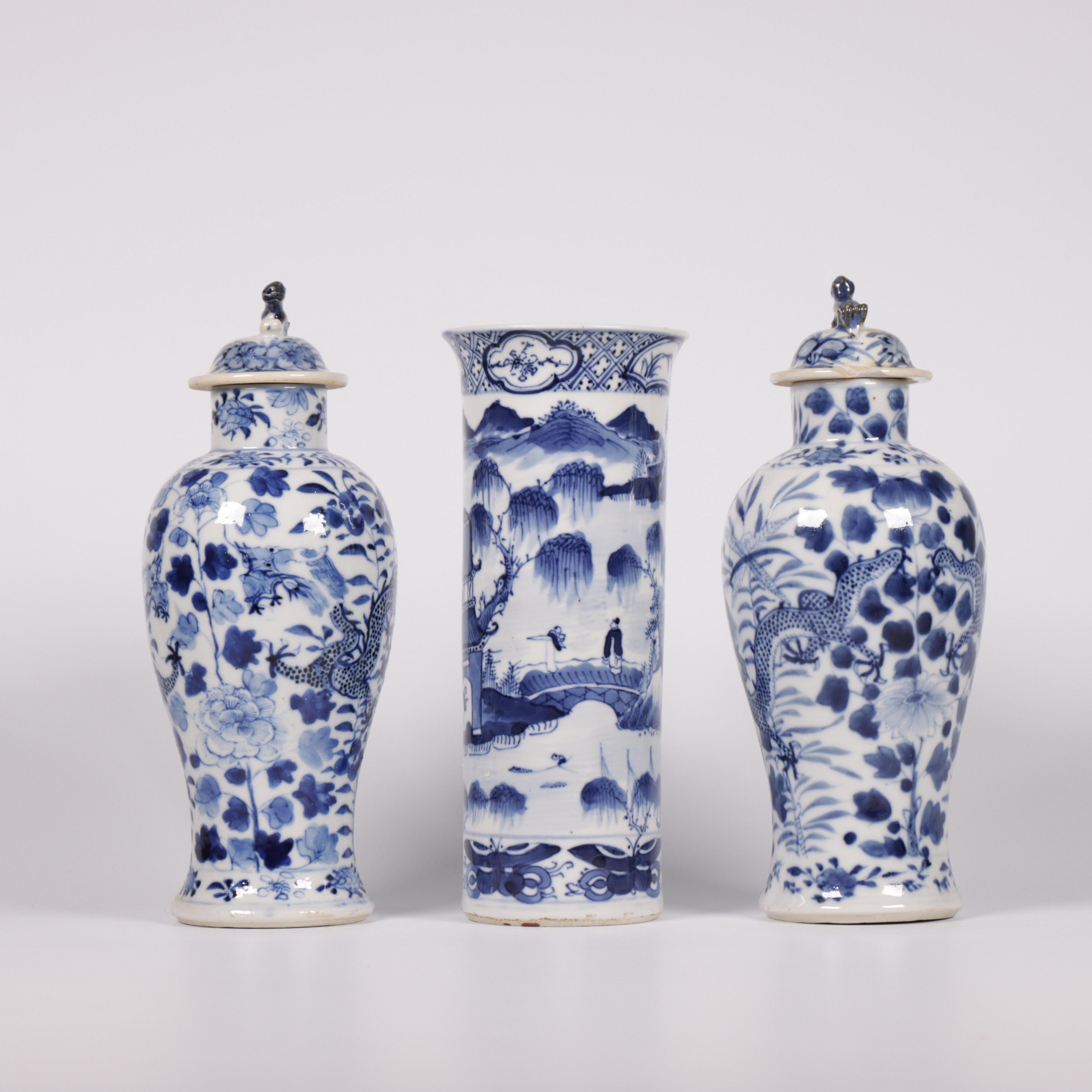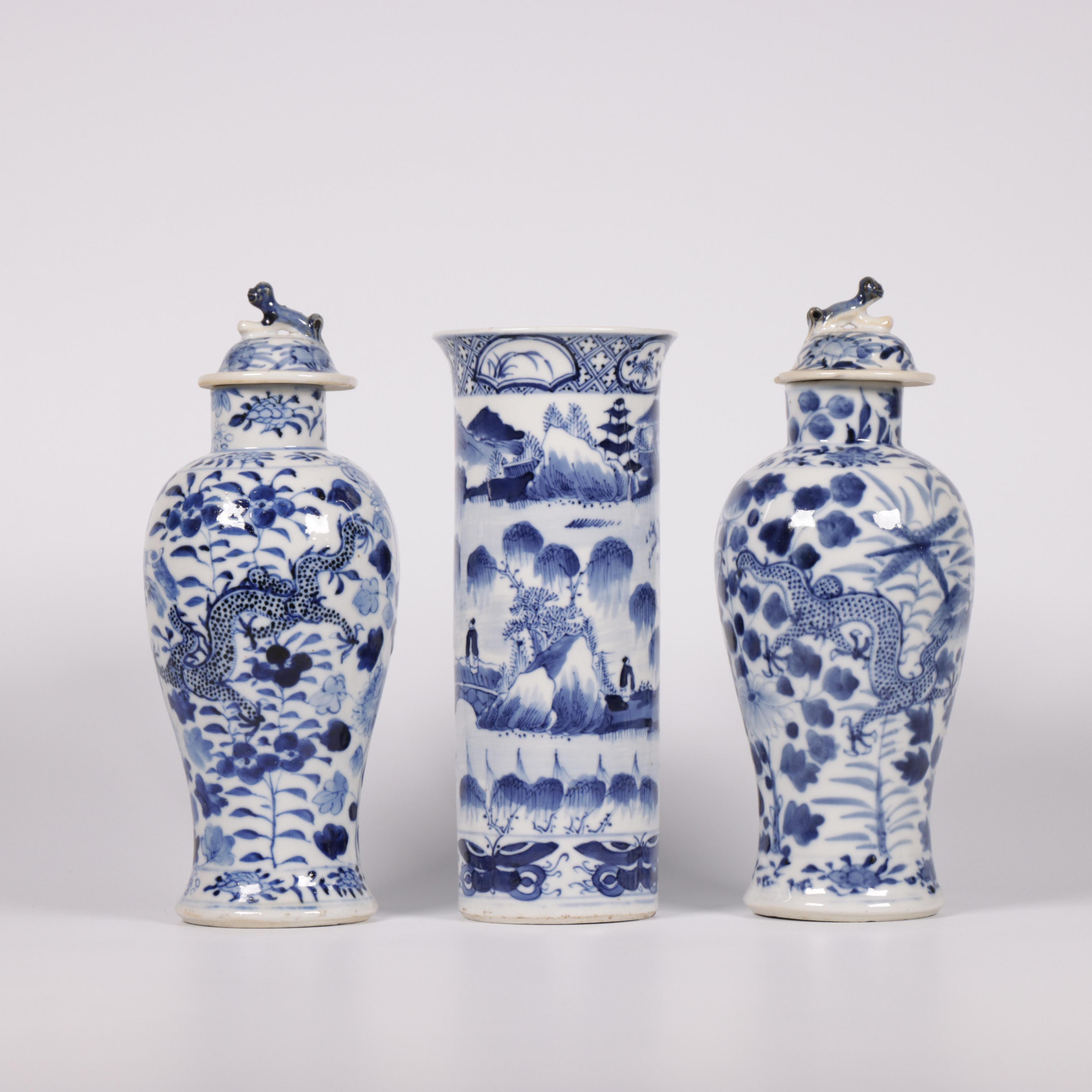 comprising a cylindrical vase with pagoda's in a river landscape and a pair of baluster vases and covers painted with a dragon, apocryphal four-character marks (one cover damaged, small rim chip)