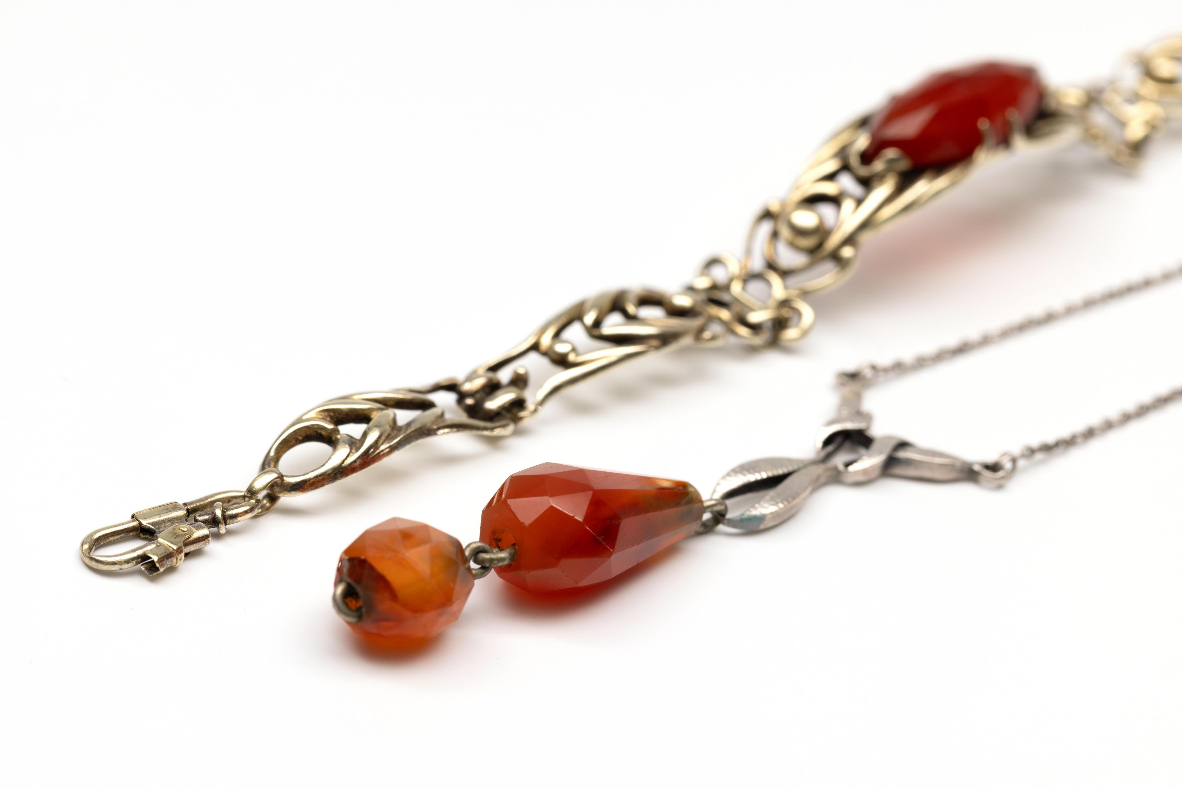 Opgebouwd uit boogvormige ornamenten, gedecoreerd met bollen. Centraal bezet met een markiesvormige roosgeslepen kornalijn van ca. 26 x 10 mm. Gekeurd met meesterteken Fa. Gebroeders Reggers, Amsterdam 1925 - 1934, gewichtsaanduidend keur en belastingkeur. Hierbij een zilveren lavalière collier, jaren '20, met gehamerde hanger waaraan een druppel en bol van gefacetteerde kornalijn