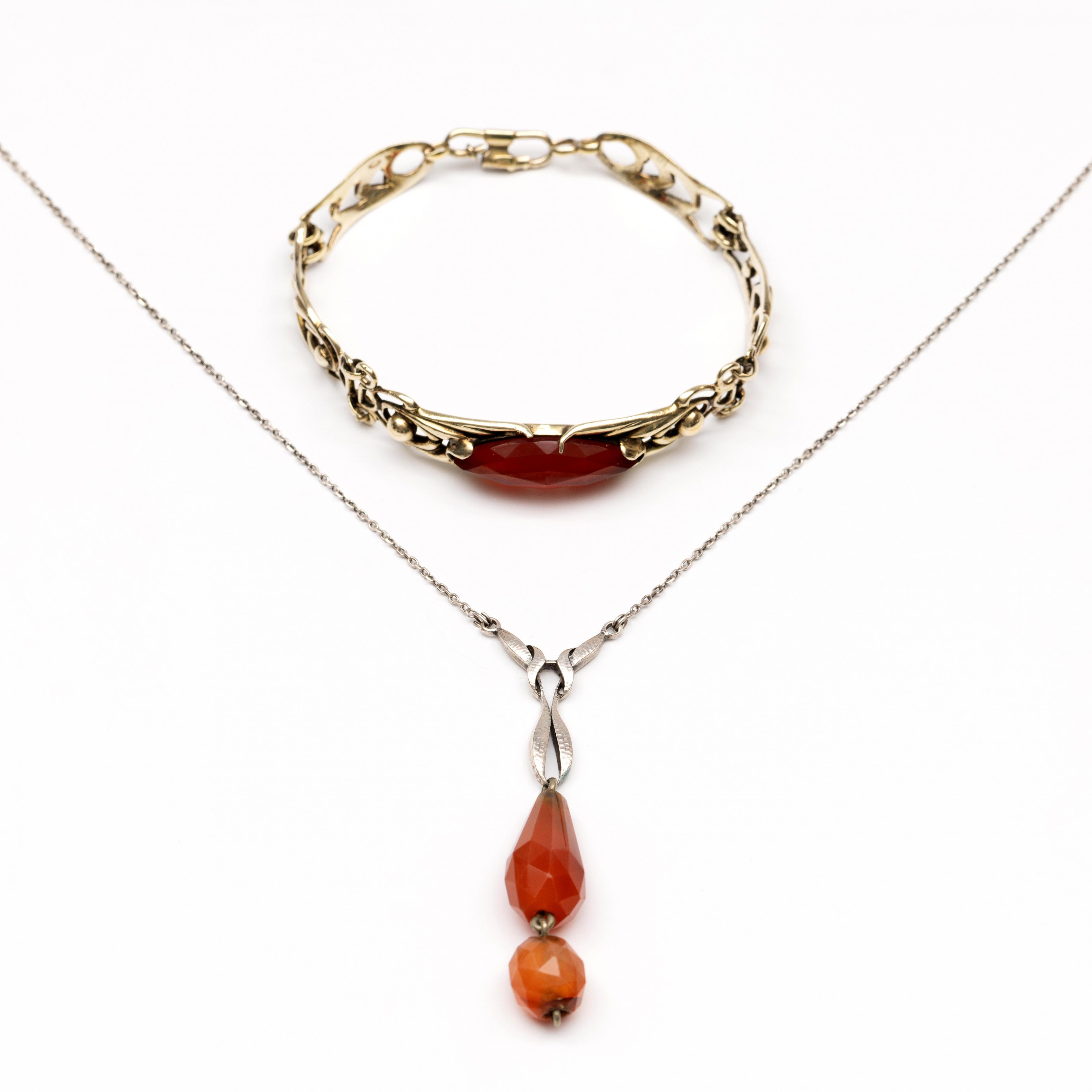 Reggers, 14 k. gold bracelet. Constructed with arched ornaments, decorated with spheres. Centrally set with a marquise-shaped rose-cut carnelian of approximately 26 x 10 mm. Hallmarked with the maker's mark of the Reggers Brothers, Amsterdam 1925-1934, weight-indicating hallmark, and tax hallmark. Herewith a silver lavaliere necklace, 1920s, with a hammered pendant featuring a drop and sphere of faceted carnelian.
