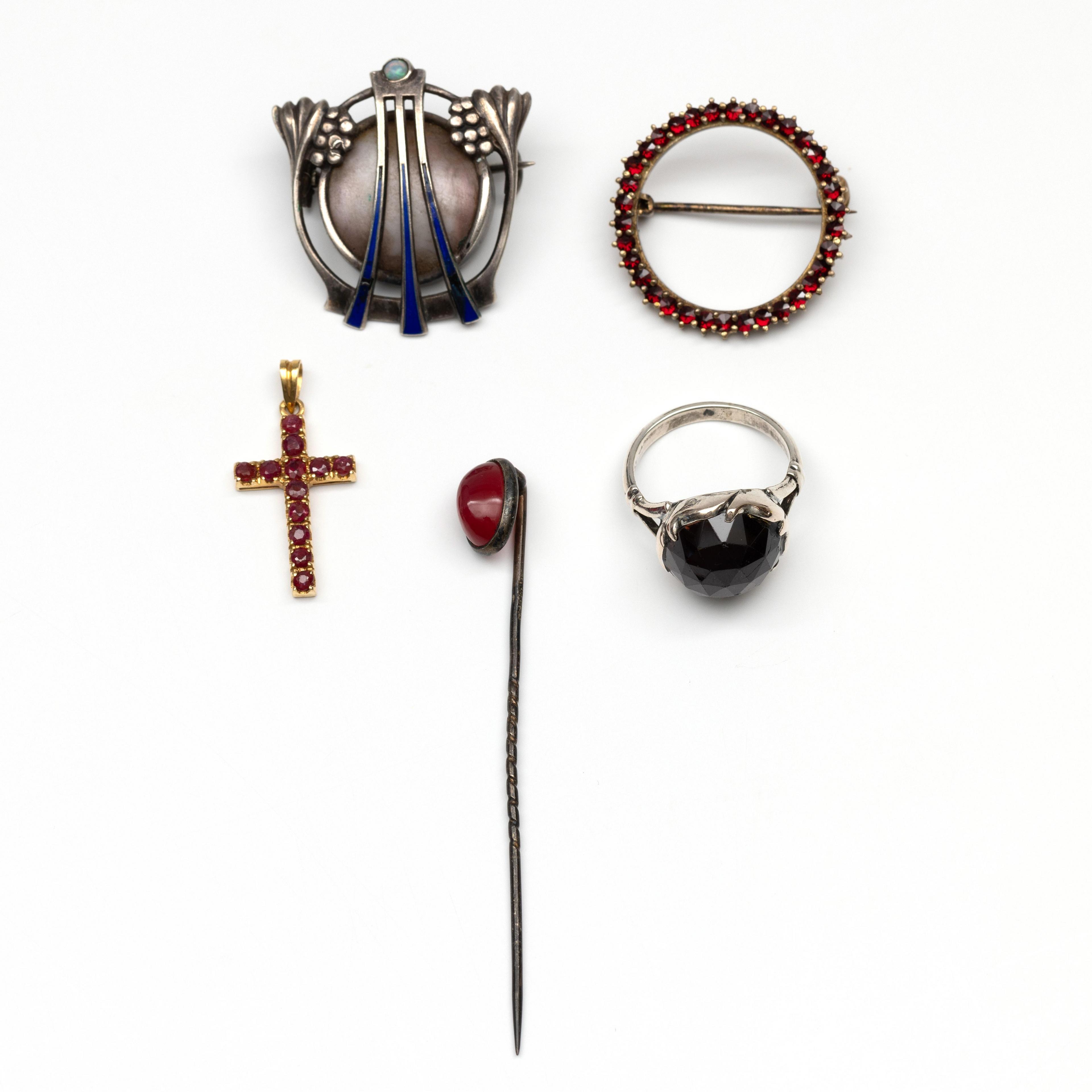 Hierbij een 14 kt. gouden kruisje met robijn, tombak broche zilveren speld en zilveren ring met granaat