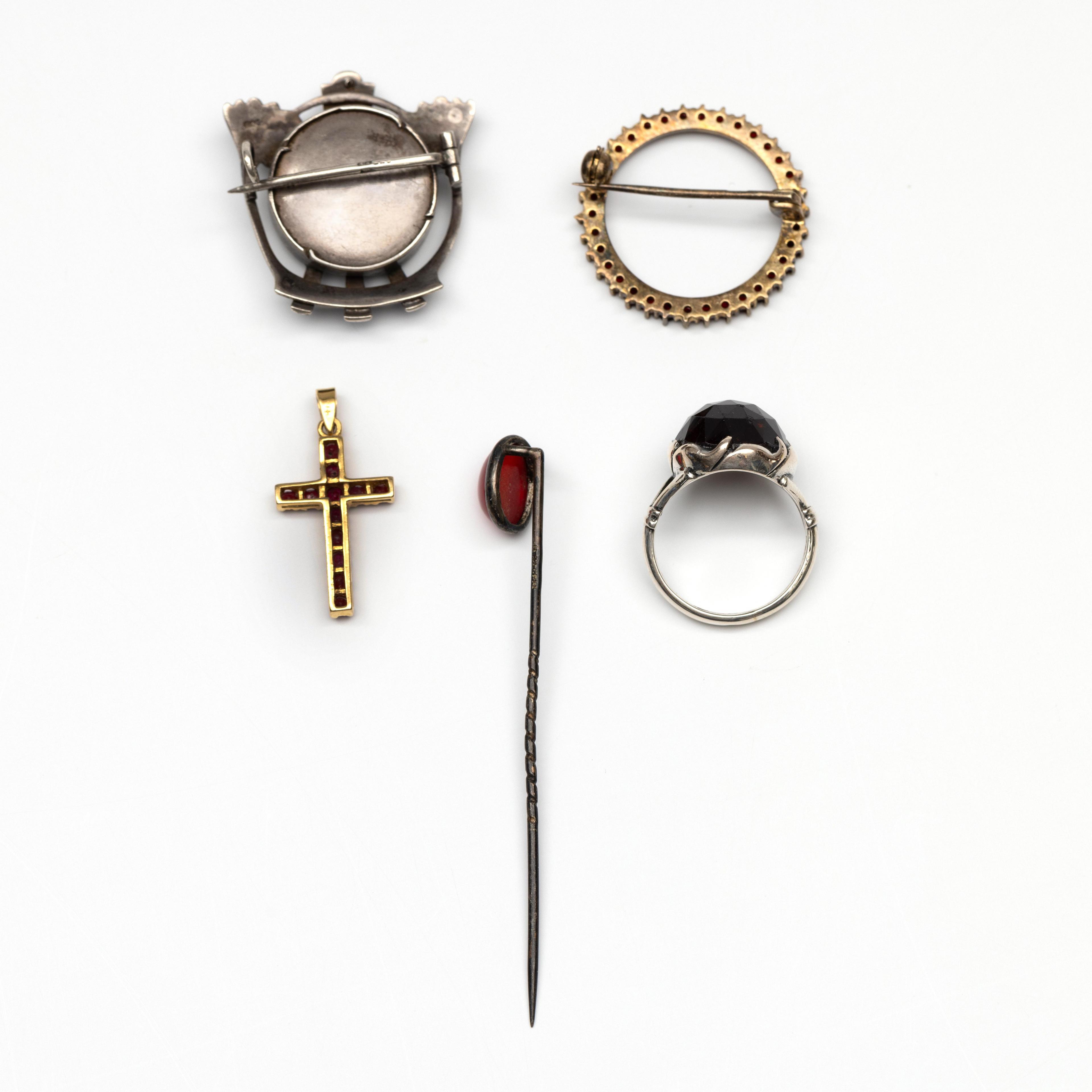 Herewith a gold cross, tombak brooch, silver pin and silver ring with garnet.