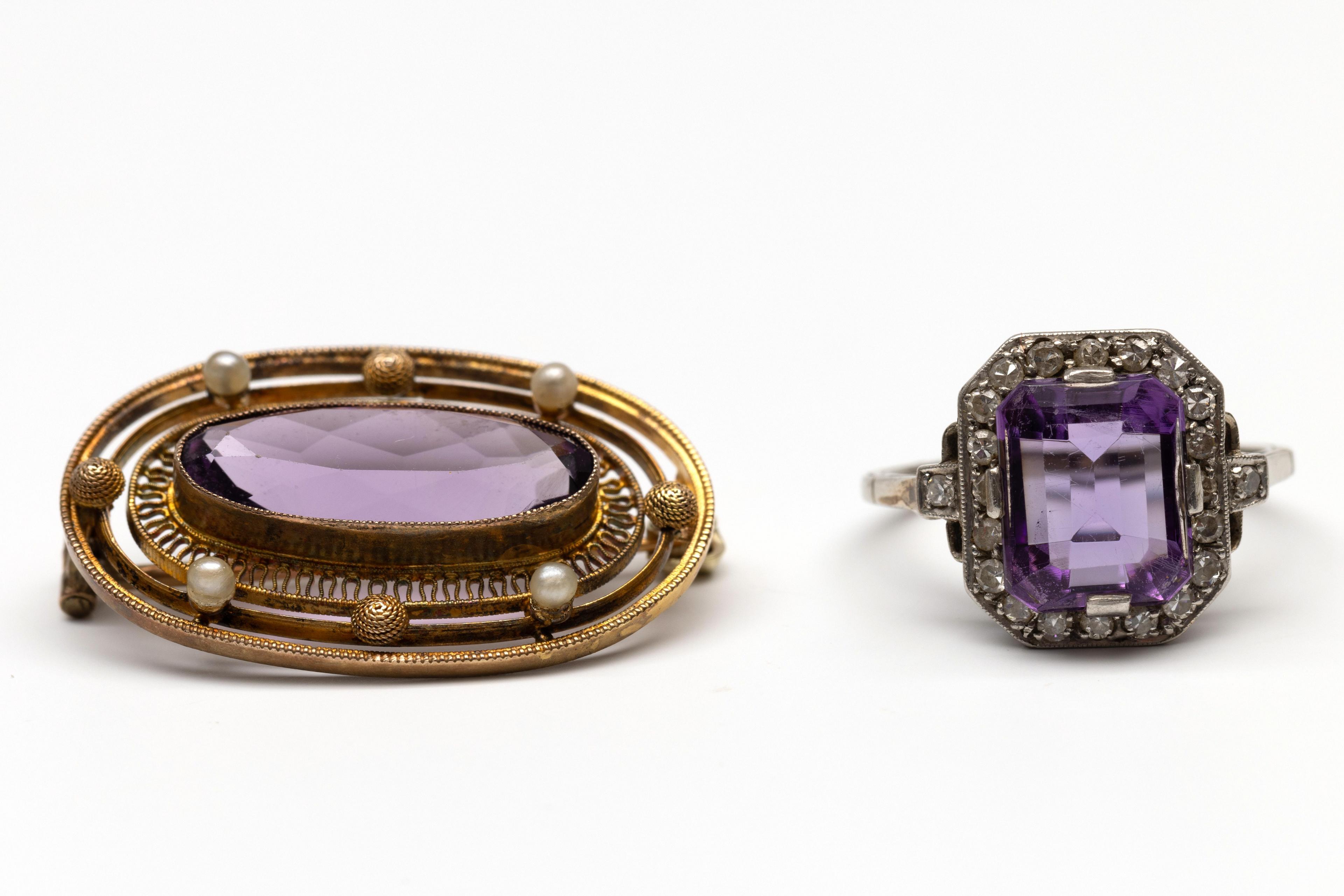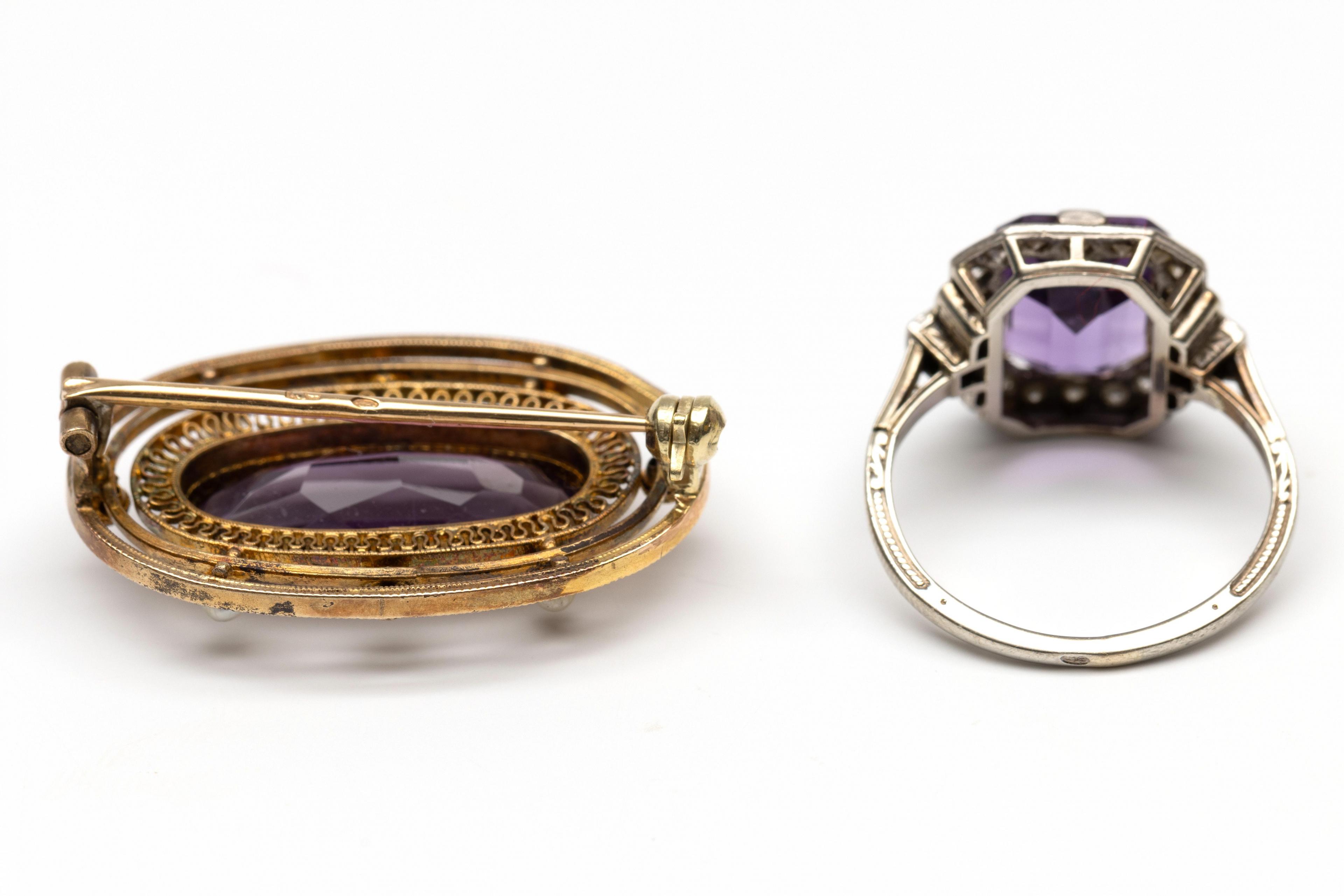 Centraal bezet met een emerald geslepen amethist in een entourage van kleine achtkant geslepen diamant. Hierbij een 14 kt. gouden ovale opengewerkte broche bezet met een ovale gefacetteerde amethist en kleine parels