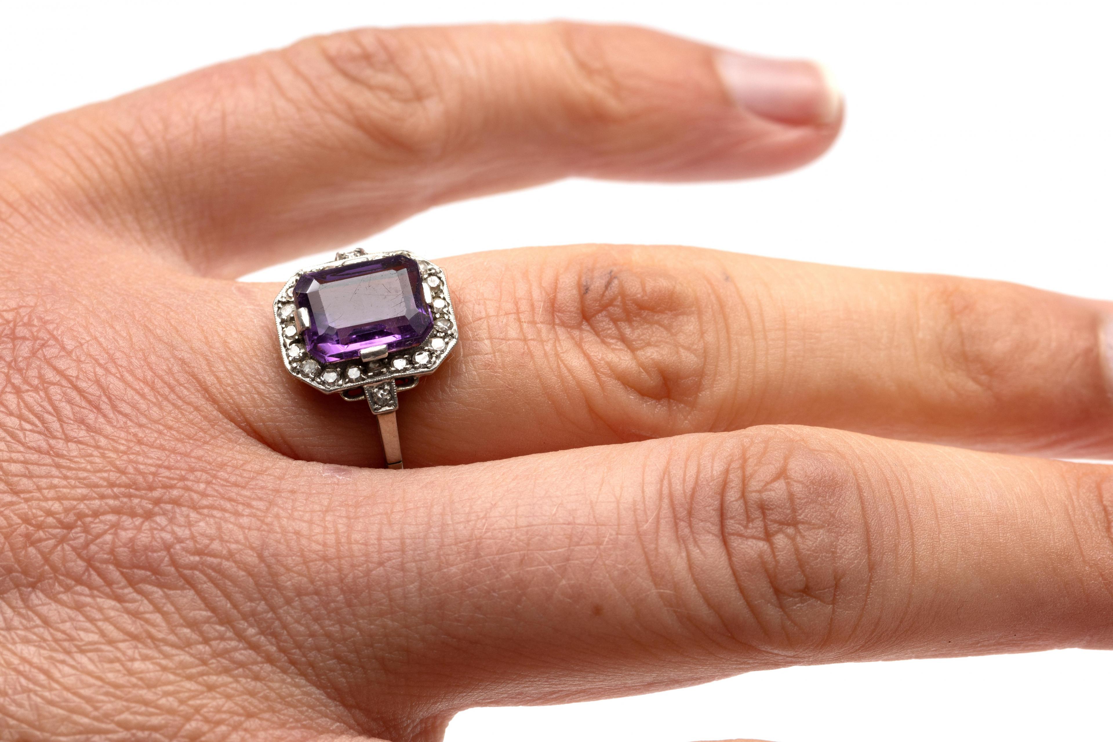 14 k. White gold ring, first half of the 20th century. Centrally set with an emerald-cut amethyst surrounded by small single-cut diamonds. Herewith an oval openwork brooch set with an oval faceted amethyst and small pearls.